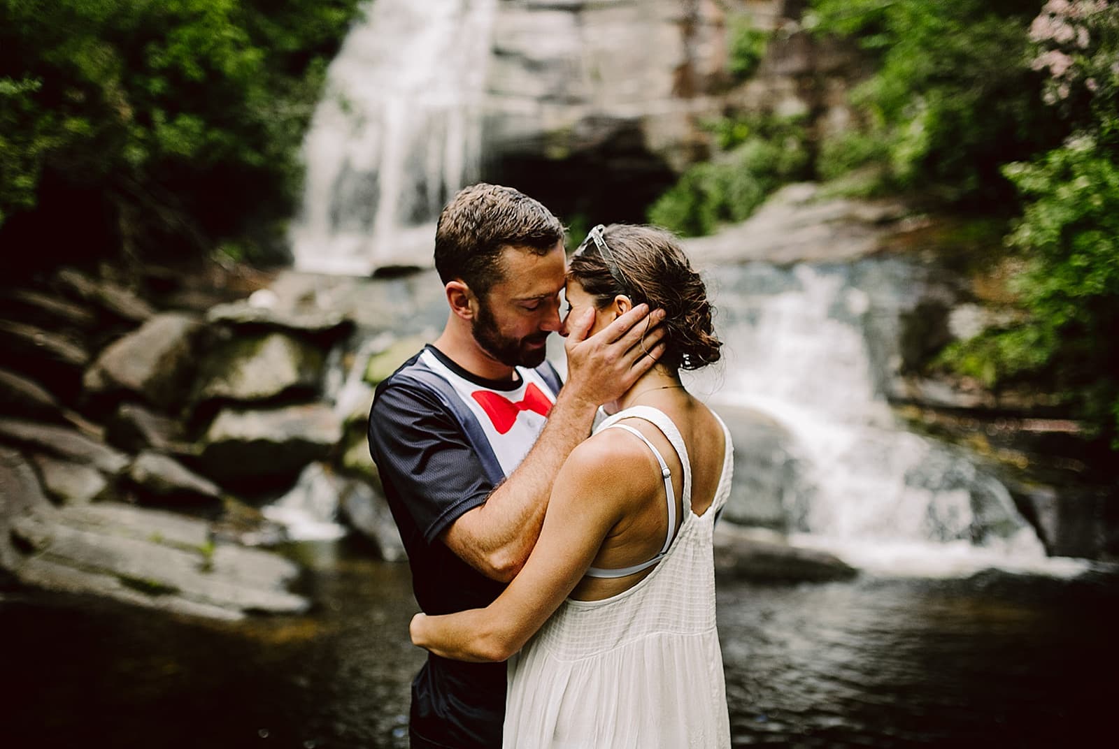 After lunch, they trekked down the back of the mountain to a gorgeous 50-foot waterfall with a pool at the bottom. They wasted no time in stripping off their hiking clothes and hopping right into the icy mountain stream. They lounged in the sun on the rocks and reveled in their new marriage. It was the absolute perfect way to end this all-day Asheville elopement.