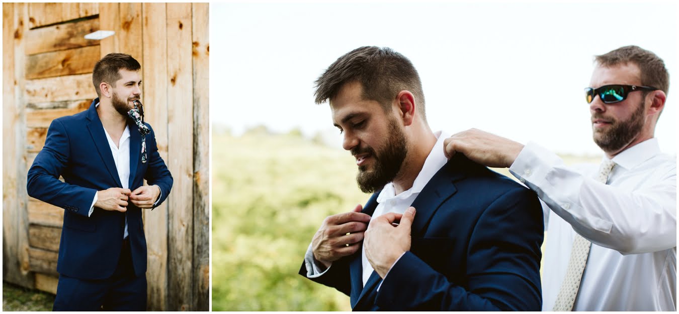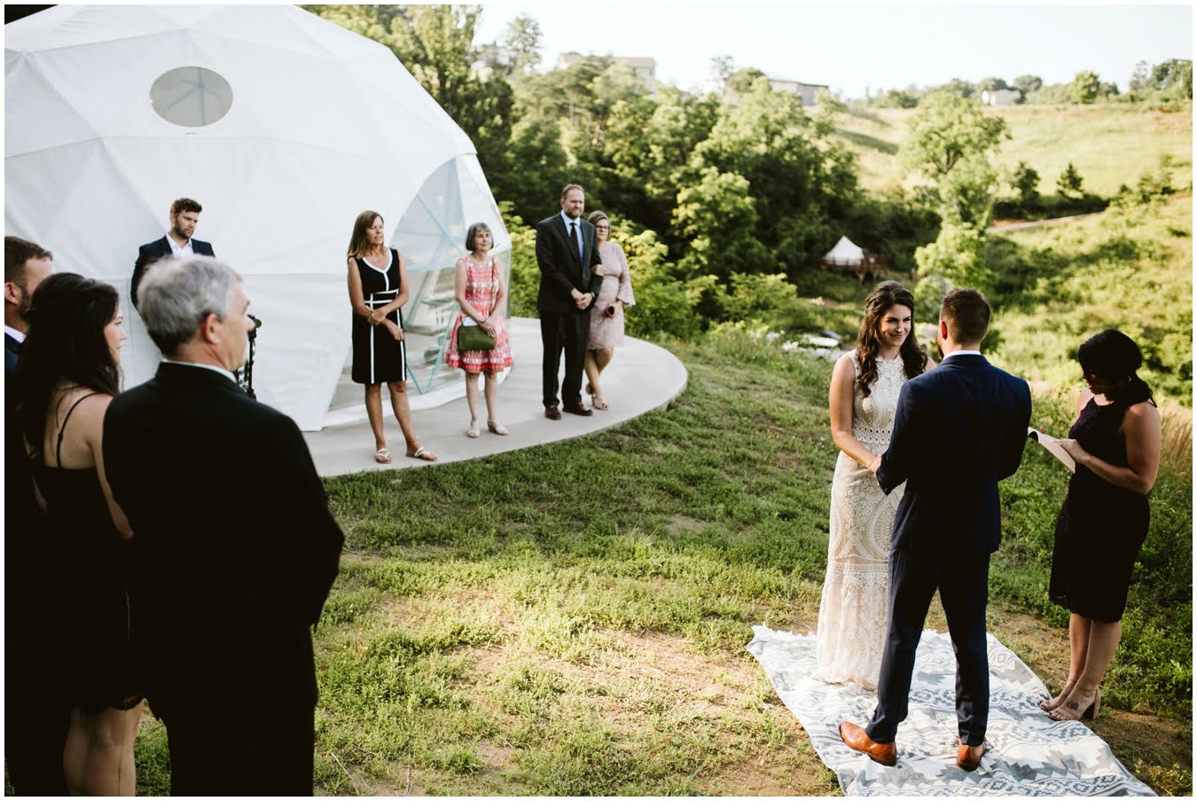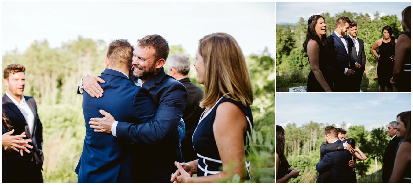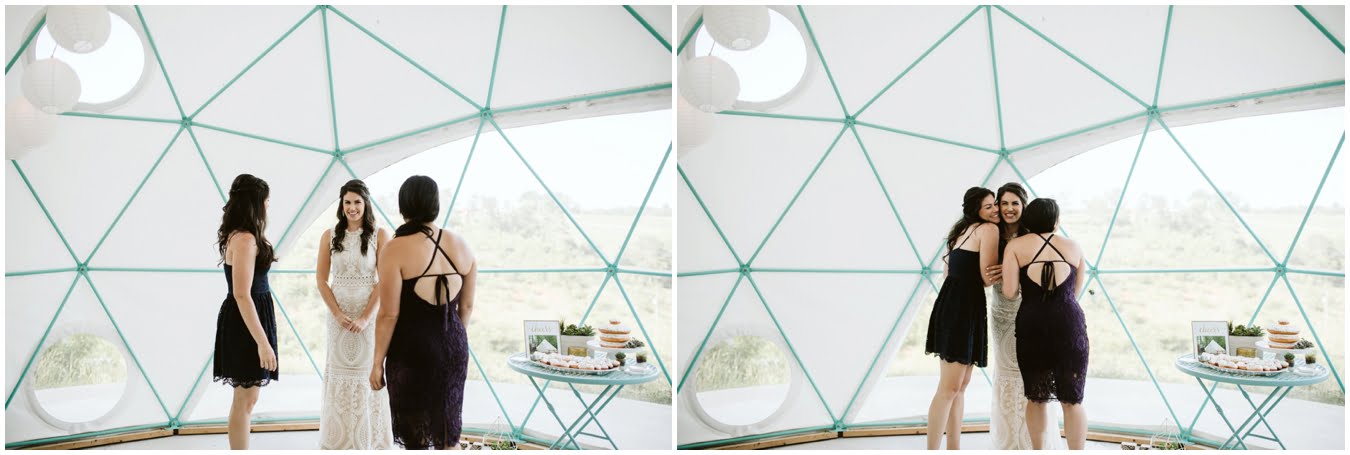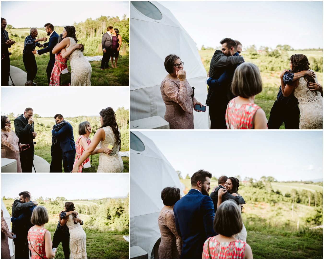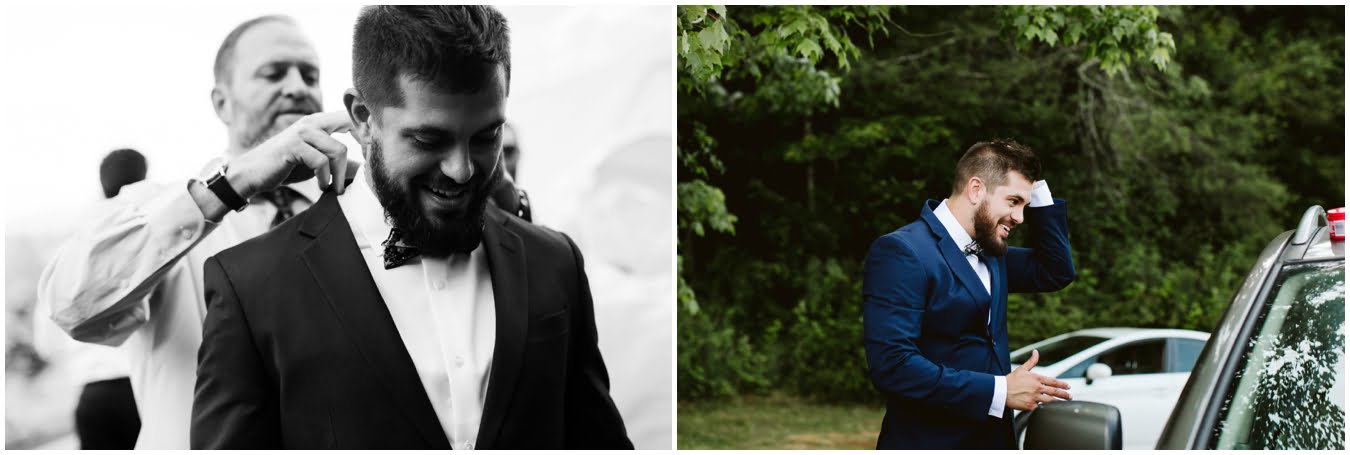 I arrived at Asheville Glamping for their sweet intimate wedding and was immediately greeted by hugs and smiles, even though they were right in the middle of re-arranging everything. They had some issues with the original site for the ceremony, and when I got there all their friends and family were right in the middle of flipping the dome they were staying in to make it the perfect celebration location! It was amazing to watch everyone come together, decorating the dome, setting up the custom donut cake from Suarez Bakery (CHECK IT OUT), and picking out the perfect outdoor spot for their ceremony. Krause ending up throwing on his wedding clothes just outside the dome, using the car window as a mirror to do his hair, and everyone STILL was all smiles!