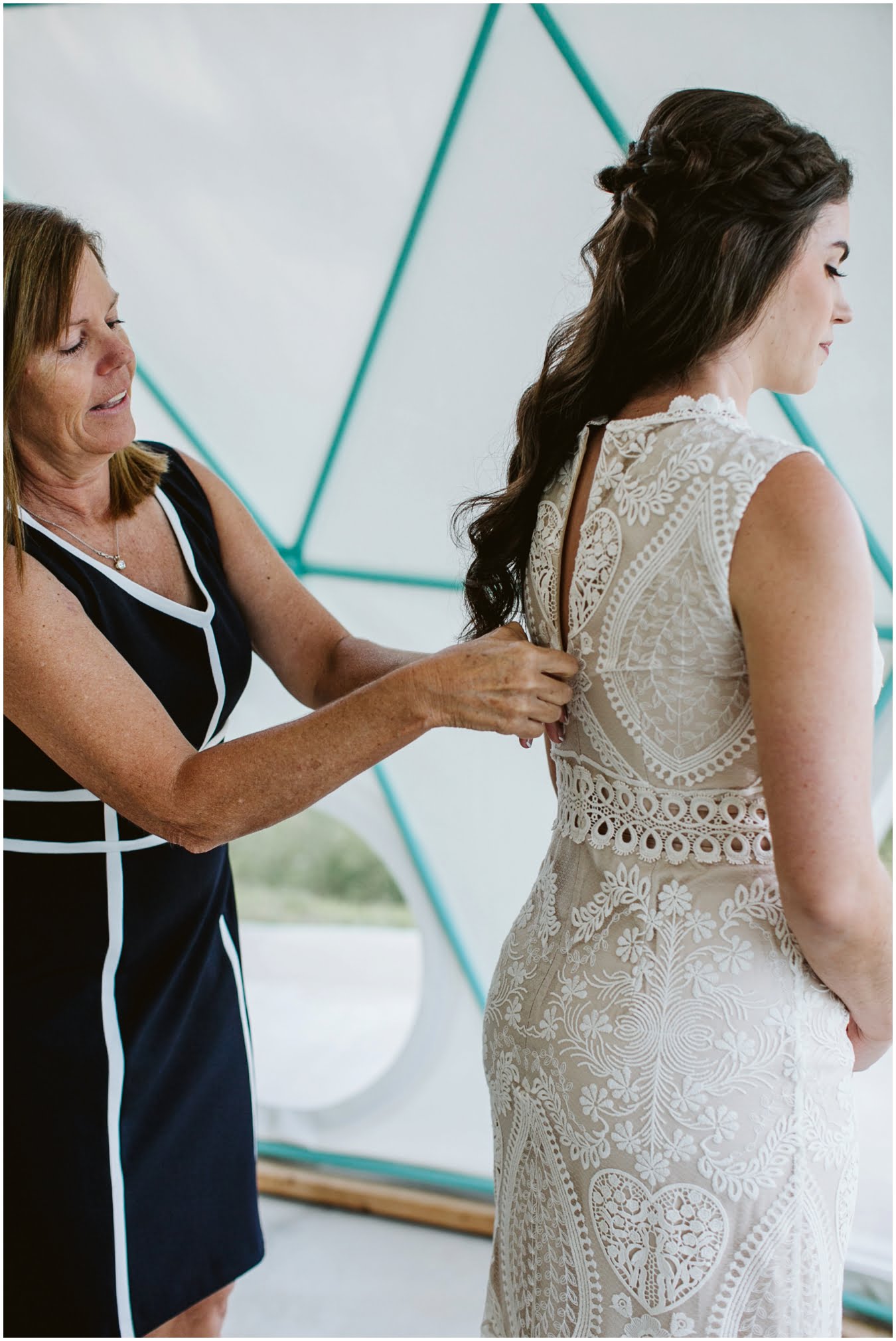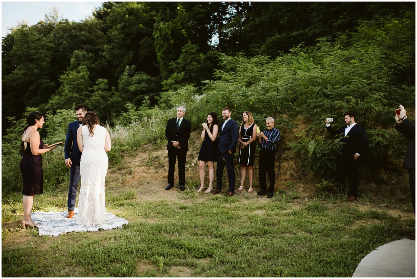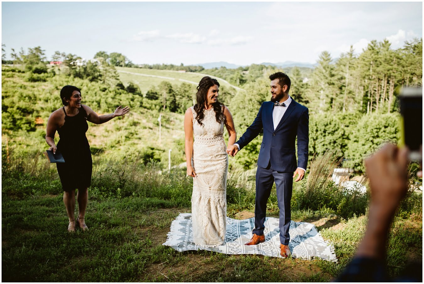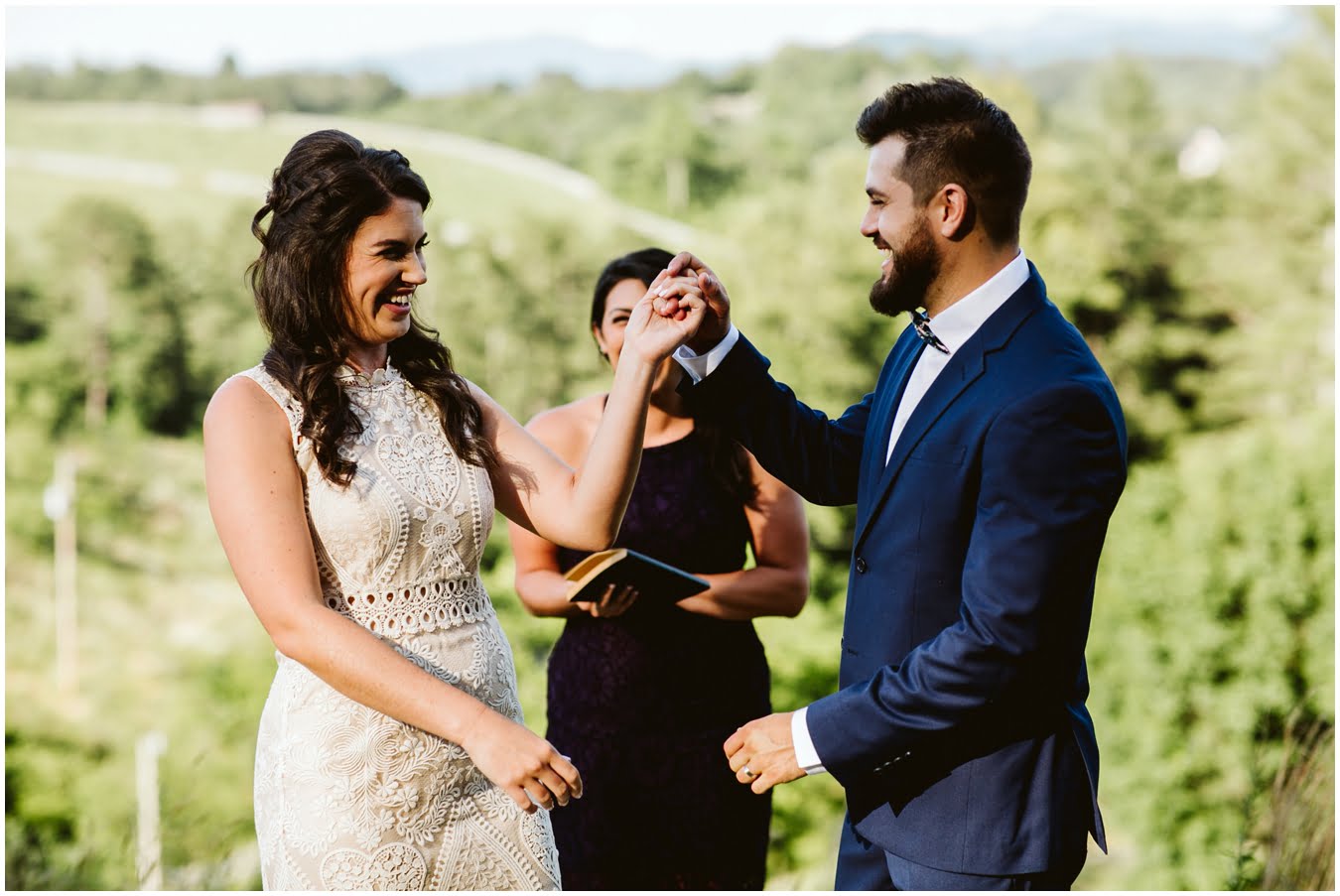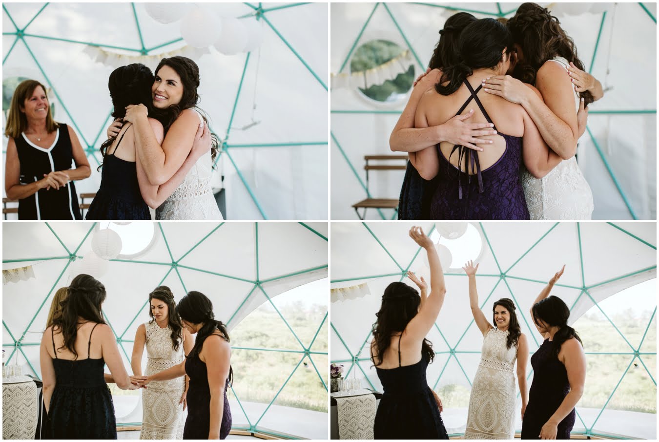 I arrived at Asheville Glamping for their sweet intimate wedding and was immediately greeted by hugs and smiles, even though they were right in the middle of re-arranging everything. They had some issues with the original site for the ceremony, and when I got there all their friends and family were right in the middle of flipping the dome they were staying in to make it the perfect celebration location! It was amazing to watch everyone come together, decorating the dome, setting up the custom donut cake from Suarez Bakery (CHECK IT OUT), and picking out the perfect outdoor spot for their ceremony. Krause ending up throwing on his wedding clothes just outside the dome, using the car window as a mirror to do his hair, and everyone STILL was all smiles!