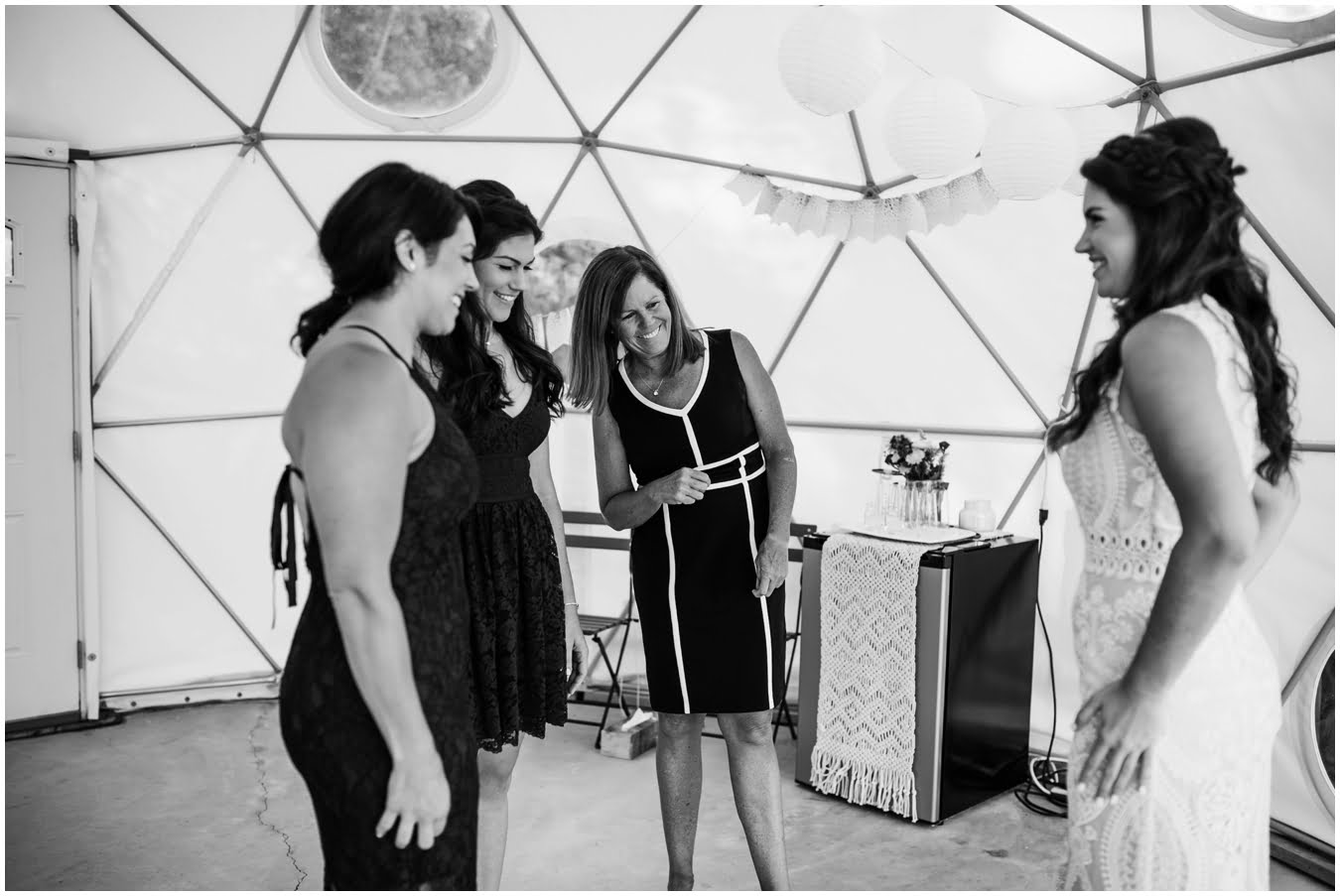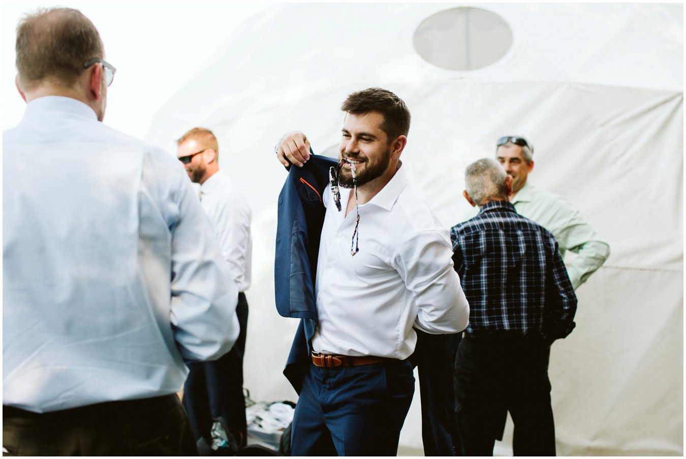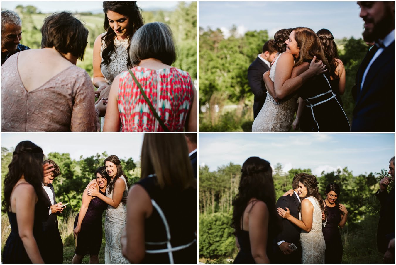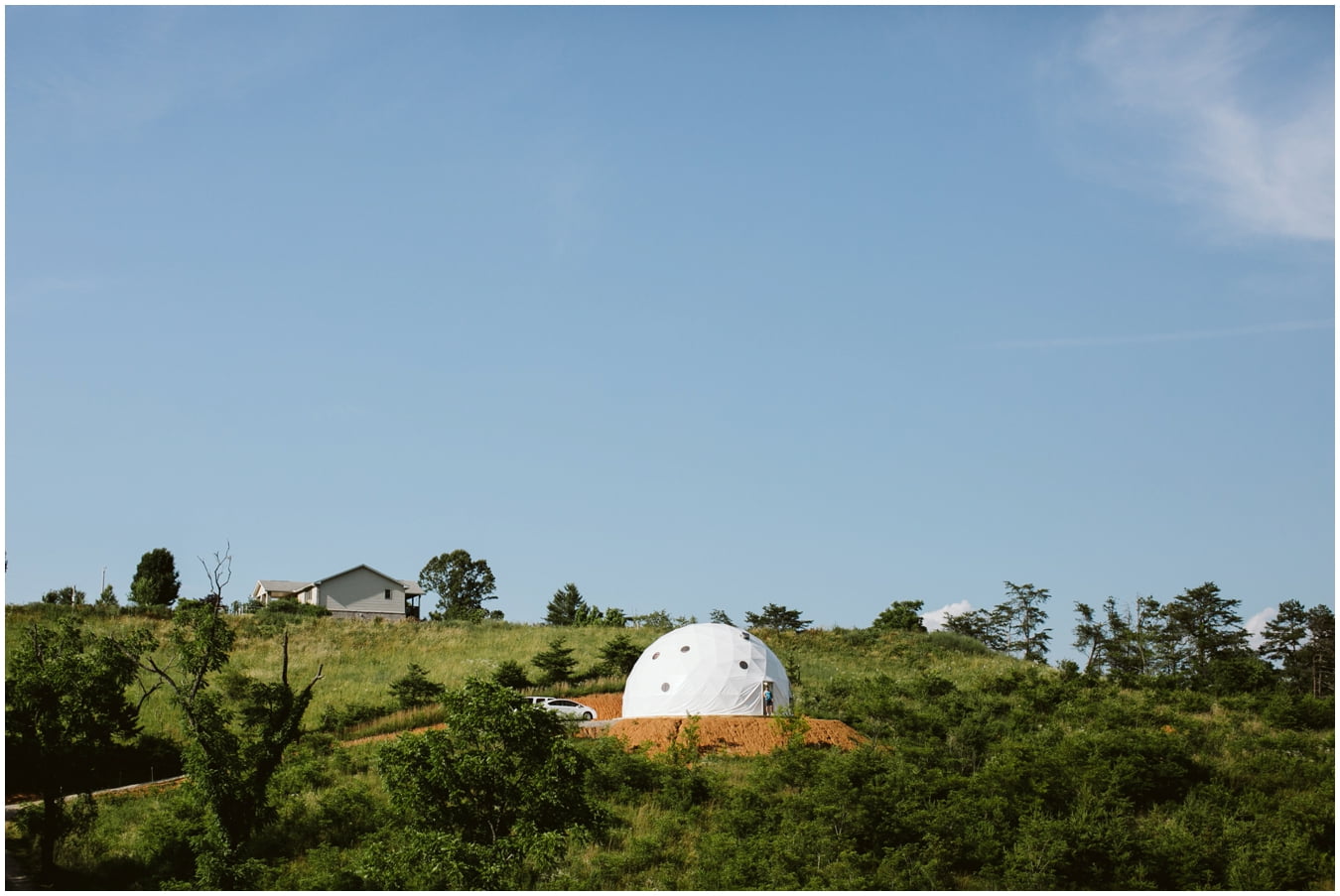 I arrived at Asheville Glamping for their sweet intimate wedding and was immediately greeted by hugs and smiles, even though they were right in the middle of re-arranging everything. They had some issues with the original site for the ceremony, and when I got there all their friends and family were right in the middle of flipping the dome they were staying in to make it the perfect celebration location! It was amazing to watch everyone come together, decorating the dome, setting up the custom donut cake from Suarez Bakery (CHECK IT OUT), and picking out the perfect outdoor spot for their ceremony. Krause ending up throwing on his wedding clothes just outside the dome, using the car window as a mirror to do his hair, and everyone STILL was all smiles!