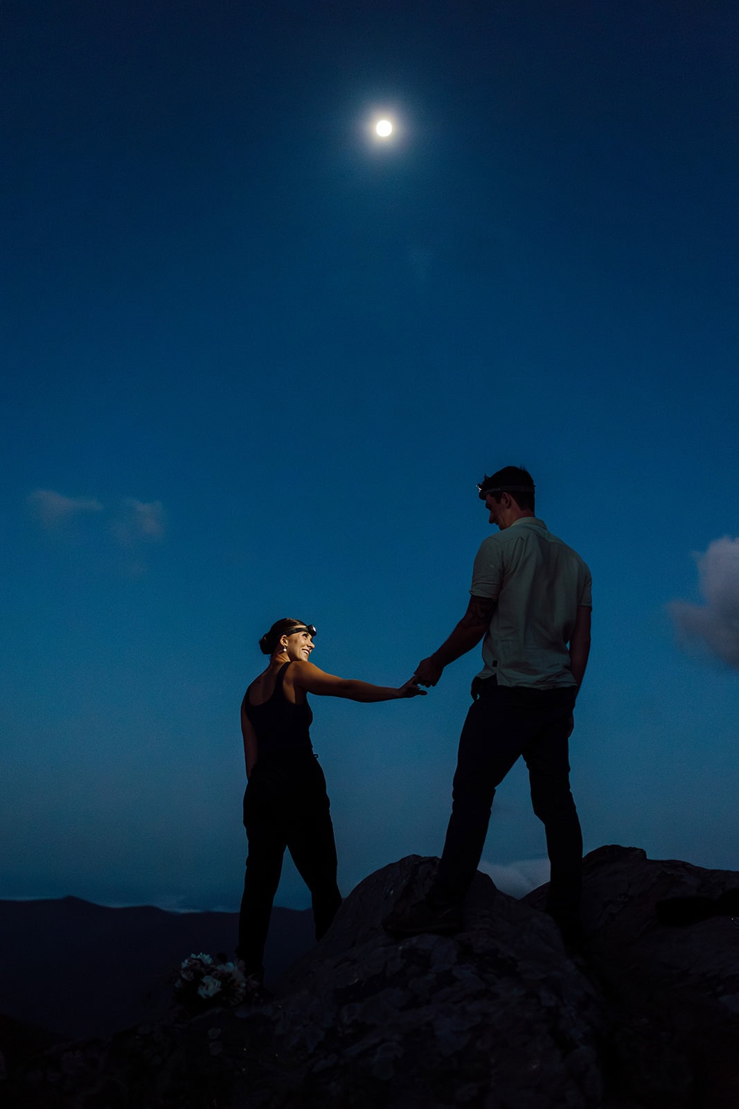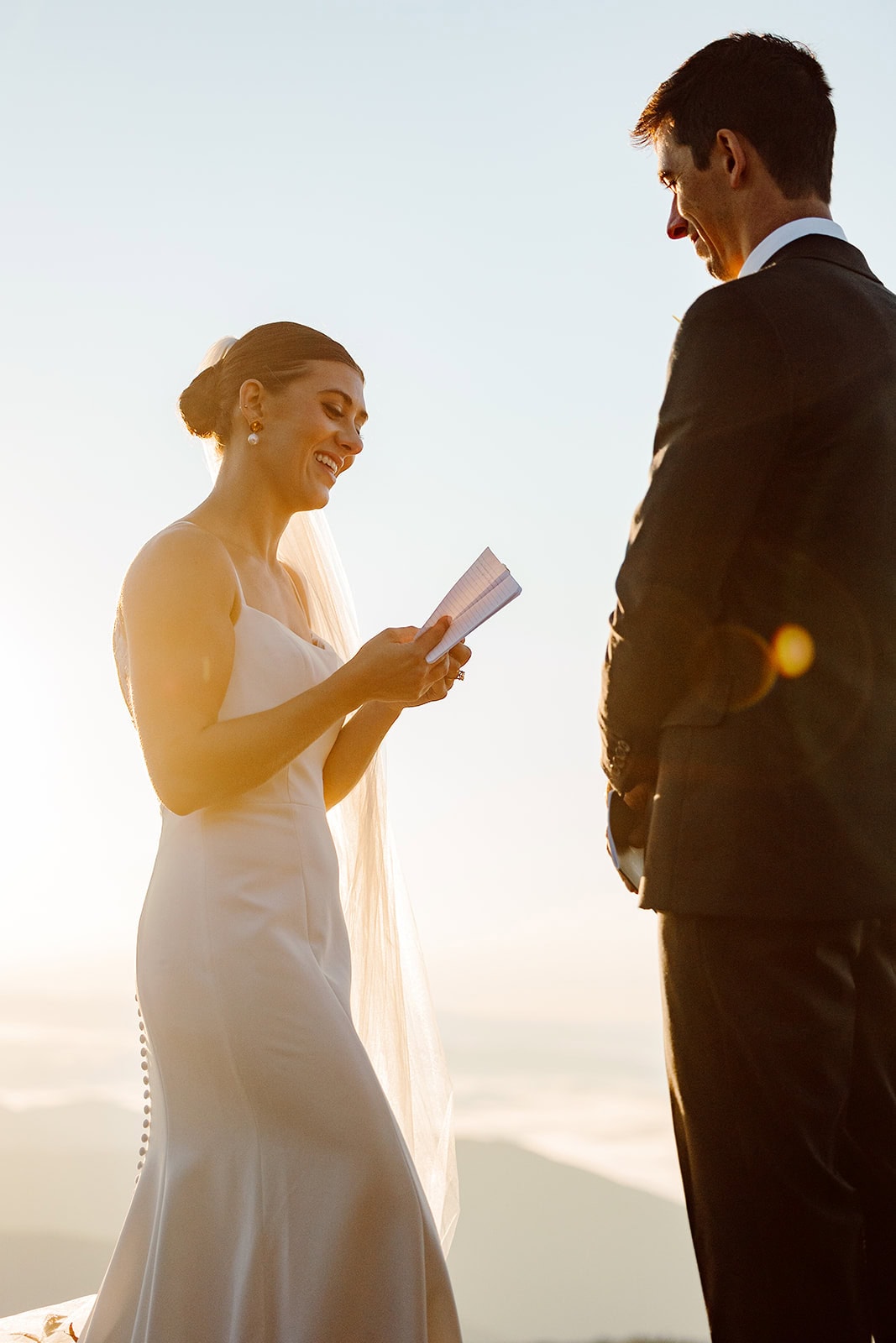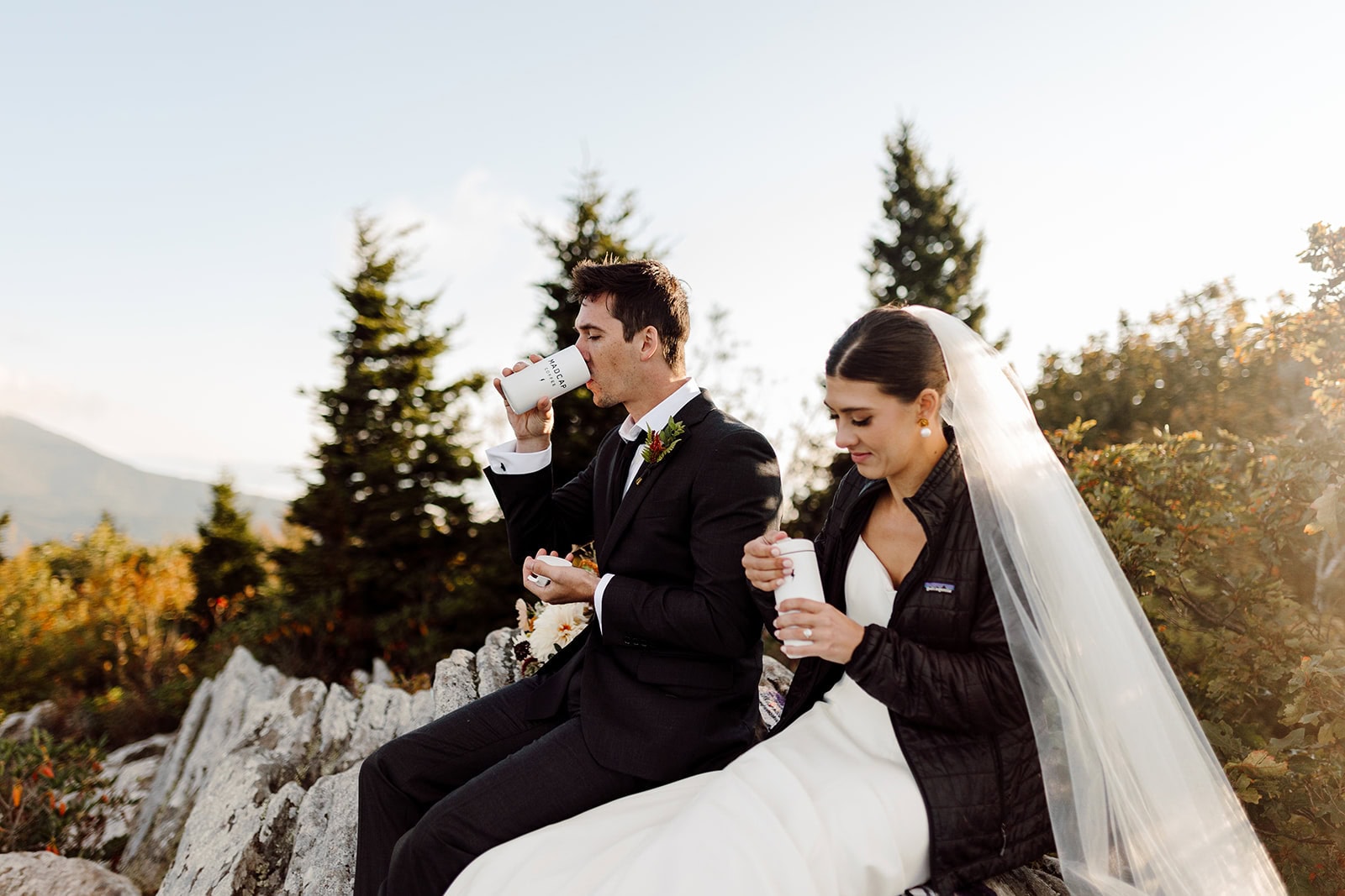 At the summit, they slipped into their wedding clothes as the first light painted the sky. With a simple vow exchange at sunrise, they promised each other forever in the glow of the morning mountains. After their vows, they enjoyed a coffee and breakfast picnic—taking time to soak in the view and the meaning of the moment before the rest of the day unfolded.