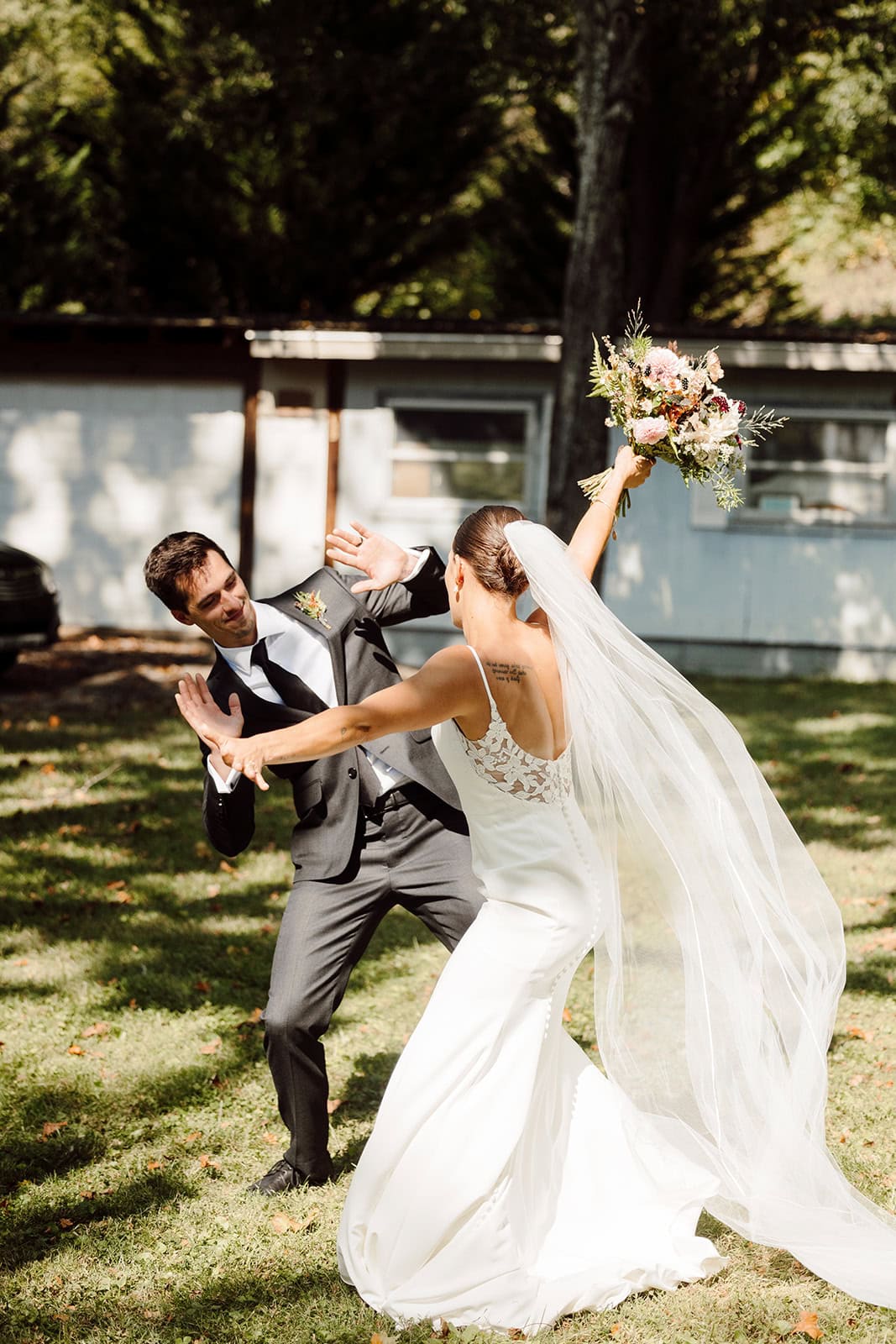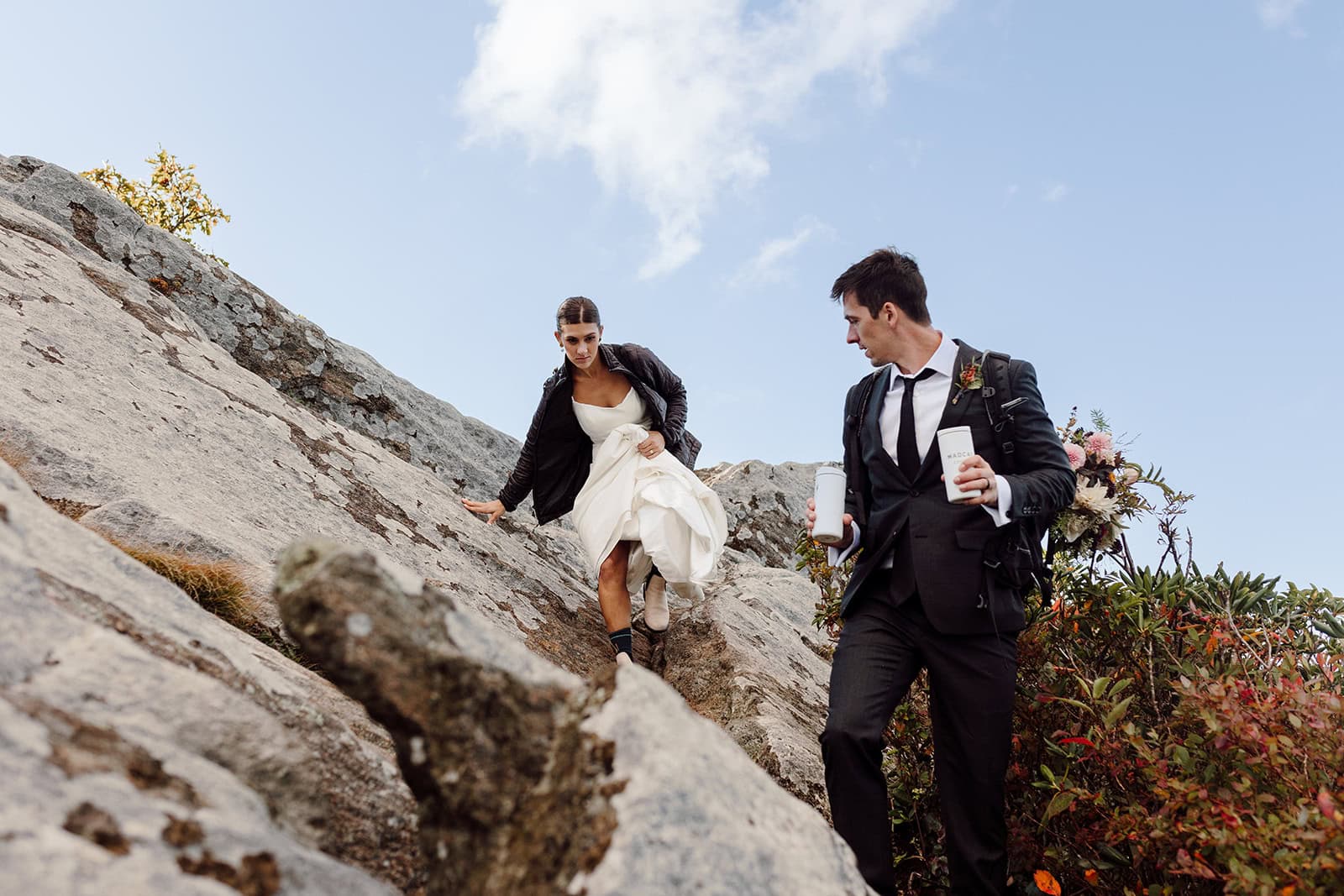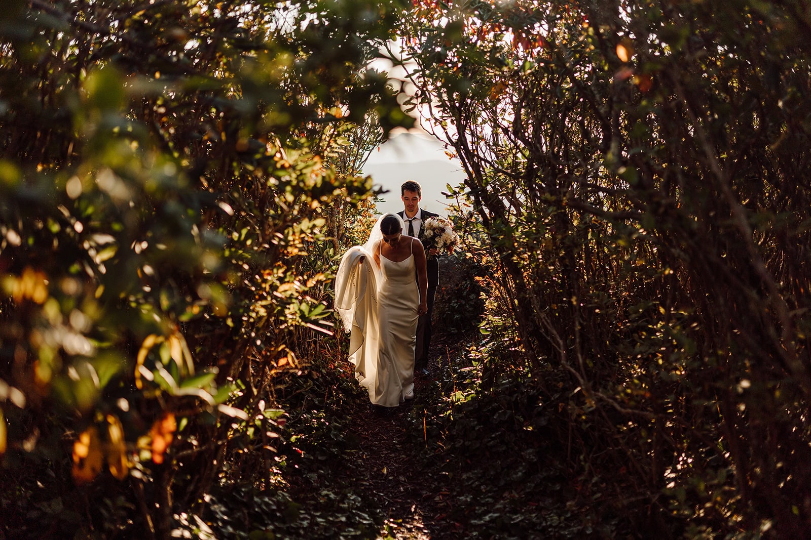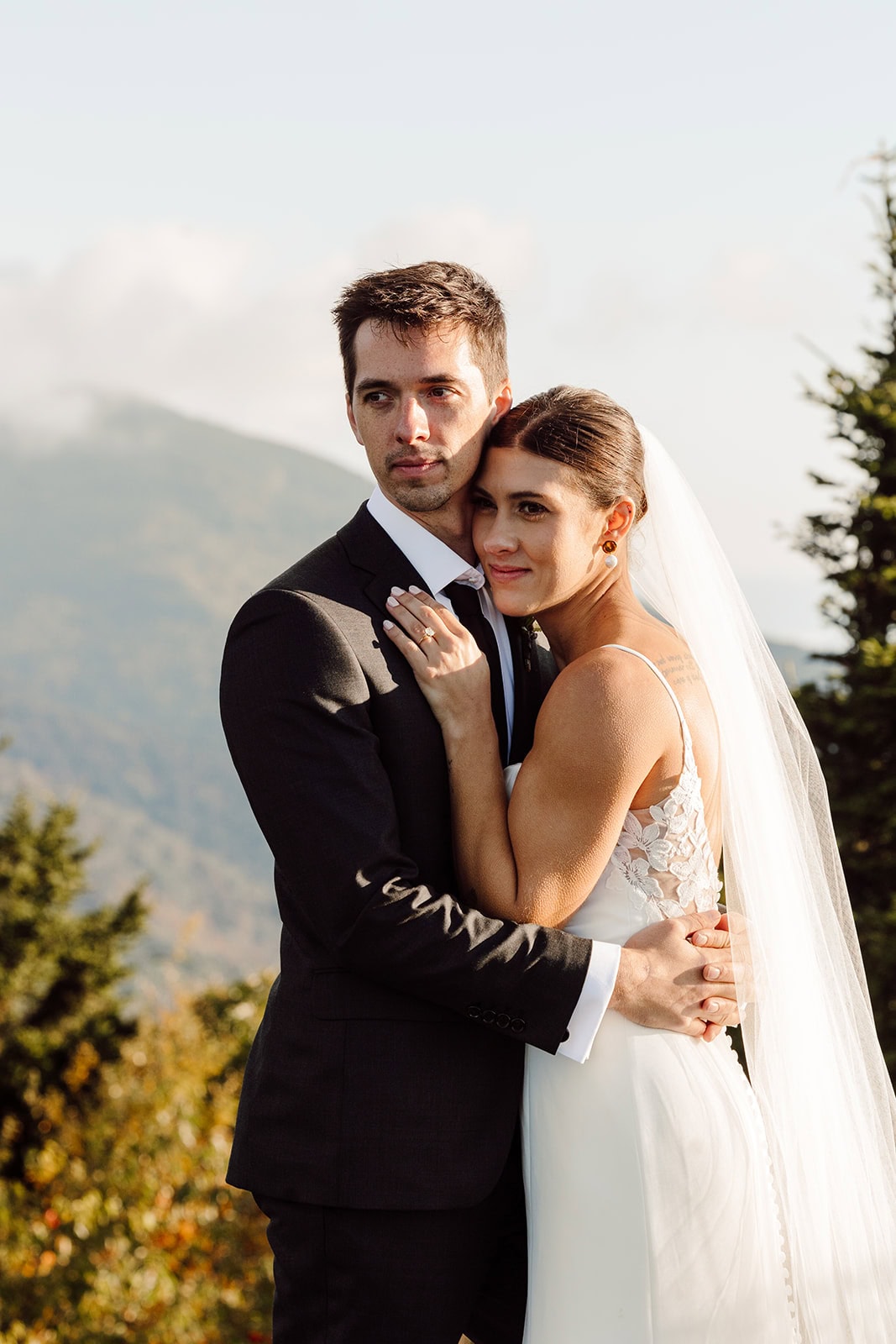 Bailey and Daniel’s wedding day wasn’t about big ballrooms or timelines packed to the minute. It was about sharing quiet sunrise moments on a mountaintop, exploring waterfalls together, and celebrating with their closest people in the heart of Western North Carolina. Their sunrise-to-sunset adventure elopement was everything we love about intimate weddings—genuine, joyful, and completely their own.