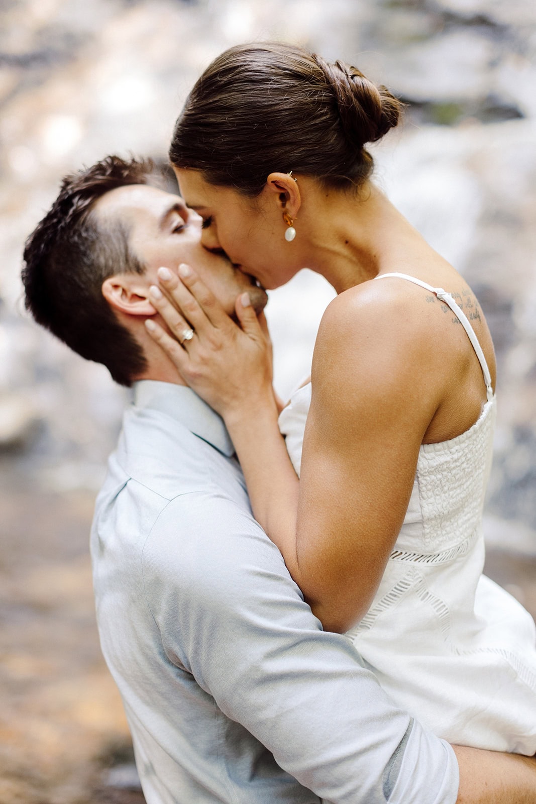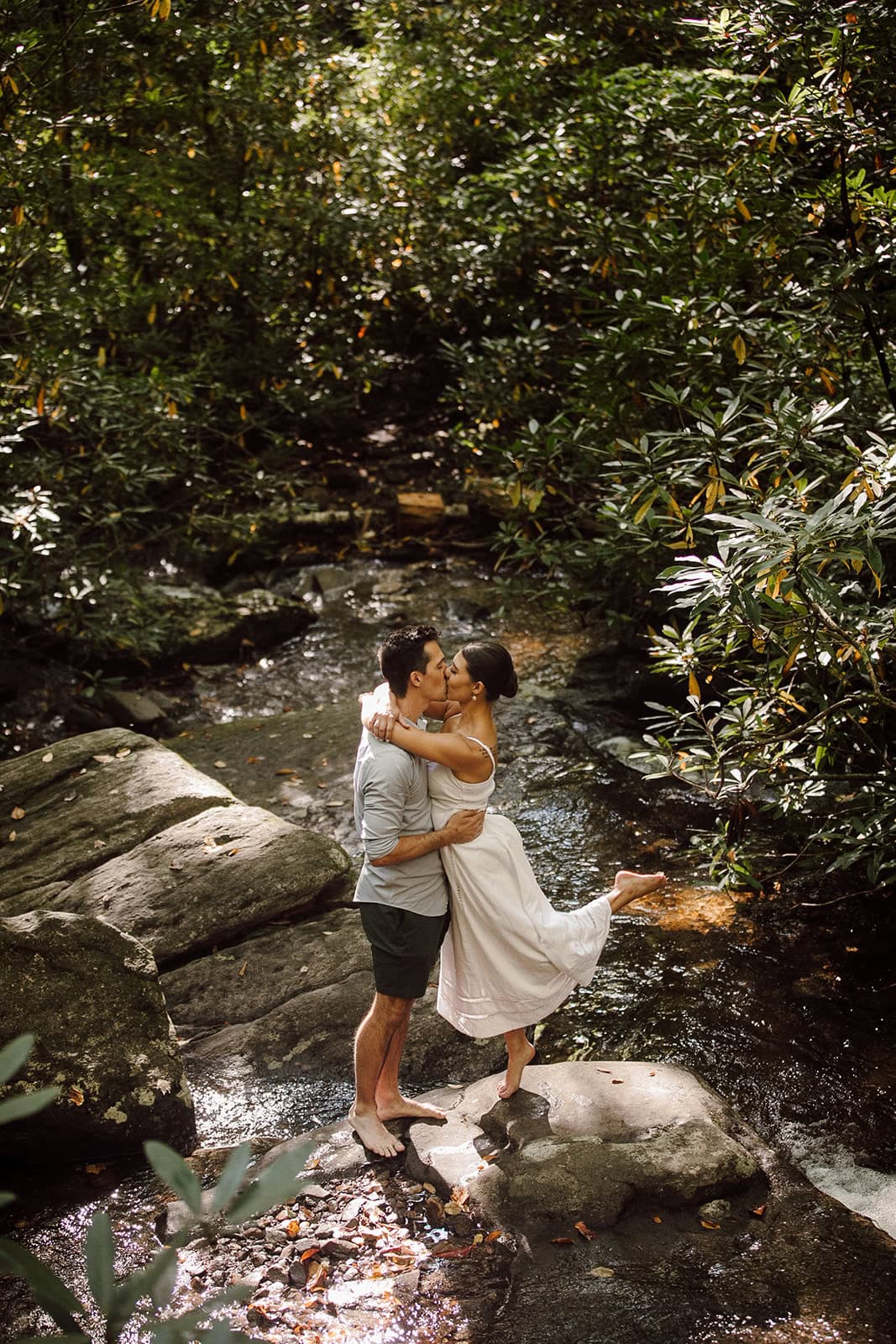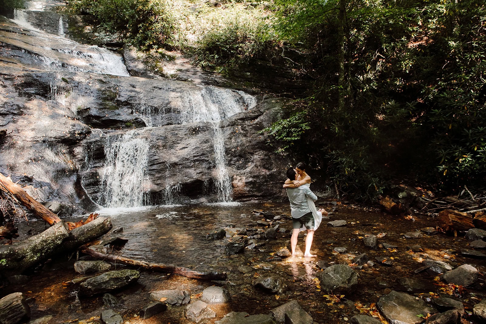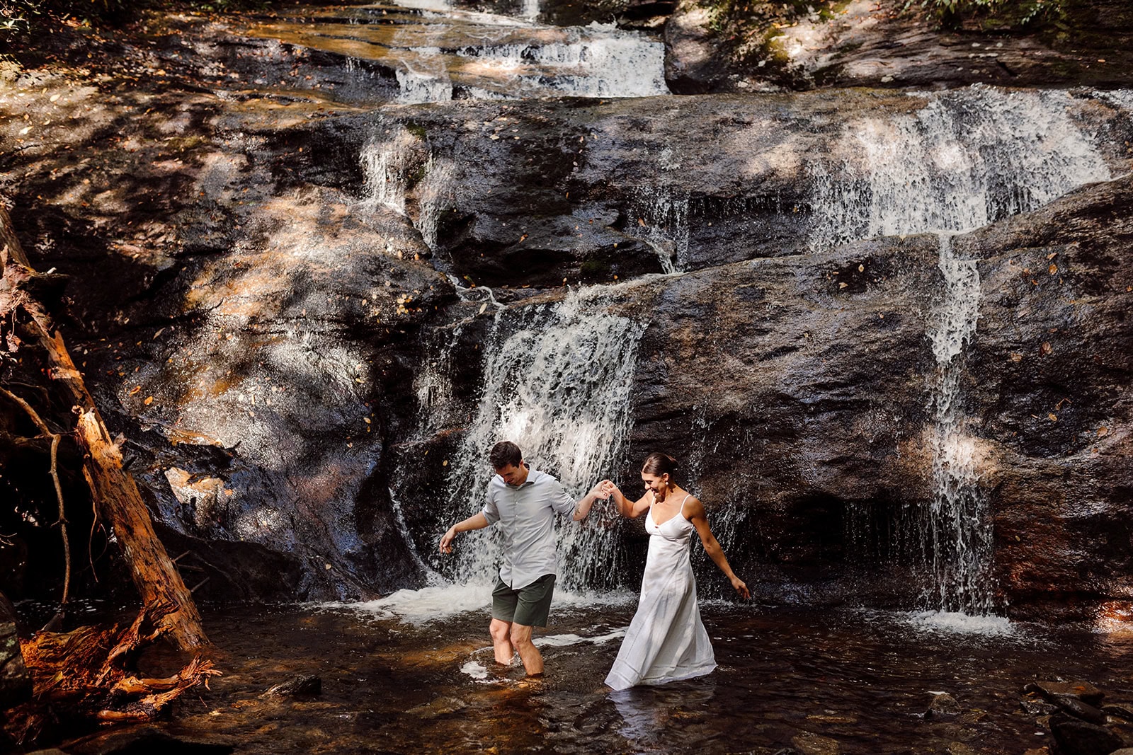 After the hike back down, we headed to nearby Setrock Falls. This quieter waterfall is a dream location for adventurous couples. Bailey and Daniel waded into the cool water, explored the rocks, and created some absolutely magical portraits together. These moments of connection and playfulness are what make adventure elopements so personal and memorable.