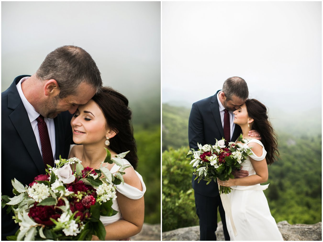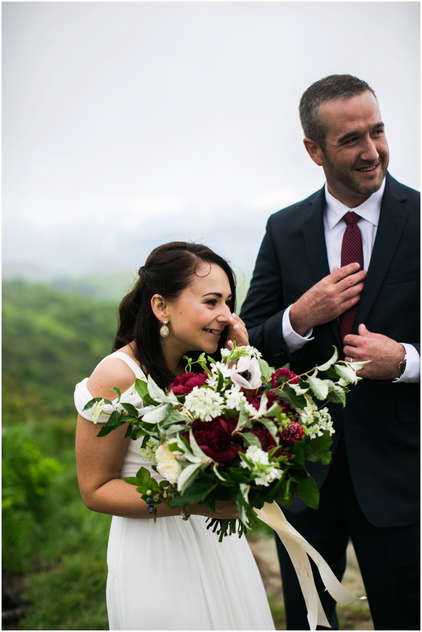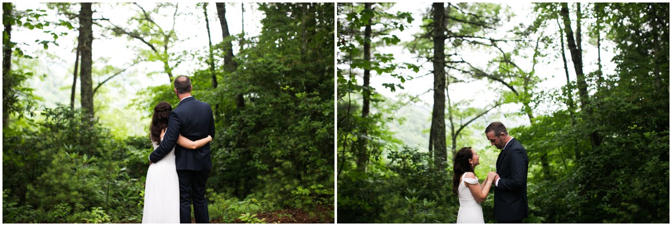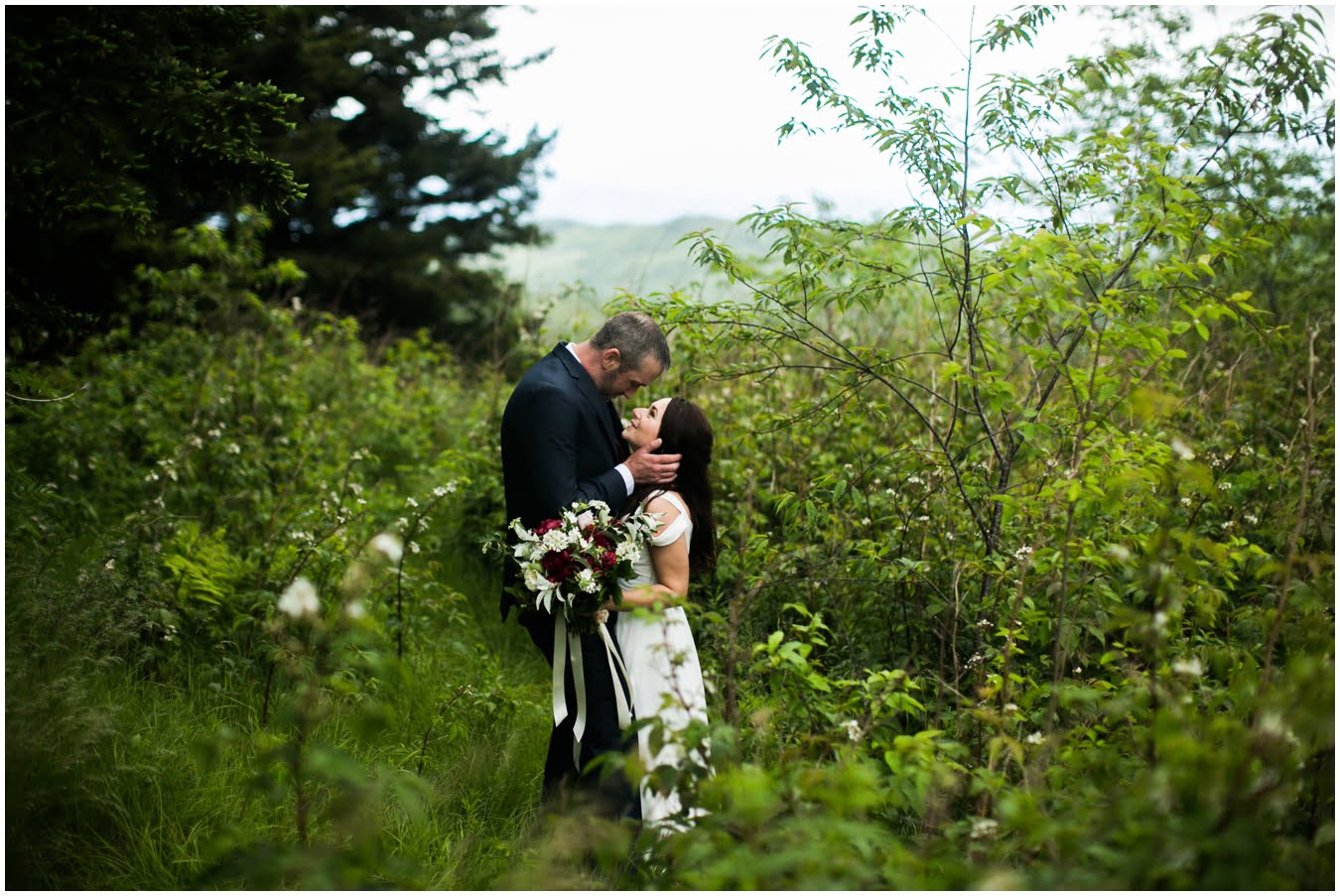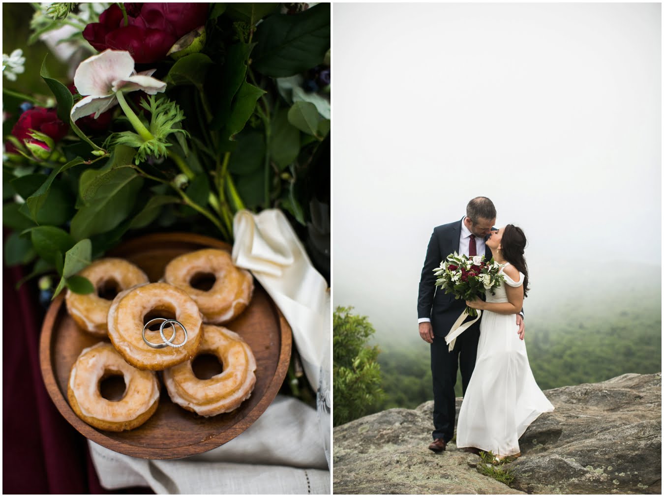 It was raining lightly when I arrived at Tori and Jon’s cabin to capture their getting ready photos. Jenna Wilson had styled Tori’s hair to perfection and Joanna Ferree of Powder Me Pretty was just finishing her makeup. The bride and groom dressed separately and then met each other in the garden for their sweet first look as the rain sprinkled around them. We then all headed up the mountain to Black Balsam Knob, where black clouds and fog threatened all afternoon, but we didn’t get a single drop of rain! Just gorgeous mist that turned the summit into something reminiscent of Scotland. After saying their vows, Tori and Jon had a first dance, all to themselves on the mountaintop, before popping their champagne and enjoying their doughnuts with a view! It was such a sweet, intimate day and I was so honored to have been a part of it. We spent the rest of the daylight taking portraits across the mountaintops and down in deep fir forests. As we wrapped up we got a final burst of golden sunset light and everything was literally perfect.