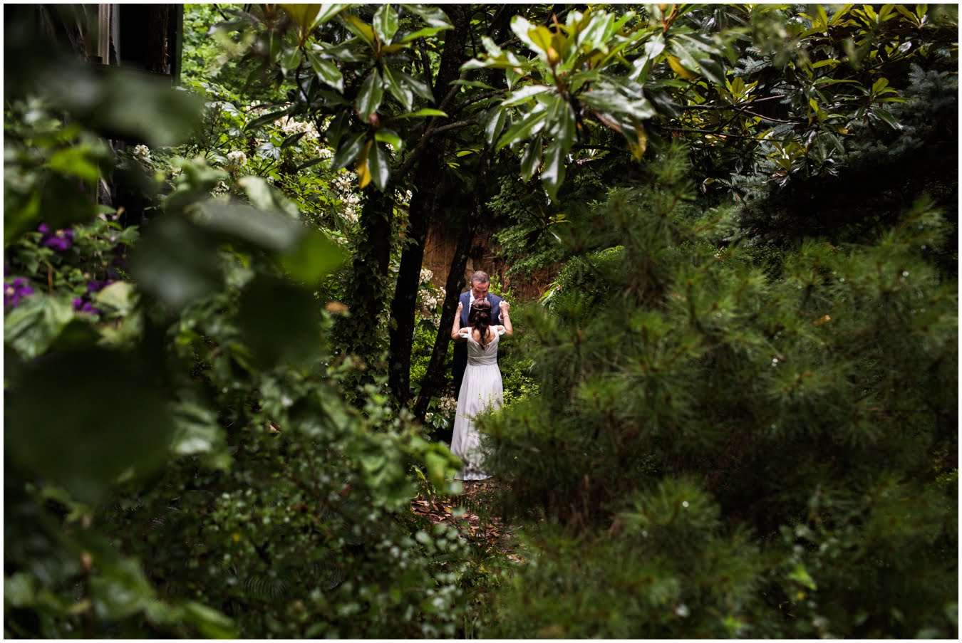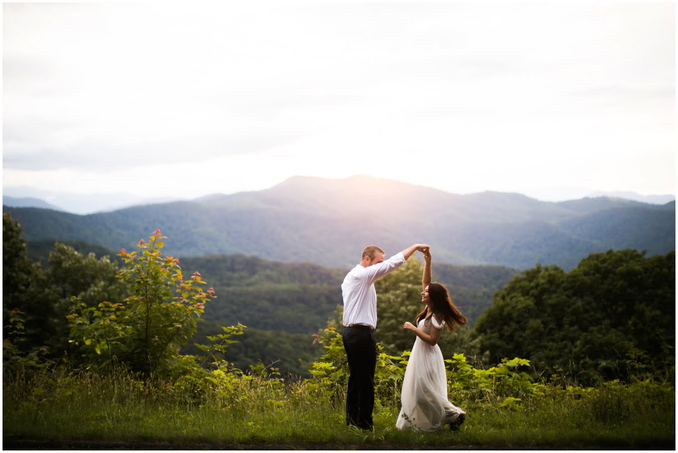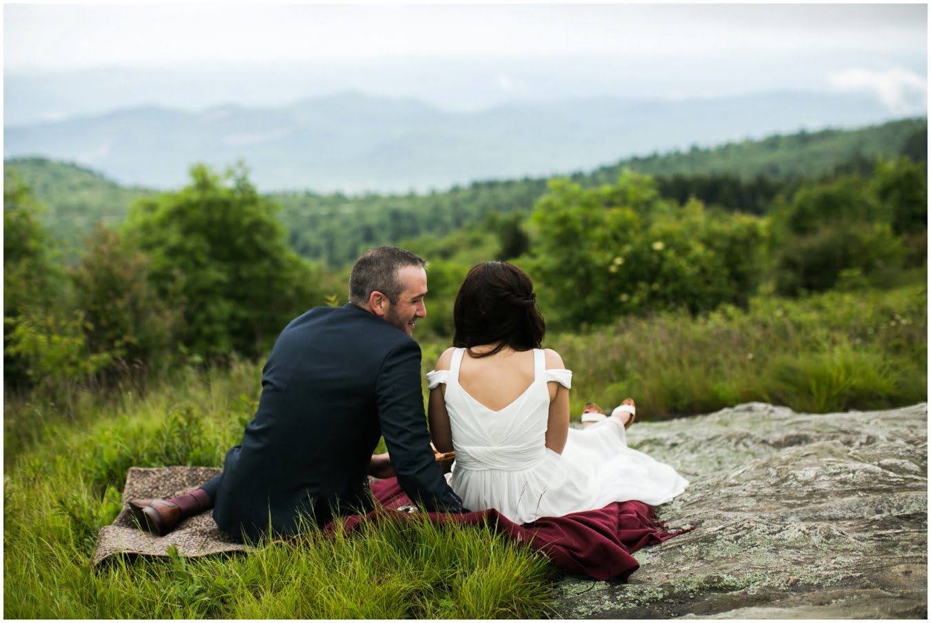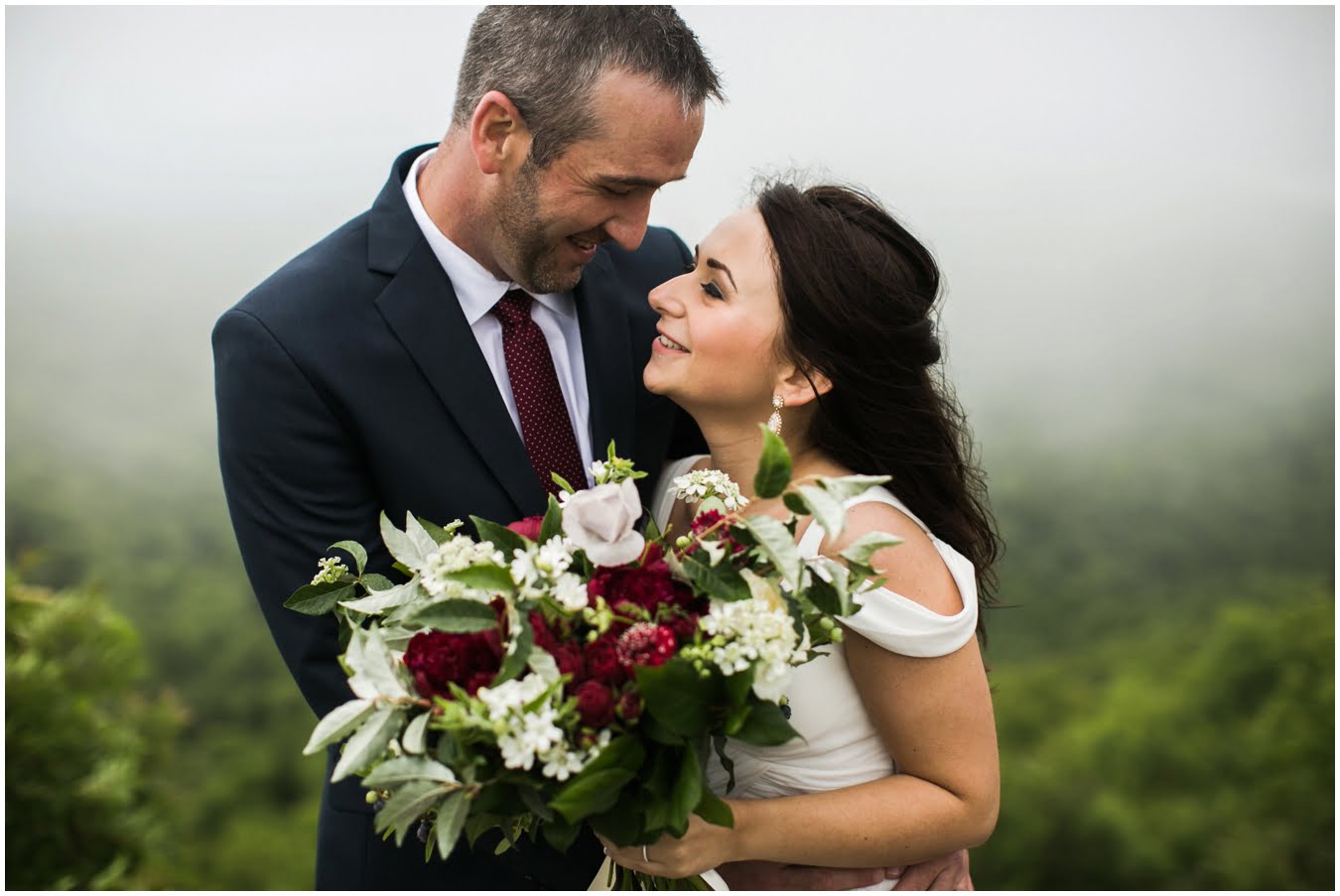 It was raining lightly when I arrived at Tori and Jon’s cabin to capture their getting ready photos. Jenna Wilson had styled Tori’s hair to perfection and Joanna Ferree of Powder Me Pretty was just finishing her makeup. The bride and groom dressed separately and then met each other in the garden for their sweet first look as the rain sprinkled around them. We then all headed up the mountain to Black Balsam Knob, where black clouds and fog threatened all afternoon, but we didn’t get a single drop of rain! Just gorgeous mist that turned the summit into something reminiscent of Scotland. After saying their vows, Tori and Jon had a first dance, all to themselves on the mountaintop, before popping their champagne and enjoying their doughnuts with a view! It was such a sweet, intimate day and I was so honored to have been a part of it. We spent the rest of the daylight taking portraits across the mountaintops and down in deep fir forests. As we wrapped up we got a final burst of golden sunset light and everything was literally perfect.