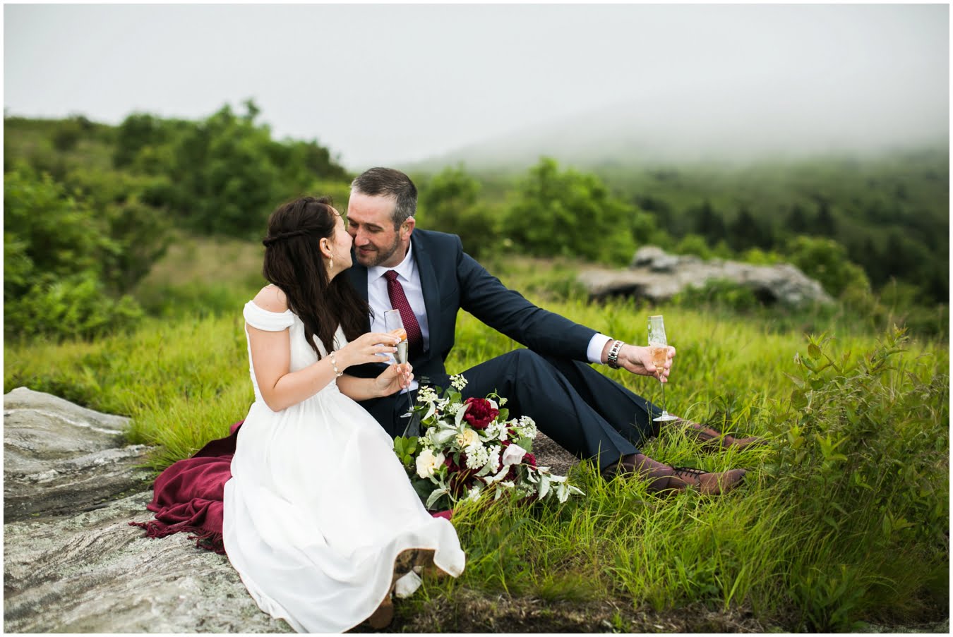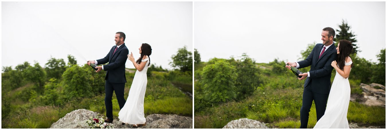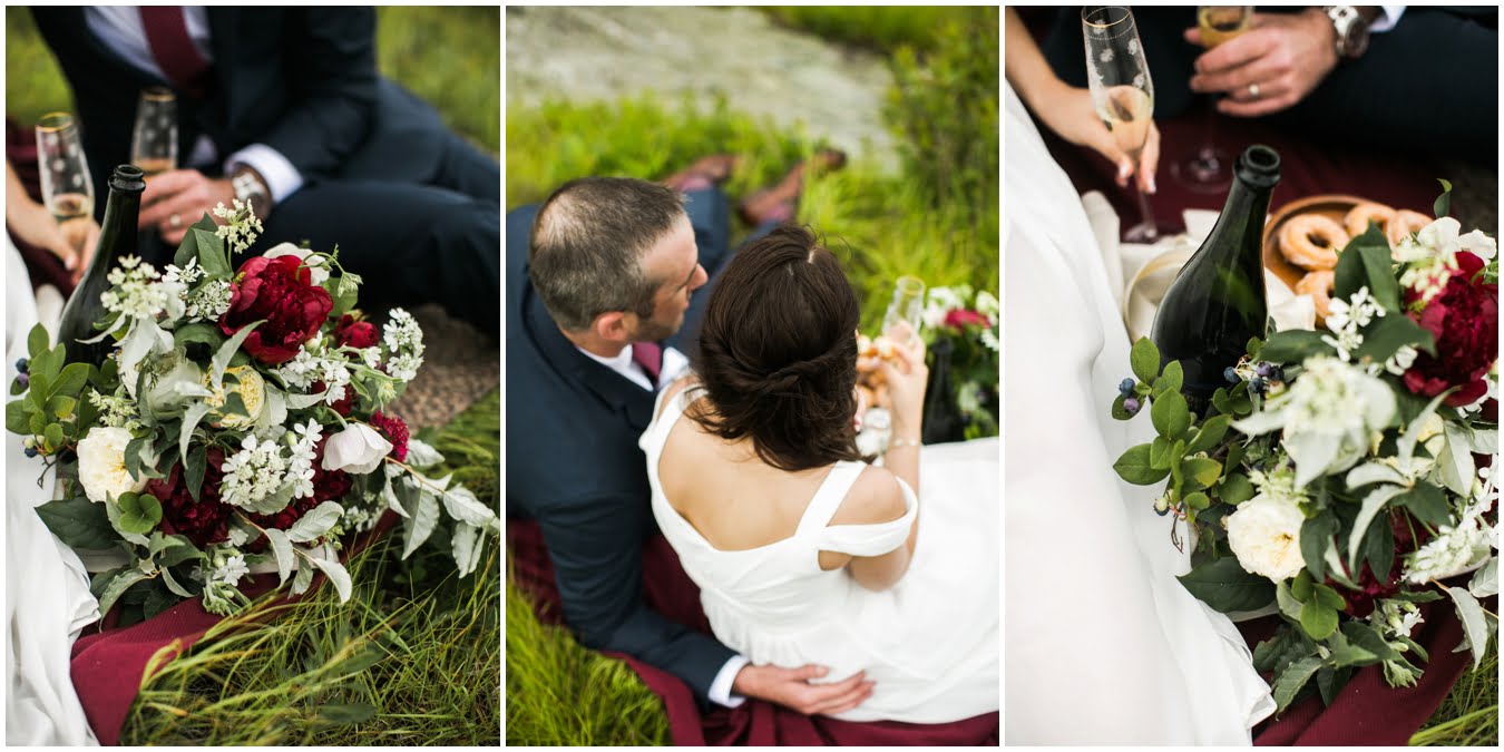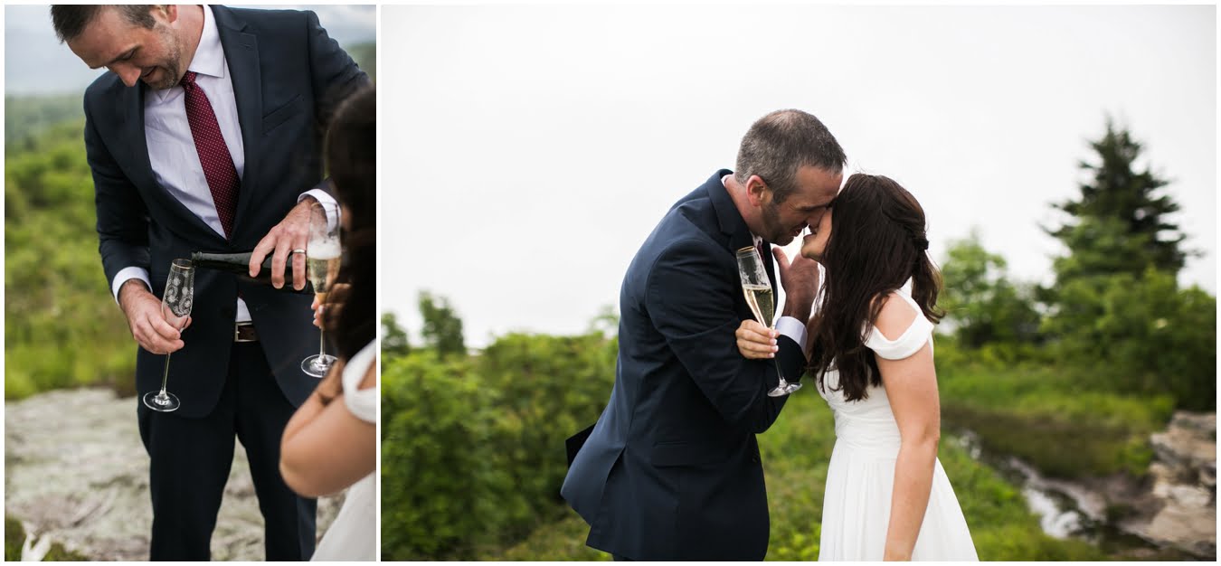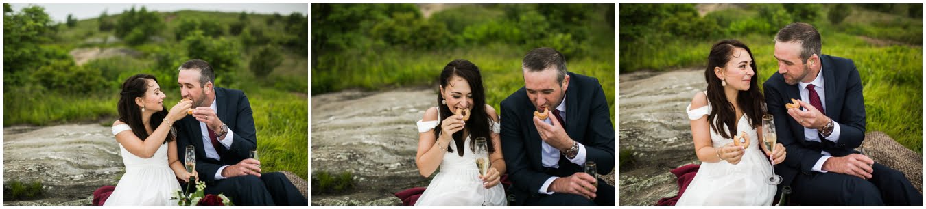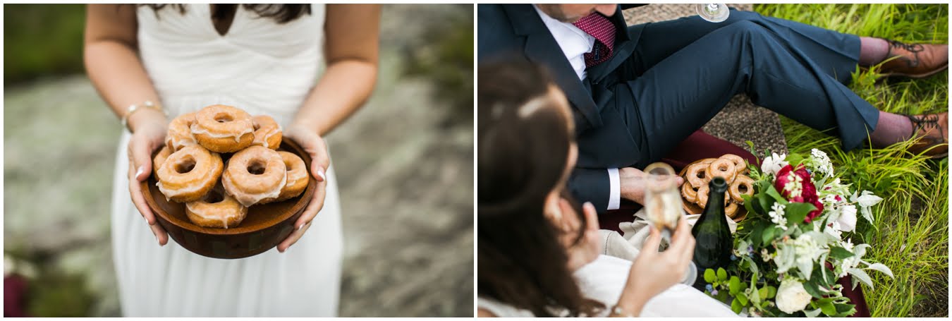 This year has just been the year of elopements. I’m not sure what it is, whether it’s the changing political climate, economic changes, or that people are just gravitating towards a more simple, sweet style of wedding, but it seems that more and more people are opting to forego the big traditional wedding celebration. Instead, I’ve had dozens of couples recently choose to run off into the mountains together to promise each other forever, and it’s just the most magical thing. Tori and Jon planned their Black Balsam Elopement so it roughly followed a traditional wedding day, but with just the two of them to enjoy it all, privately. Alex Fisher of Lucky Penny Creative styled their mini reception perfectly, with lush florals from Flora (check out Tori’s amazing, and delicious, something blue tucked into her bouquet!), sweet doughnuts from Vortex, and a champagne toast with Biltmore bubbly. I couldn’t have imagined a more perfect setup.