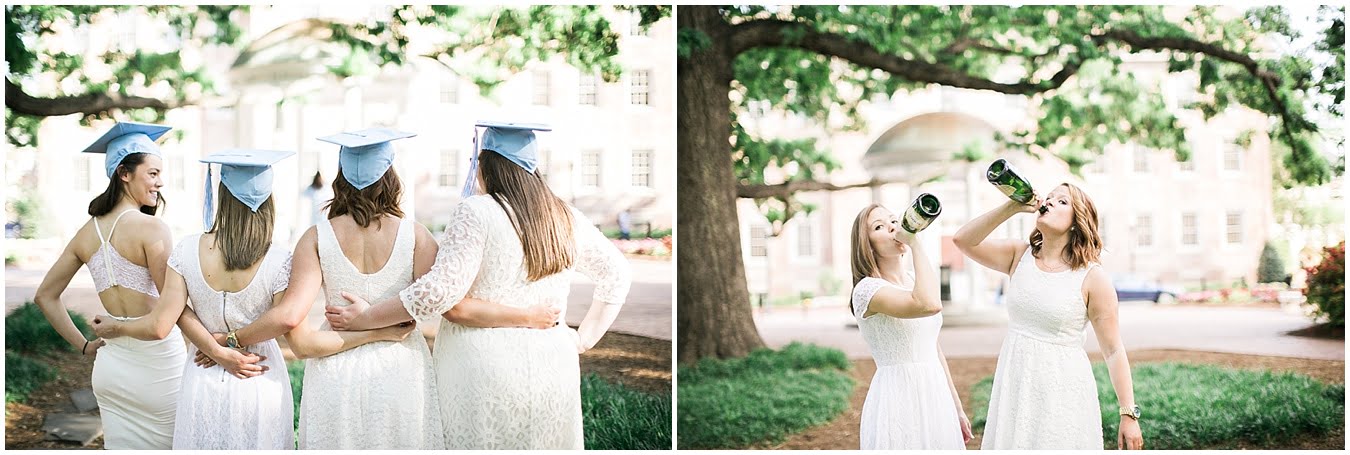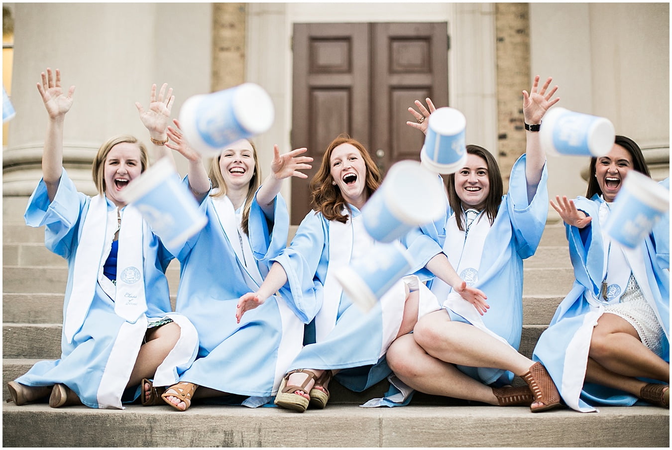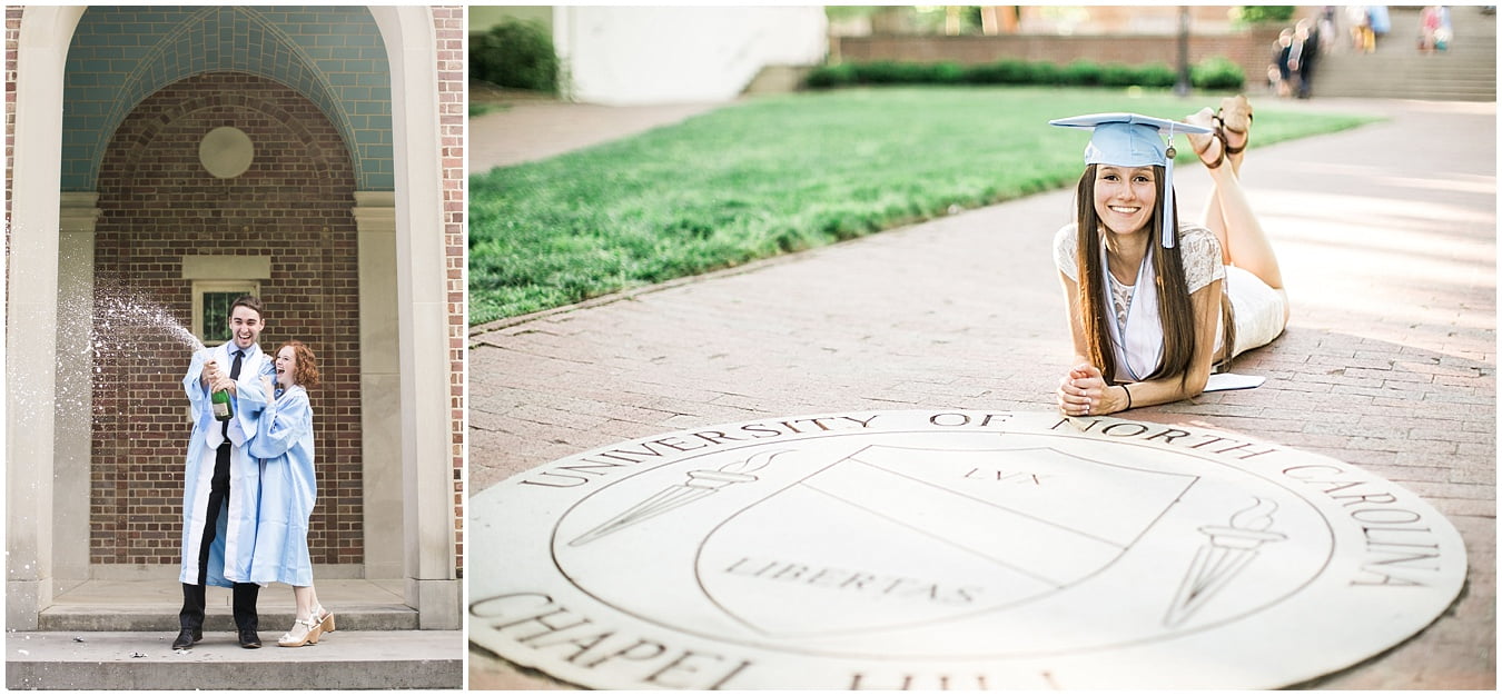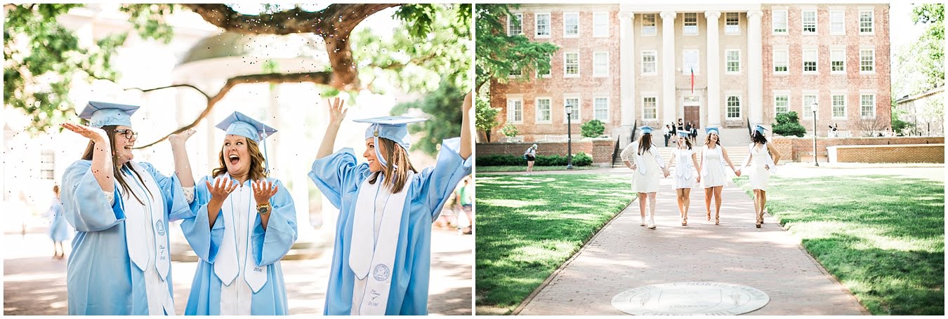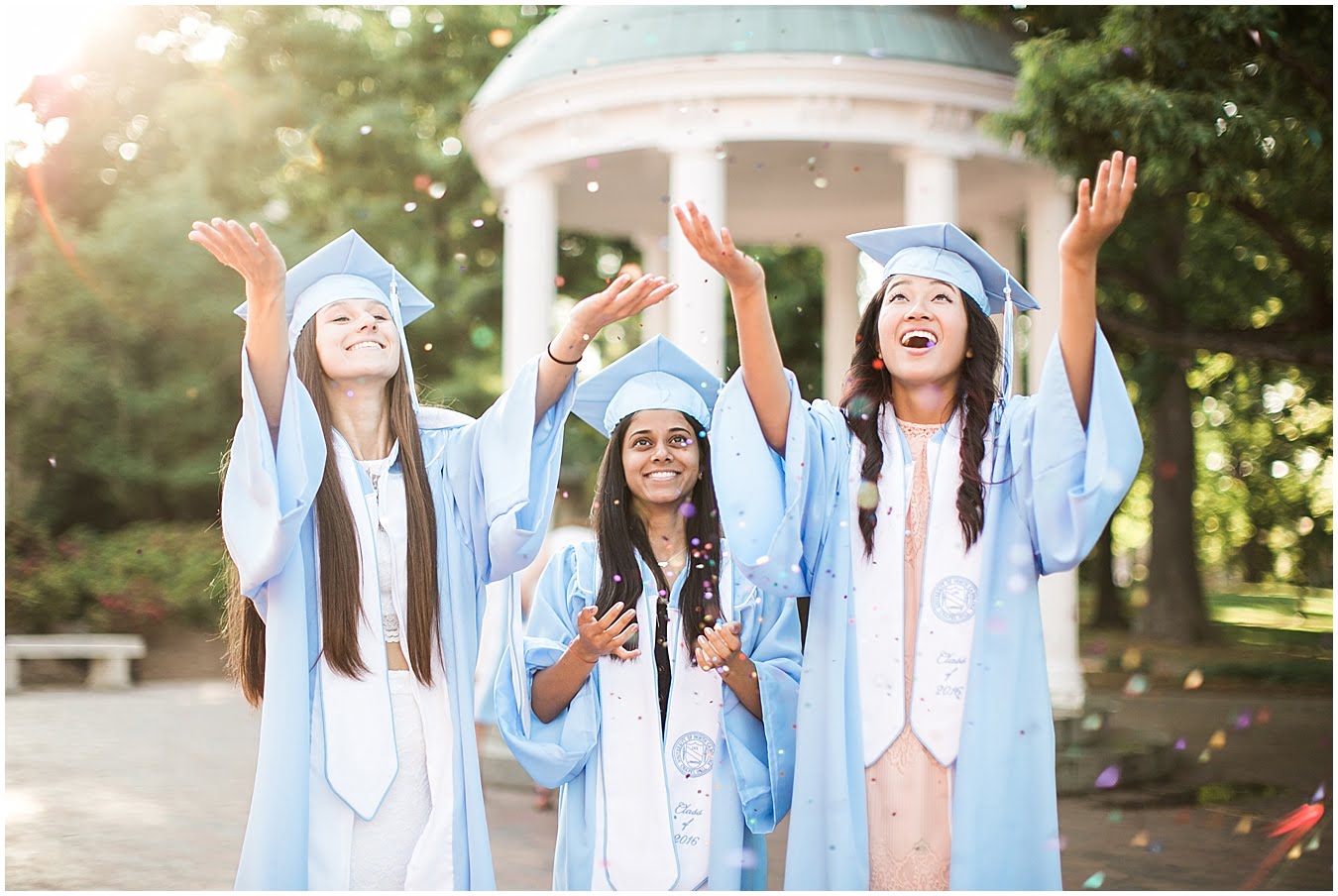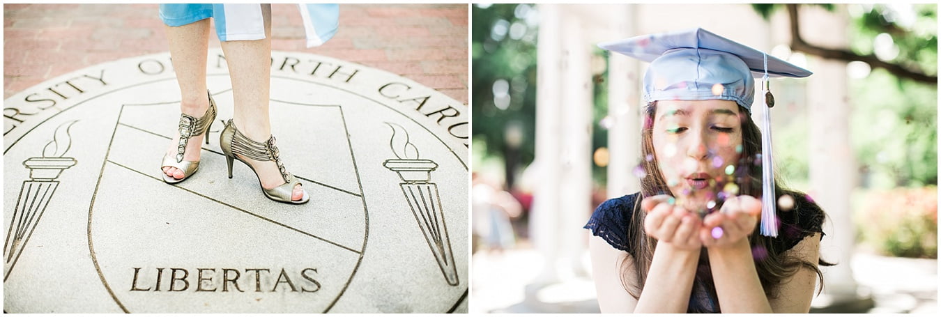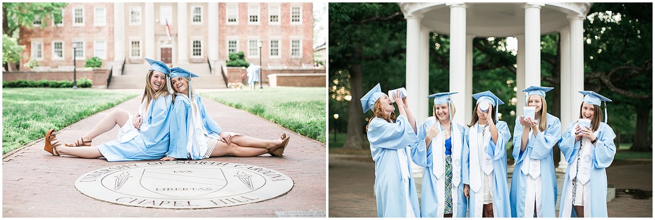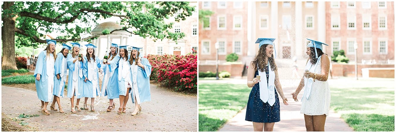 I strive every year to make your UNC grad photos a very personalized experience, talking with you ahead of time to figure out how we can make the shoot a unique celebration of this awesome milestone for you, whether its by popping a bottle of bubbly in front of the camera, tossing confetti with your best friends, or bringing your sweet pup along for the shoot. The hour is yours to get as creative as you want! Check out the photos below for some inspiration, and see why so many other grads have chosen me as their UNC Graduation Photographer!