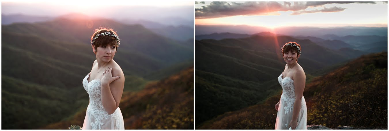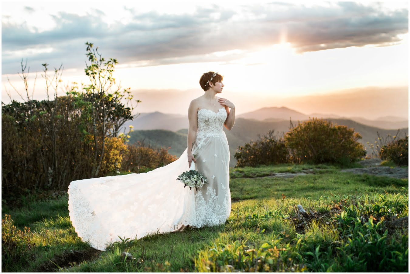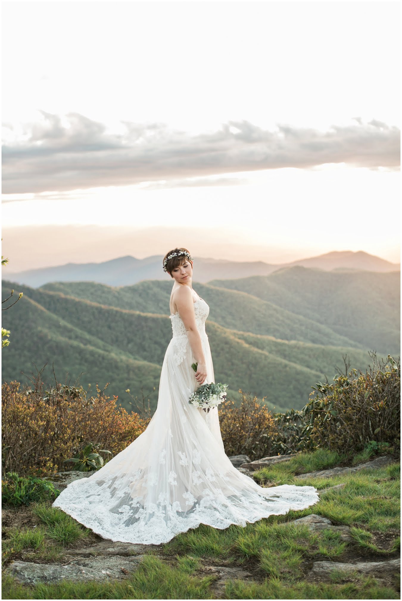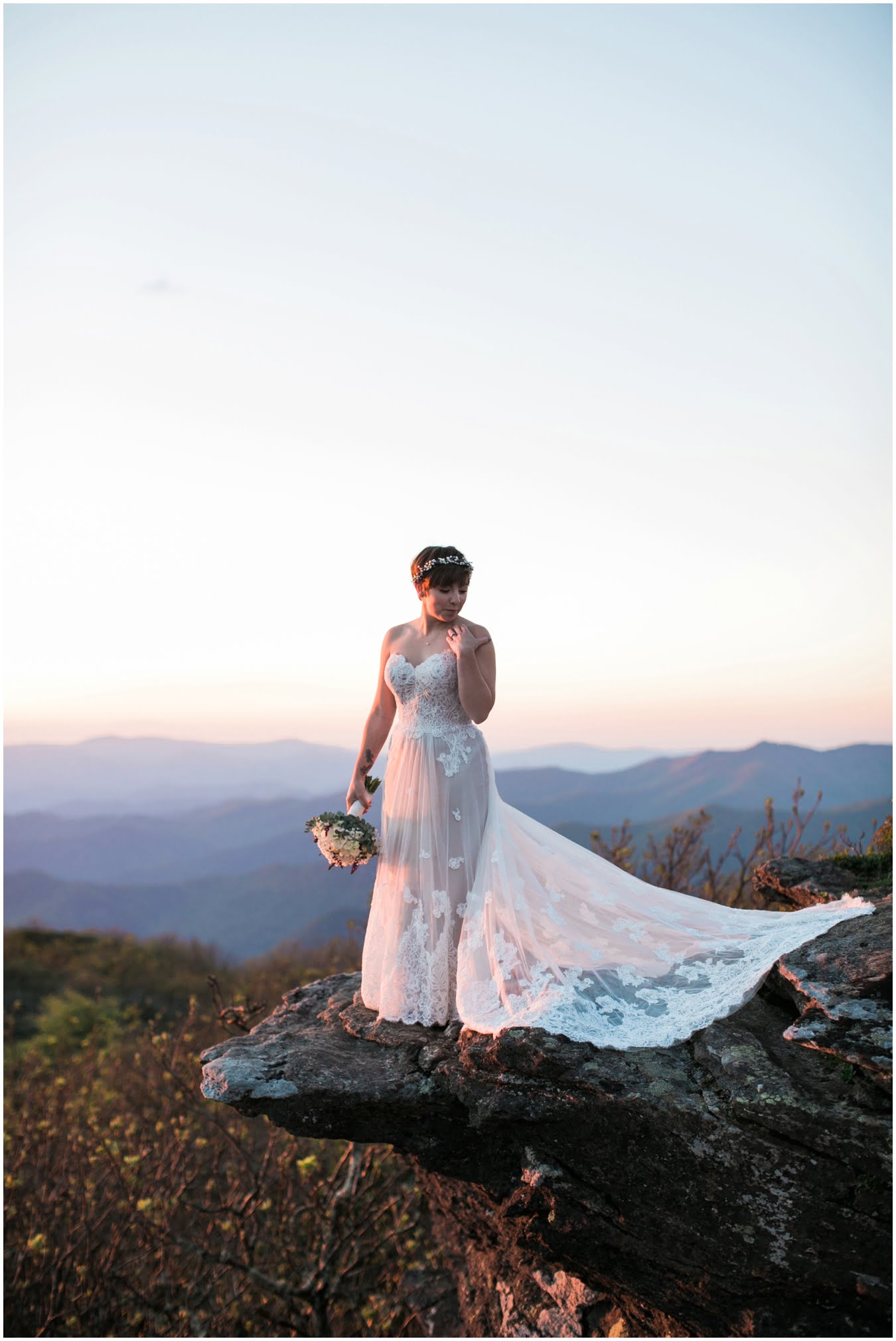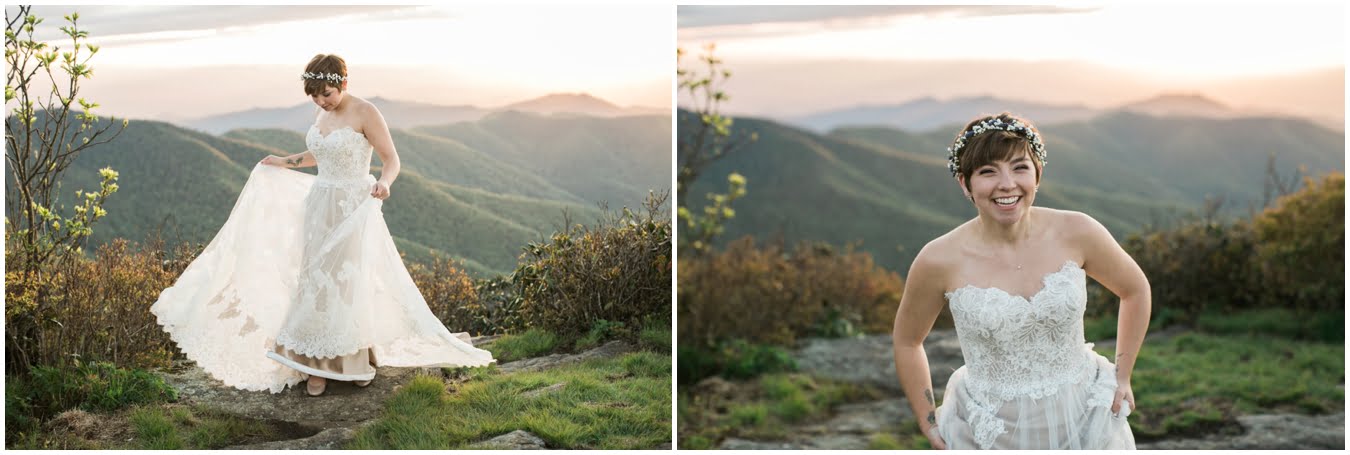 There’s really no other way to describe Sarah in all her bridal glory. From her delicate floral crown nestled atop her cute pixie cut to the flow and drape of her gorgeous lace train she was every inch a bridal queen, from head to toe. I love brides who are adventurous enough to trek up a mountain in their wedding dresses! We were rewarded with the most gorgeous sunset atop Craggy Gardens, with lots of laughter a long the way. I’m so excited to be able to share these images now that Sarah and Nathaniel have tied the knot!