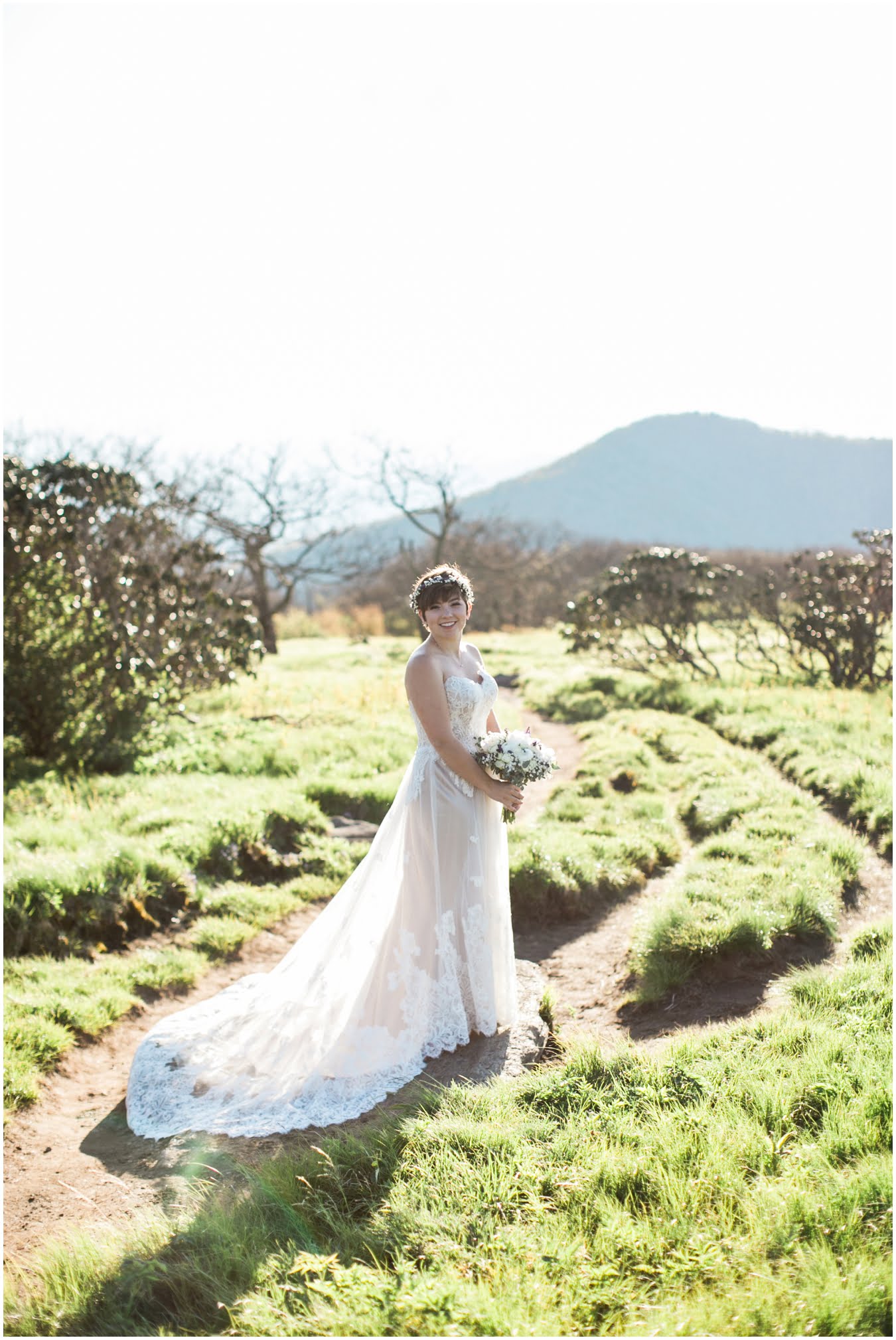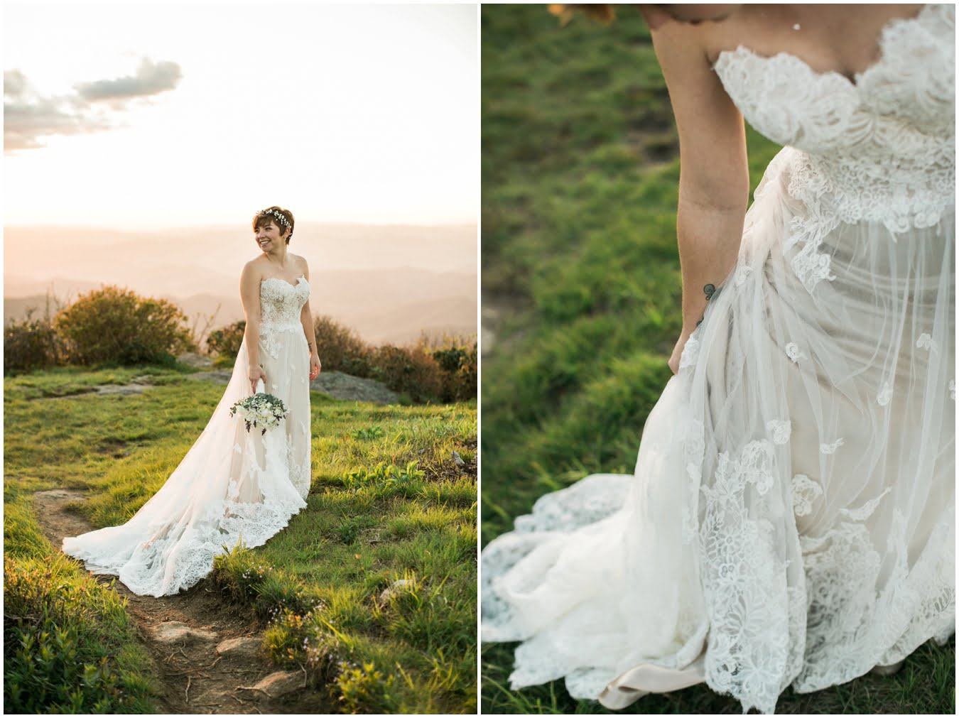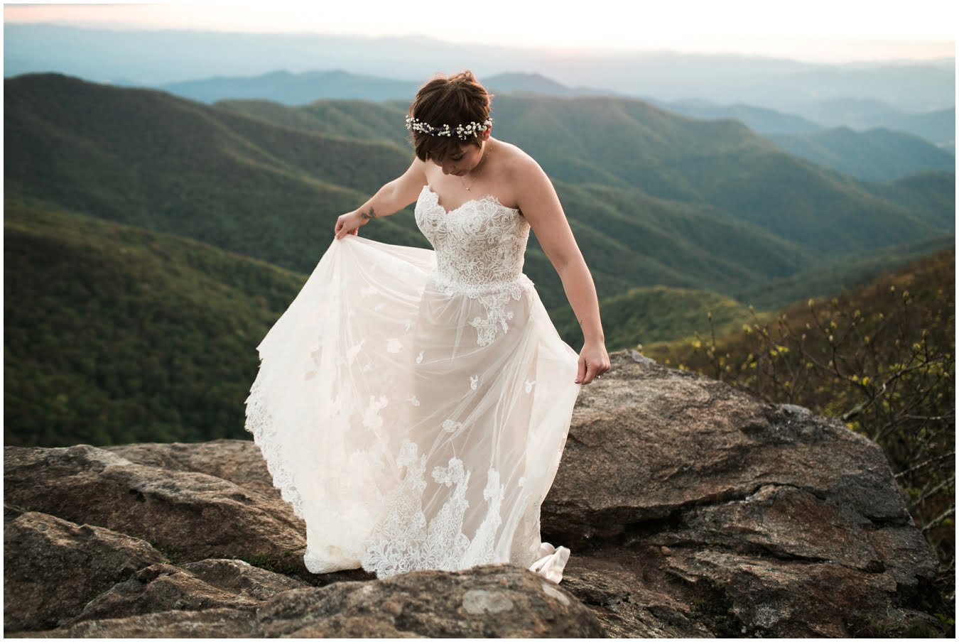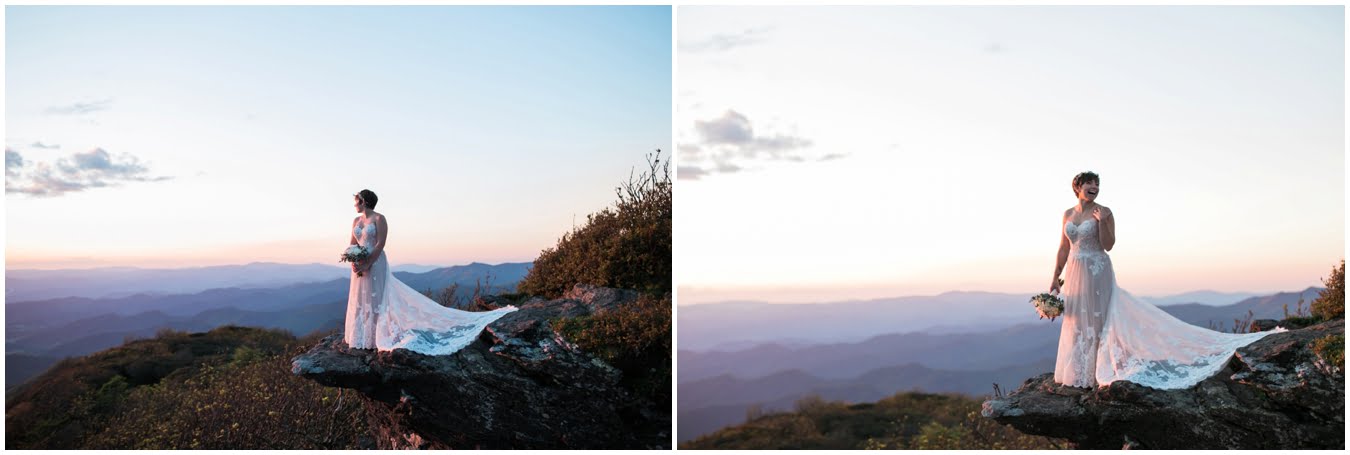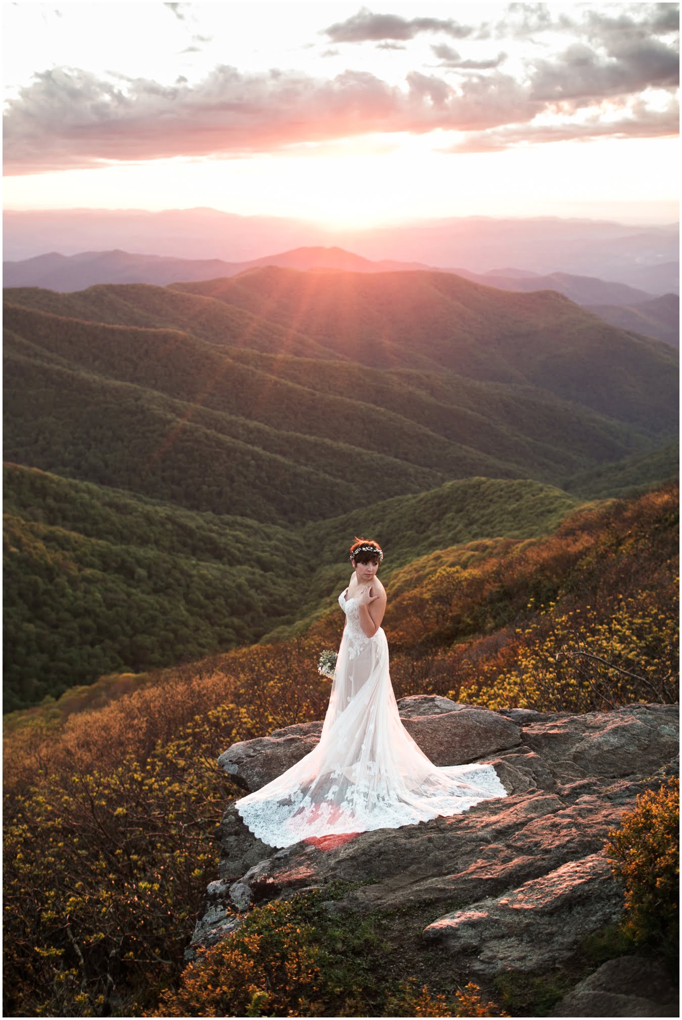 There’s really no other way to describe Sarah in all her bridal glory. From her delicate floral crown nestled atop her cute pixie cut to the flow and drape of her gorgeous lace train she was every inch a bridal queen, from head to toe. I love brides who are adventurous enough to trek up a mountain in their wedding dresses! We were rewarded with the most gorgeous sunset atop Craggy Gardens, with lots of laughter a long the way. I’m so excited to be able to share these images now that Sarah and Nathaniel have tied the knot!