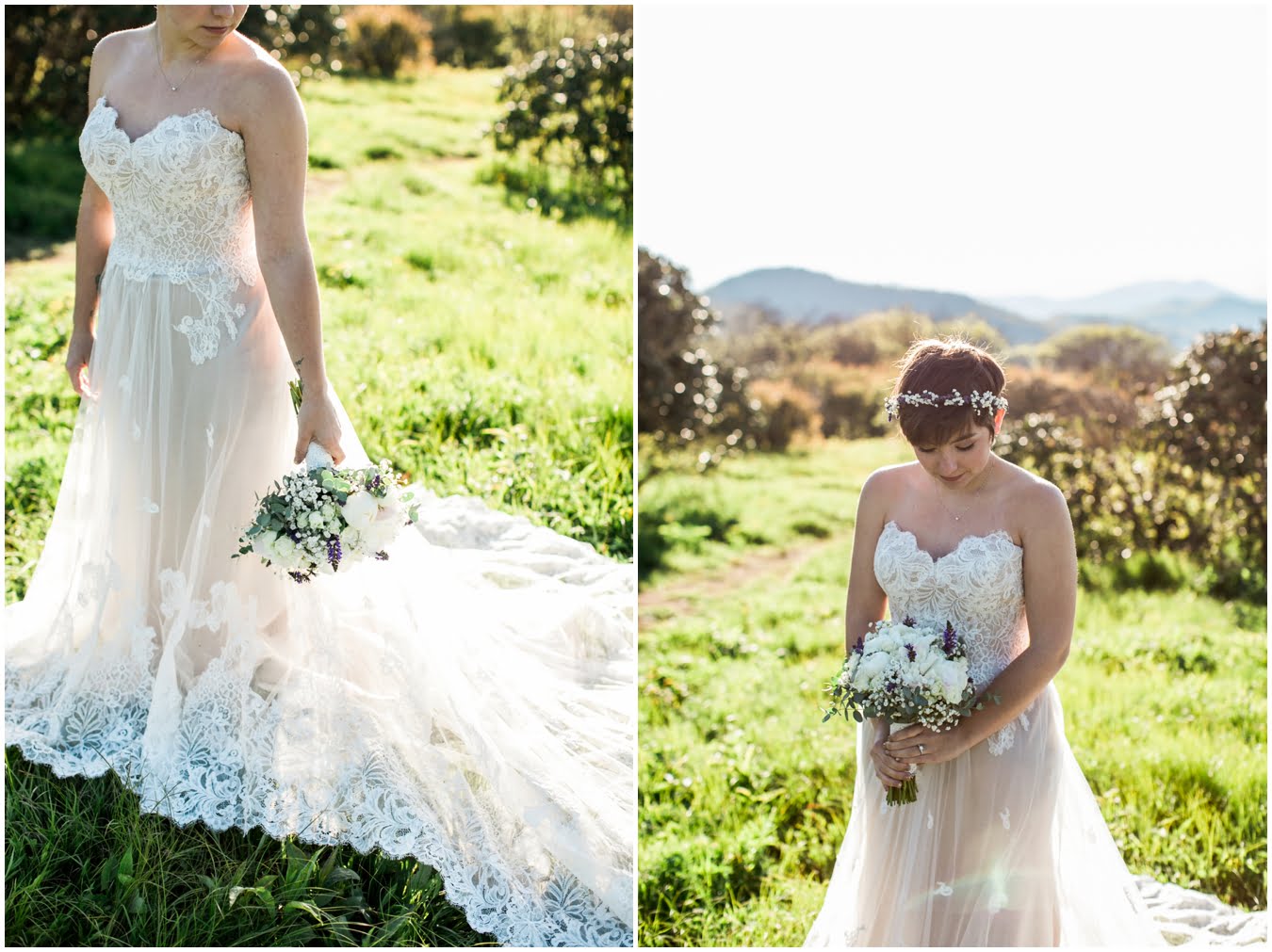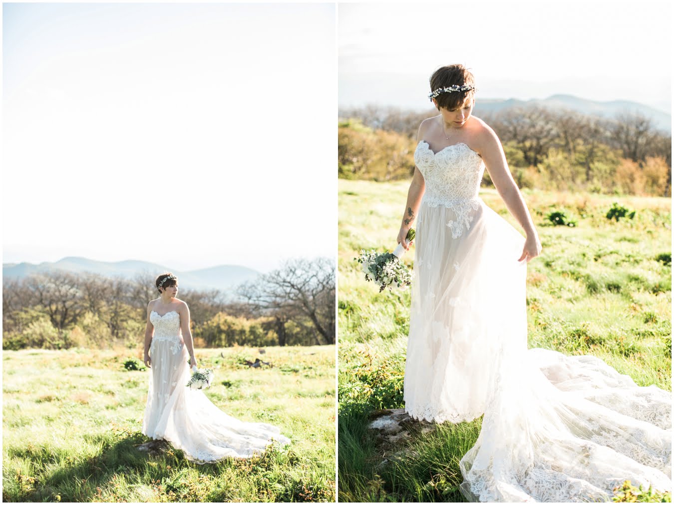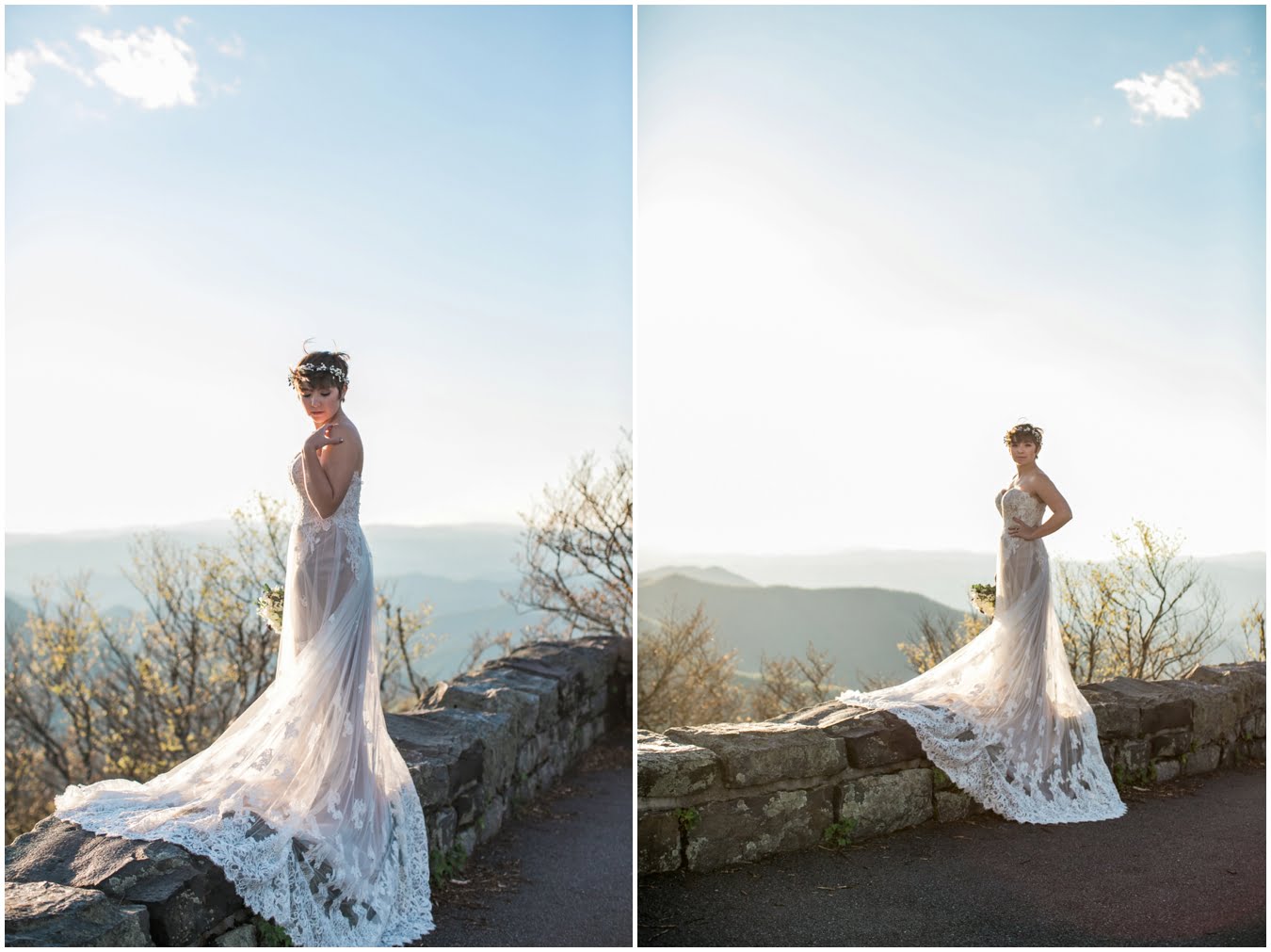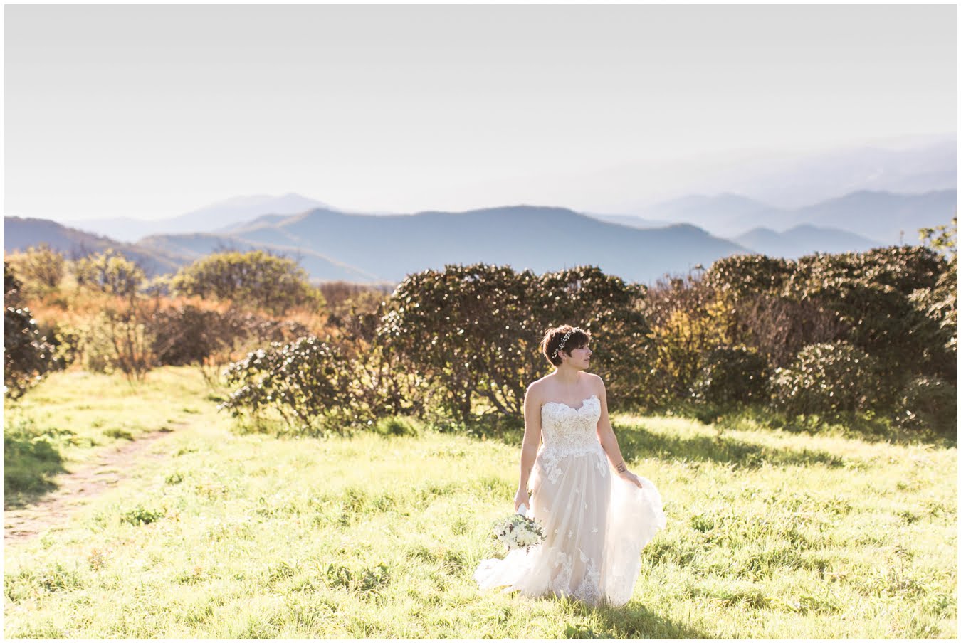There’s really no other way to describe Sarah in all her bridal glory. From her delicate floral crown nestled atop her cute pixie cut to the flow and drape of her gorgeous lace train she was every inch a bridal queen, from head to toe. I love brides who are adventurous enough to trek up a mountain in their wedding dresses! We were rewarded with the most gorgeous sunset atop Craggy Gardens, with lots of laughter a long the way. I’m so excited to be able to share these images now that Sarah and Nathaniel have tied the knot!