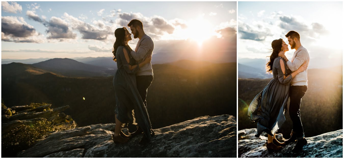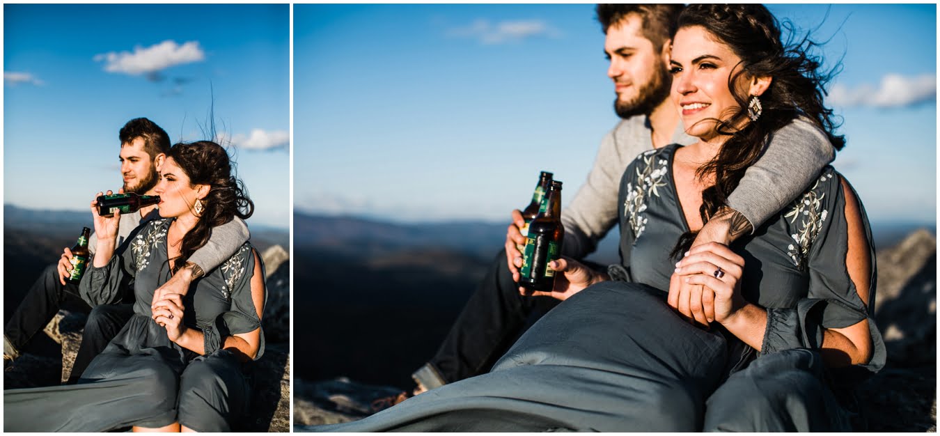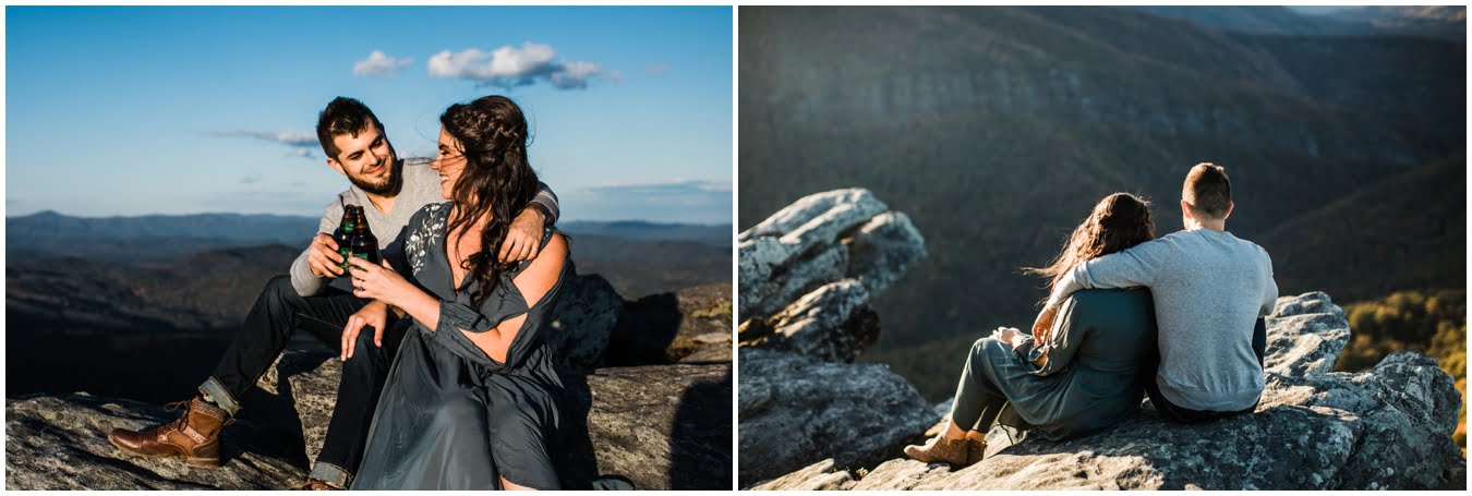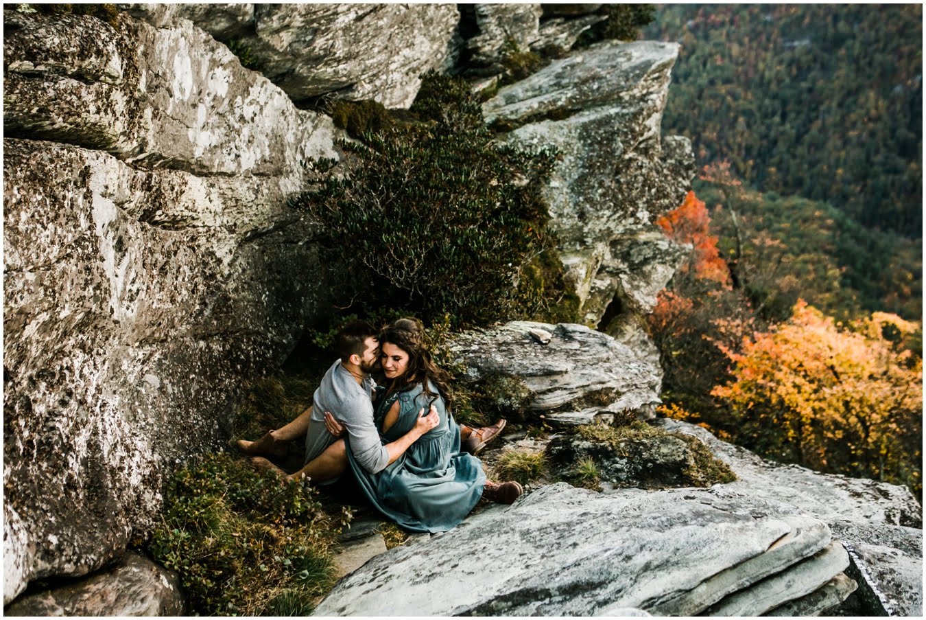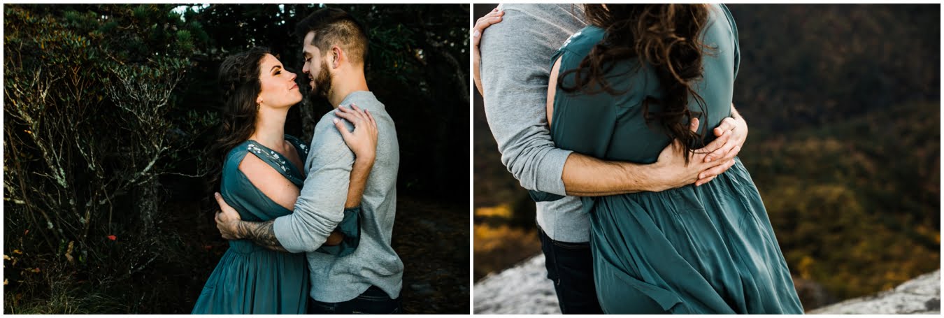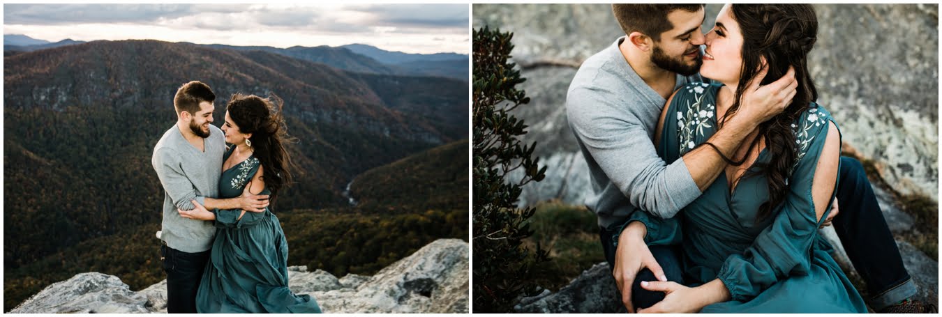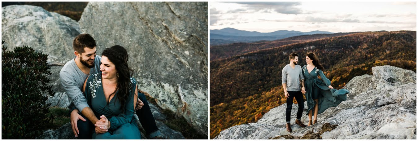 I had the best time with Stew+Krause on their epic mountain engagement shoot. The fall colors peaked late this year, so even though we were hiking at the end of October, we still had amazing foliage to go with the stunning views. We met up at the trailhead and hiked the mile and a half or so to the top, talking about how they met (she gave him a fake name at first!), their Asheville elopement plans for next June (spoiler alert, it involves glamping), and bad dates (none of which they had been on with each other). When we got to the top of the mountain, the sun was just reaching the edge of a cloud bank, drenching the cliffs with golden light. After a rest and a celebratory trail beer, we set to exploring the cliffs and crags as the sun sank lower. The wind picked up and whipped around us, tossing the skirt of Stew’s dress around and creating the perfect scene. These two were such troopers, pulling out a blanket to snuggle in as it got colder and colder. We eventually made our way back down the trail in the dark, in awe of the landscape we had just witnessed.