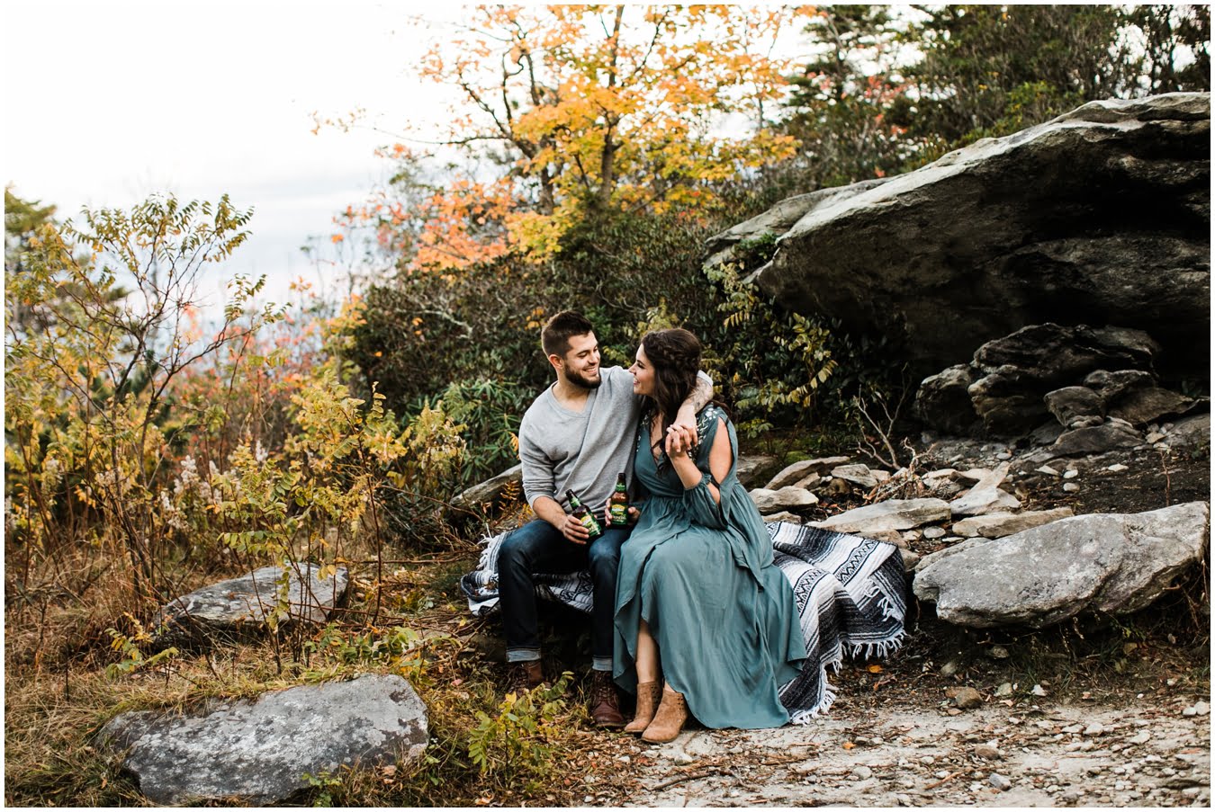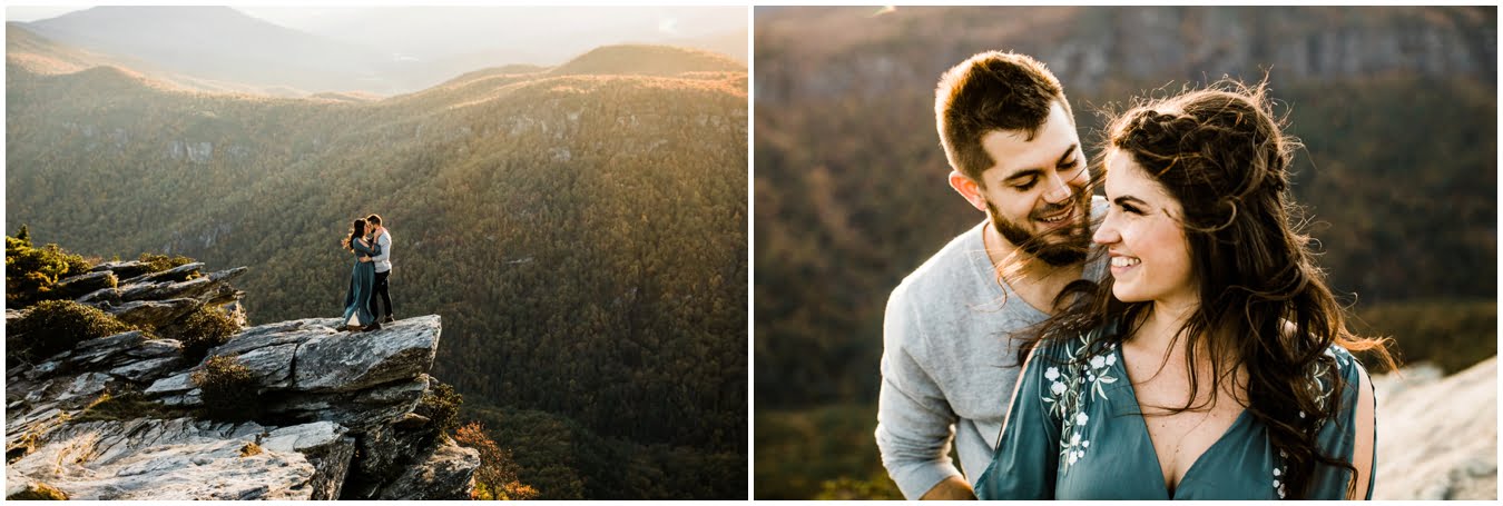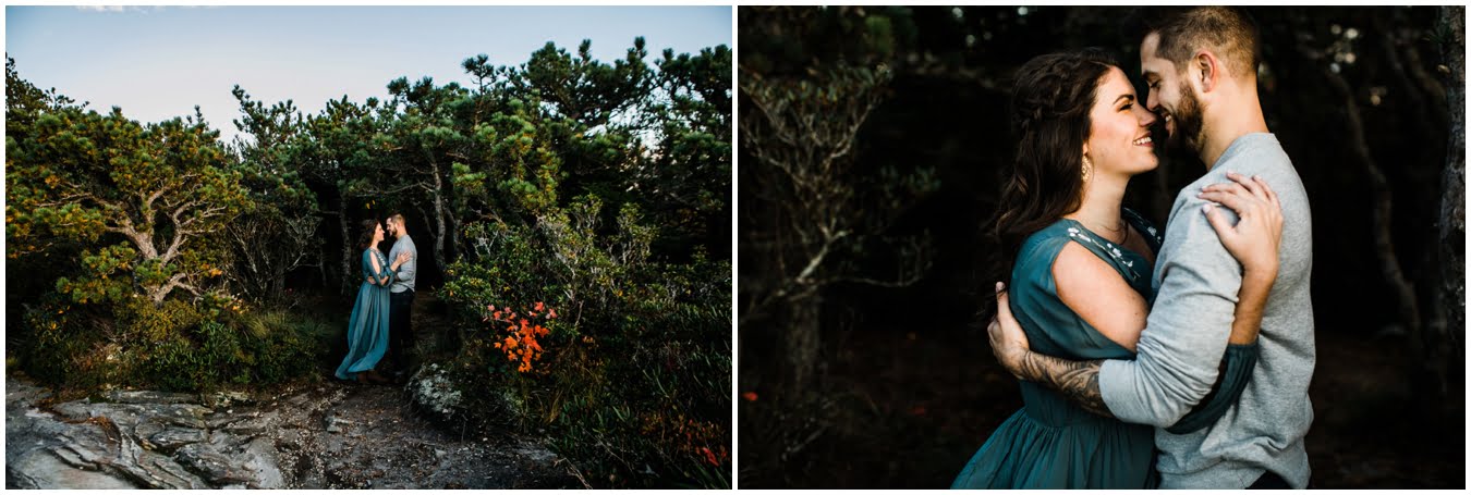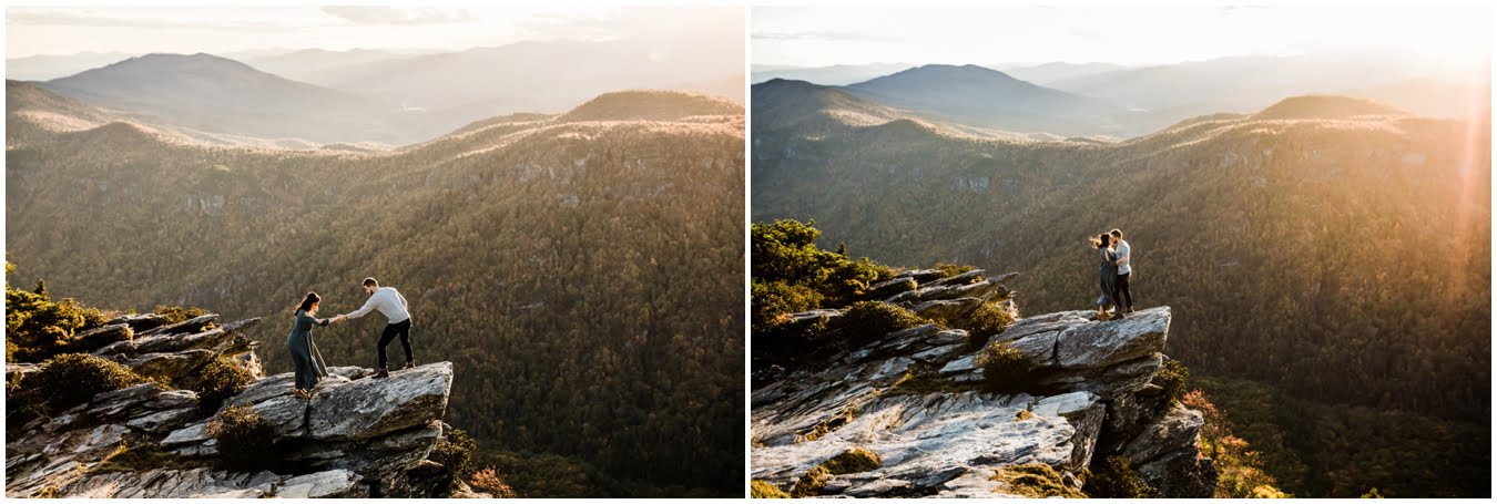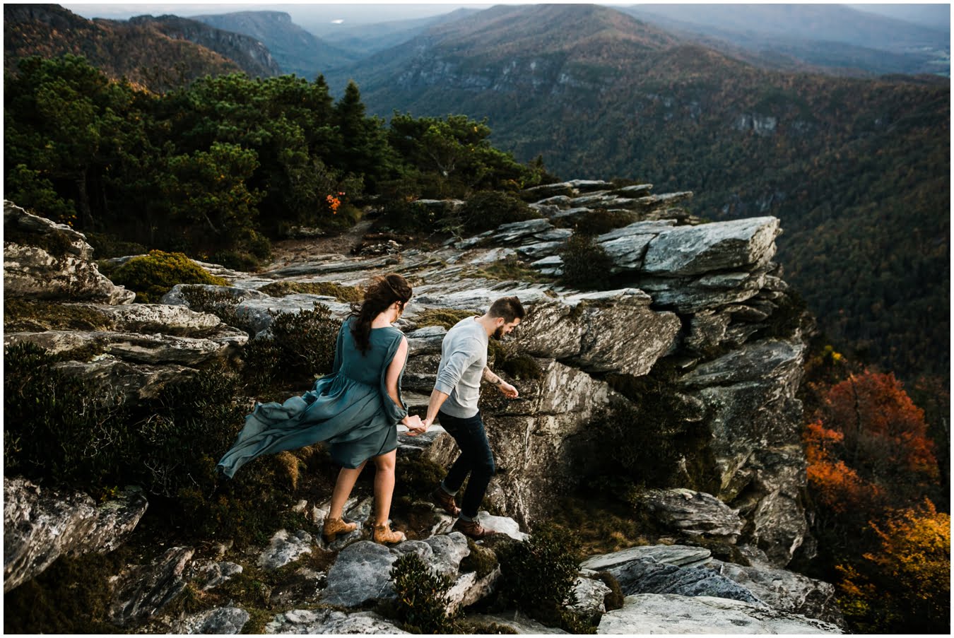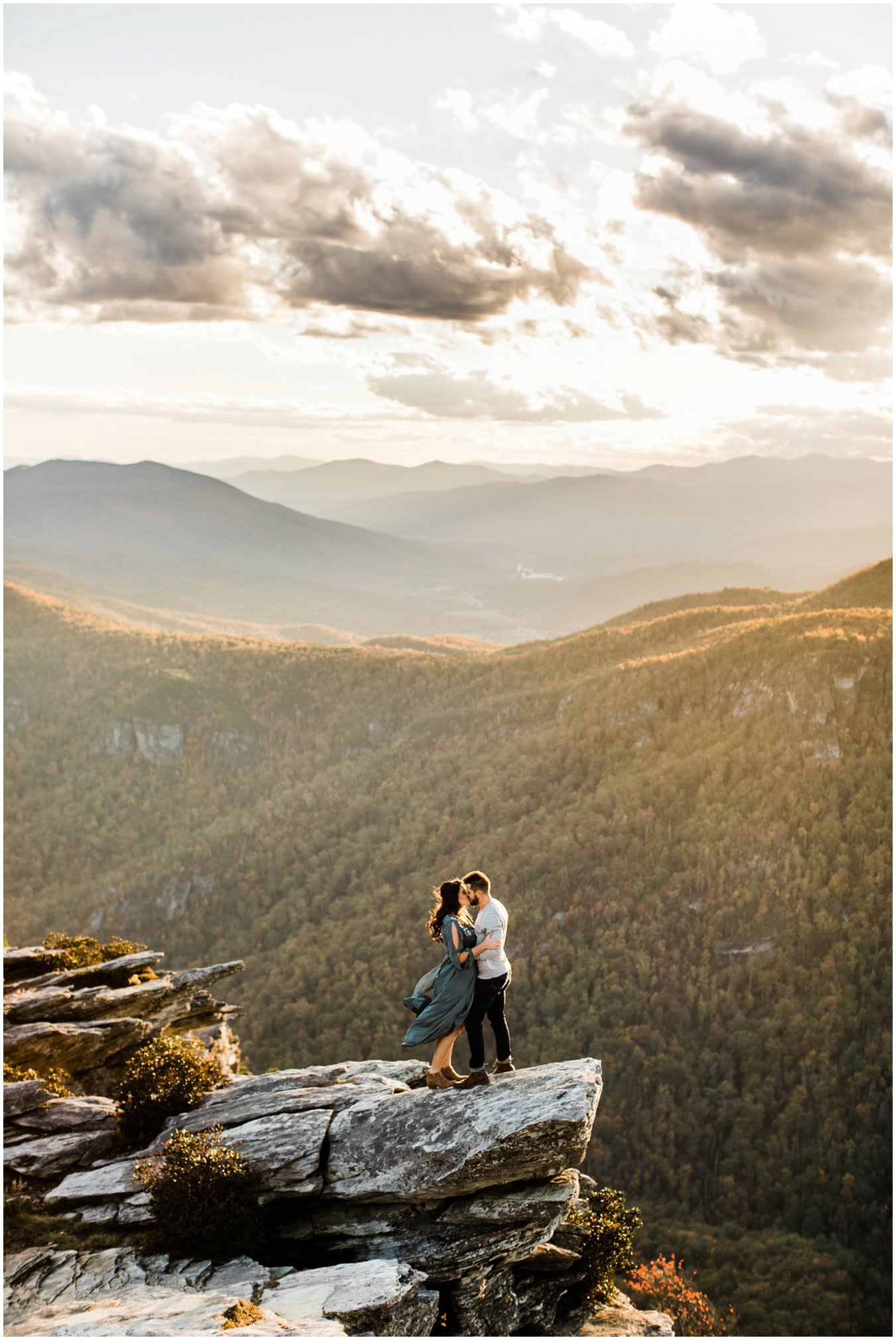 I had the best time with Stew+Krause on their epic mountain engagement shoot. The fall colors peaked late this year, so even though we were hiking at the end of October, we still had amazing foliage to go with the stunning views. We met up at the trailhead and hiked the mile and a half or so to the top, talking about how they met (she gave him a fake name at first!), their Asheville elopement plans for next June (spoiler alert, it involves glamping), and bad dates (none of which they had been on with each other). When we got to the top of the mountain, the sun was just reaching the edge of a cloud bank, drenching the cliffs with golden light. After a rest and a celebratory trail beer, we set to exploring the cliffs and crags as the sun sank lower. The wind picked up and whipped around us, tossing the skirt of Stew’s dress around and creating the perfect scene. These two were such troopers, pulling out a blanket to snuggle in as it got colder and colder. We eventually made our way back down the trail in the dark, in awe of the landscape we had just witnessed.