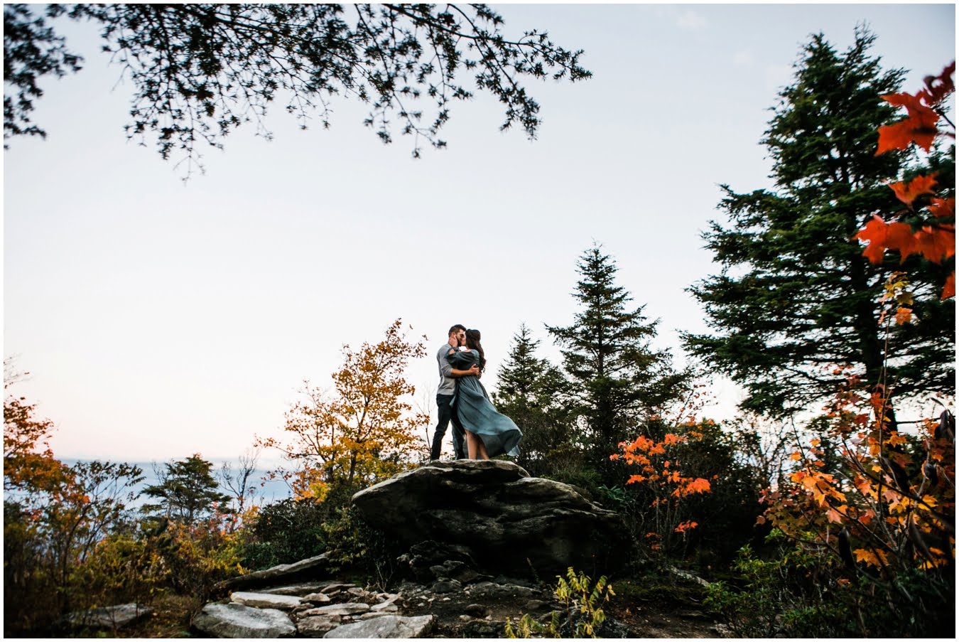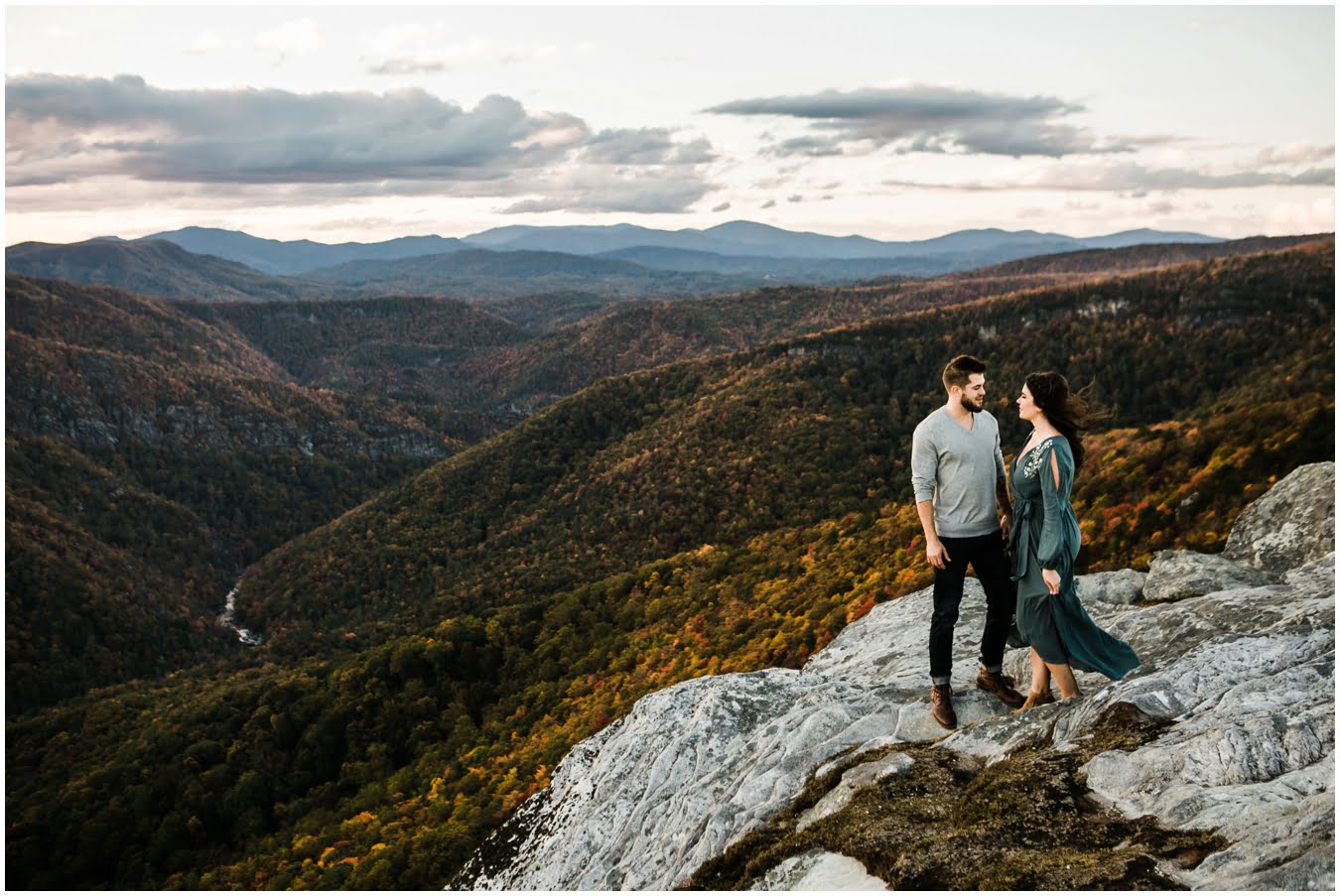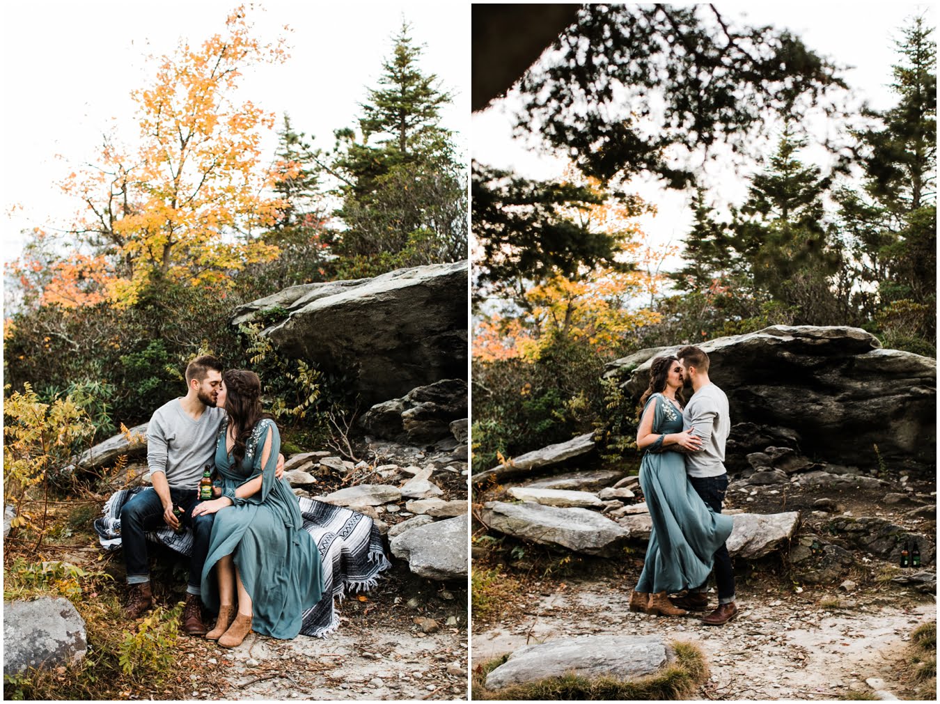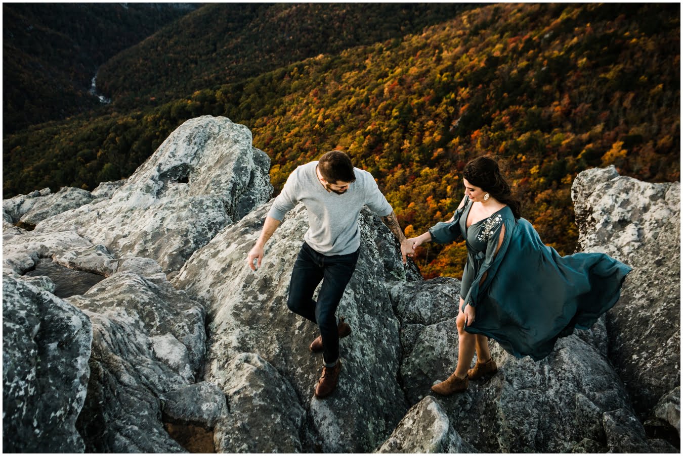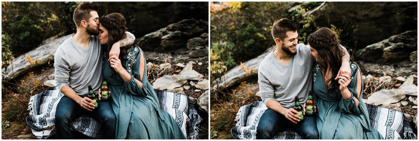 I had the best time with Stew+Krause on their epic mountain engagement shoot. The fall colors peaked late this year, so even though we were hiking at the end of October, we still had amazing foliage to go with the stunning views. We met up at the trailhead and hiked the mile and a half or so to the top, talking about how they met (she gave him a fake name at first!), their Asheville elopement plans for next June (spoiler alert, it involves glamping), and bad dates (none of which they had been on with each other). When we got to the top of the mountain, the sun was just reaching the edge of a cloud bank, drenching the cliffs with golden light. After a rest and a celebratory trail beer, we set to exploring the cliffs and crags as the sun sank lower. The wind picked up and whipped around us, tossing the skirt of Stew’s dress around and creating the perfect scene. These two were such troopers, pulling out a blanket to snuggle in as it got colder and colder. We eventually made our way back down the trail in the dark, in awe of the landscape we had just witnessed.