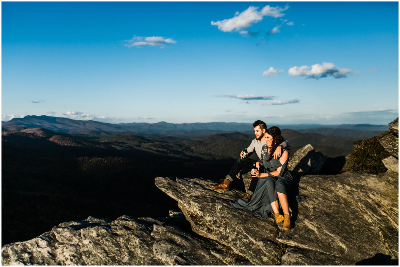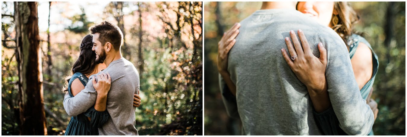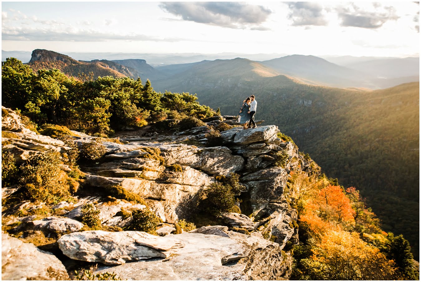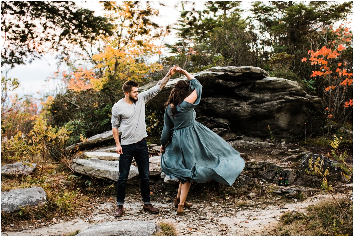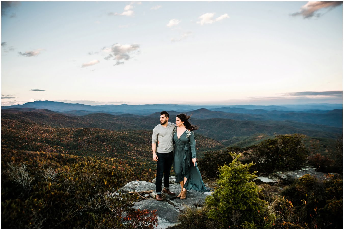 I had the best time with Stew+Krause on their epic mountain engagement shoot. The fall colors peaked late this year, so even though we were hiking at the end of October, we still had amazing foliage to go with the stunning views. We met up at the trailhead and hiked the mile and a half or so to the top, talking about how they met (she gave him a fake name at first!), their Asheville elopement plans for next June (spoiler alert, it involves glamping), and bad dates (none of which they had been on with each other). When we got to the top of the mountain, the sun was just reaching the edge of a cloud bank, drenching the cliffs with golden light. After a rest and a celebratory trail beer, we set to exploring the cliffs and crags as the sun sank lower. The wind picked up and whipped around us, tossing the skirt of Stew’s dress around and creating the perfect scene. These two were such troopers, pulling out a blanket to snuggle in as it got colder and colder. We eventually made our way back down the trail in the dark, in awe of the landscape we had just witnessed.