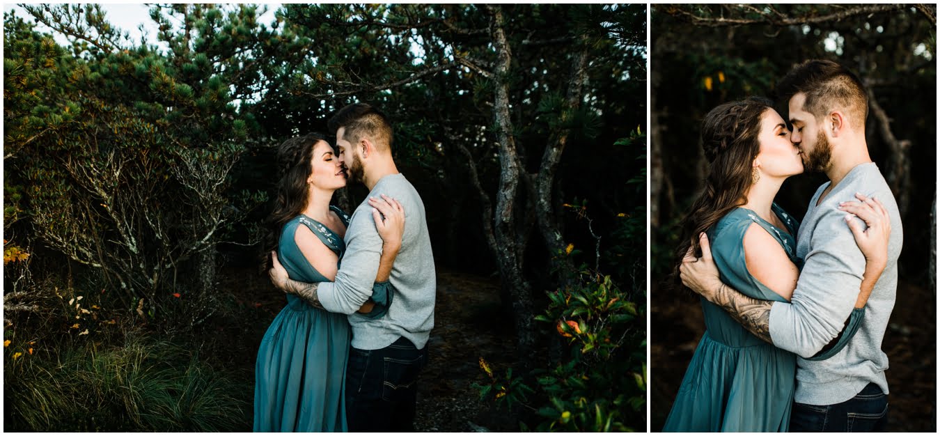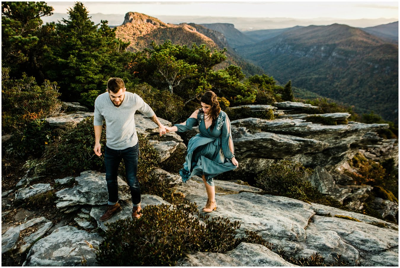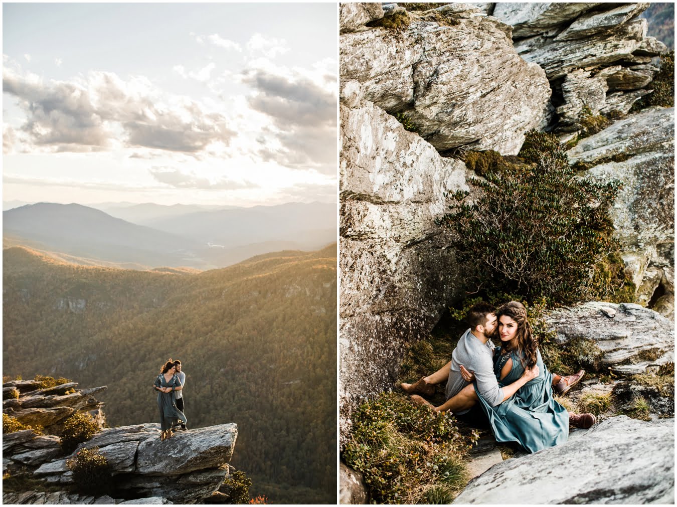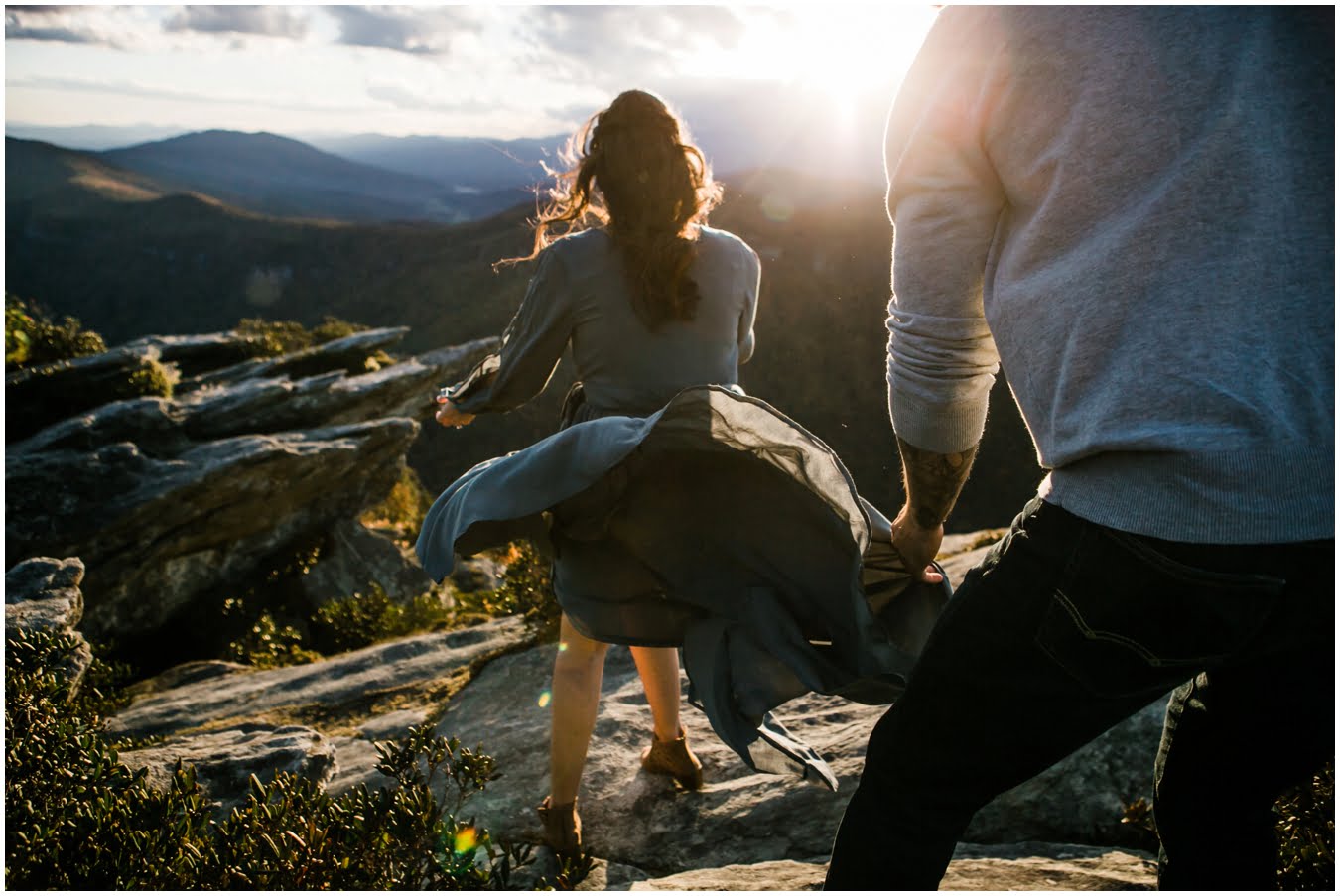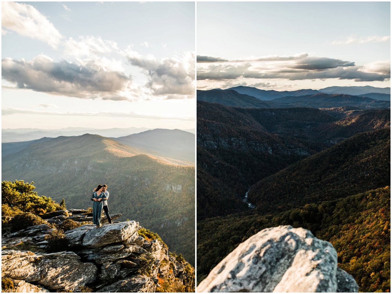 I had the best time with Stew+Krause on their epic mountain engagement shoot. The fall colors peaked late this year, so even though we were hiking at the end of October, we still had amazing foliage to go with the stunning views. We met up at the trailhead and hiked the mile and a half or so to the top, talking about how they met (she gave him a fake name at first!), their Asheville elopement plans for next June (spoiler alert, it involves glamping), and bad dates (none of which they had been on with each other). When we got to the top of the mountain, the sun was just reaching the edge of a cloud bank, drenching the cliffs with golden light. After a rest and a celebratory trail beer, we set to exploring the cliffs and crags as the sun sank lower. The wind picked up and whipped around us, tossing the skirt of Stew’s dress around and creating the perfect scene. These two were such troopers, pulling out a blanket to snuggle in as it got colder and colder. We eventually made our way back down the trail in the dark, in awe of the landscape we had just witnessed.