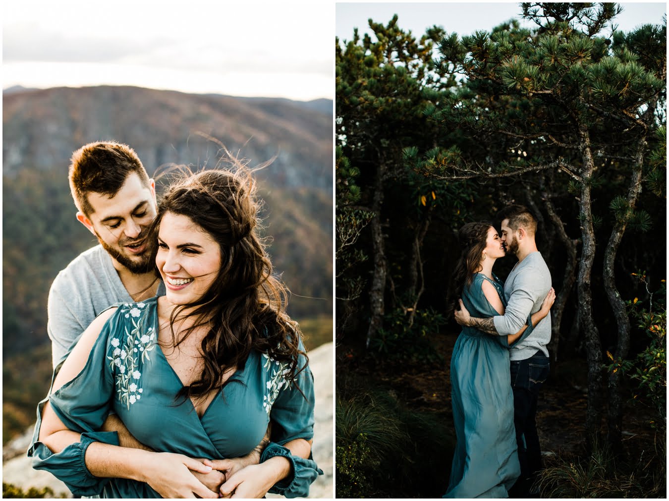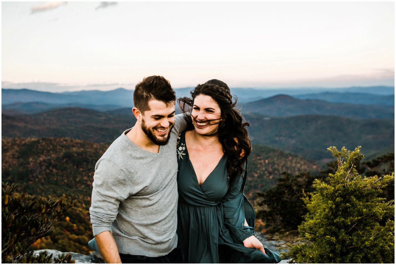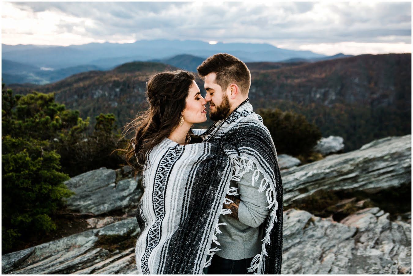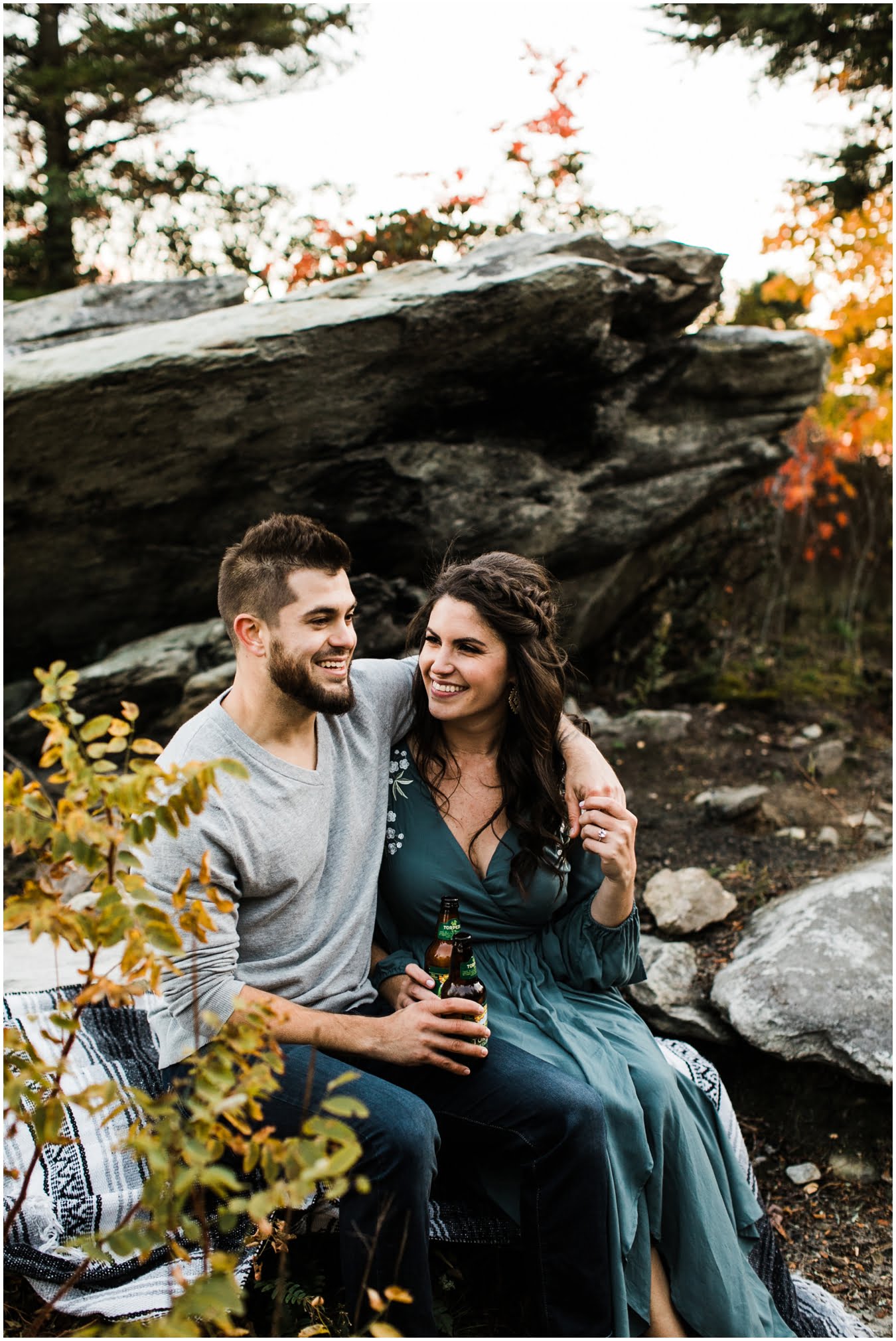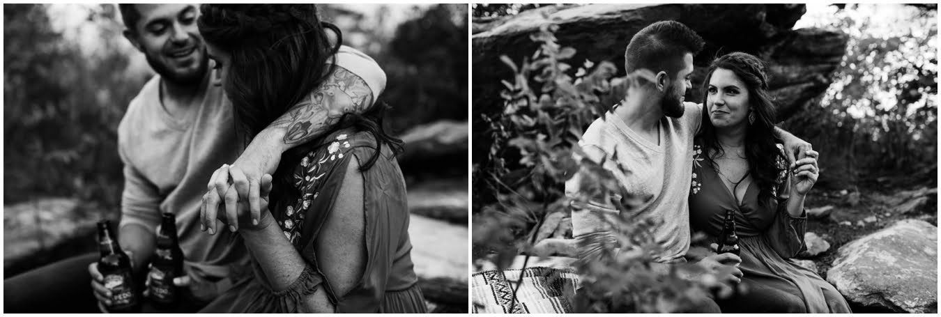 I had the best time with Stew+Krause on their epic mountain engagement shoot. The fall colors peaked late this year, so even though we were hiking at the end of October, we still had amazing foliage to go with the stunning views. We met up at the trailhead and hiked the mile and a half or so to the top, talking about how they met (she gave him a fake name at first!), their Asheville elopement plans for next June (spoiler alert, it involves glamping), and bad dates (none of which they had been on with each other). When we got to the top of the mountain, the sun was just reaching the edge of a cloud bank, drenching the cliffs with golden light. After a rest and a celebratory trail beer, we set to exploring the cliffs and crags as the sun sank lower. The wind picked up and whipped around us, tossing the skirt of Stew’s dress around and creating the perfect scene. These two were such troopers, pulling out a blanket to snuggle in as it got colder and colder. We eventually made our way back down the trail in the dark, in awe of the landscape we had just witnessed.