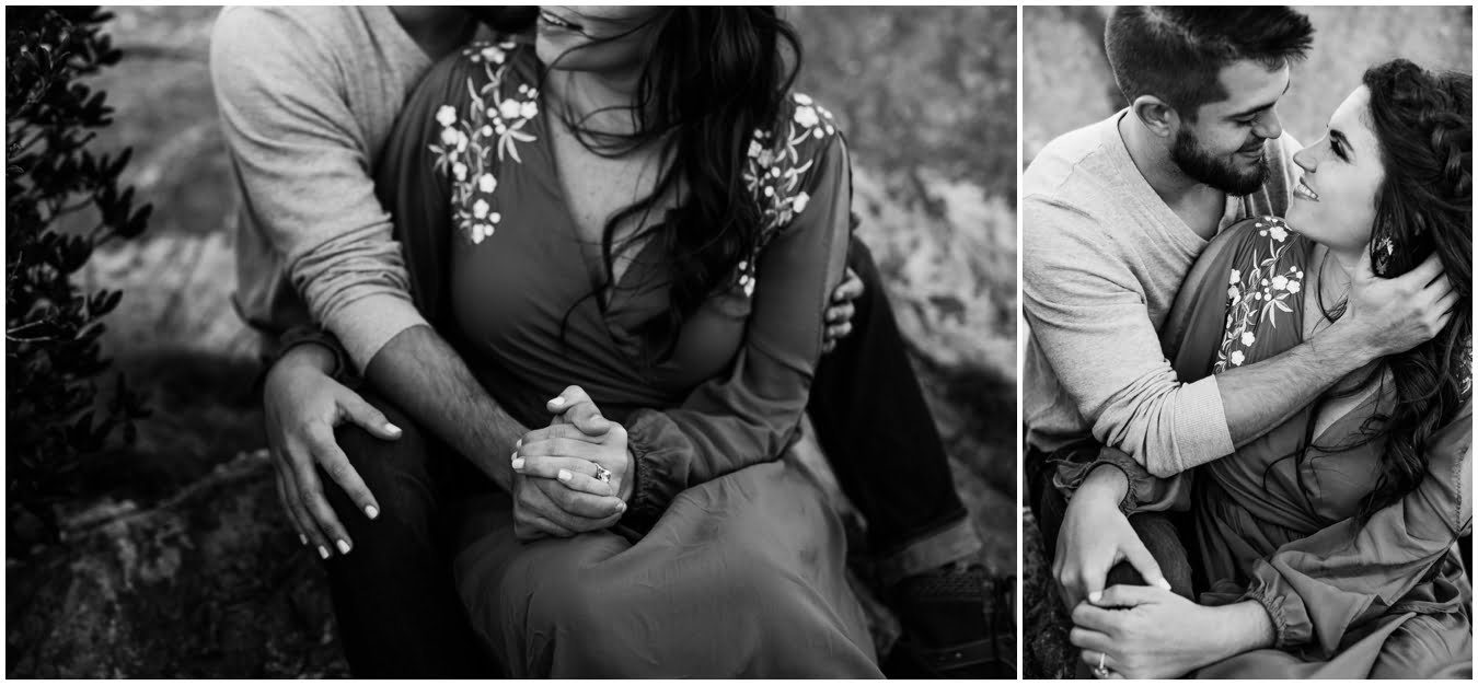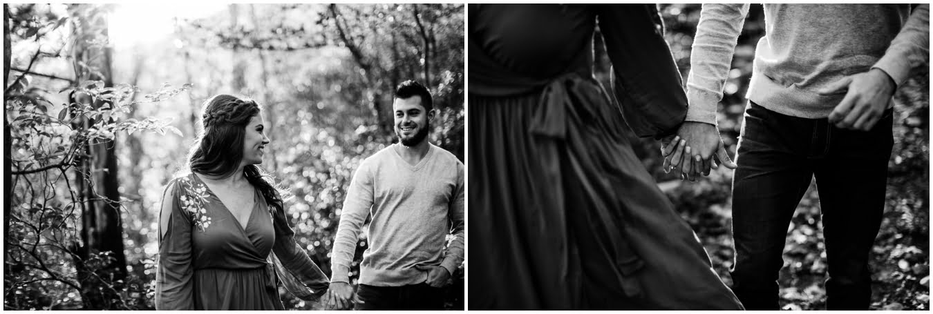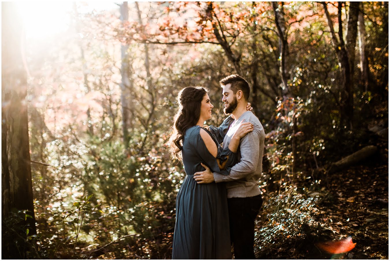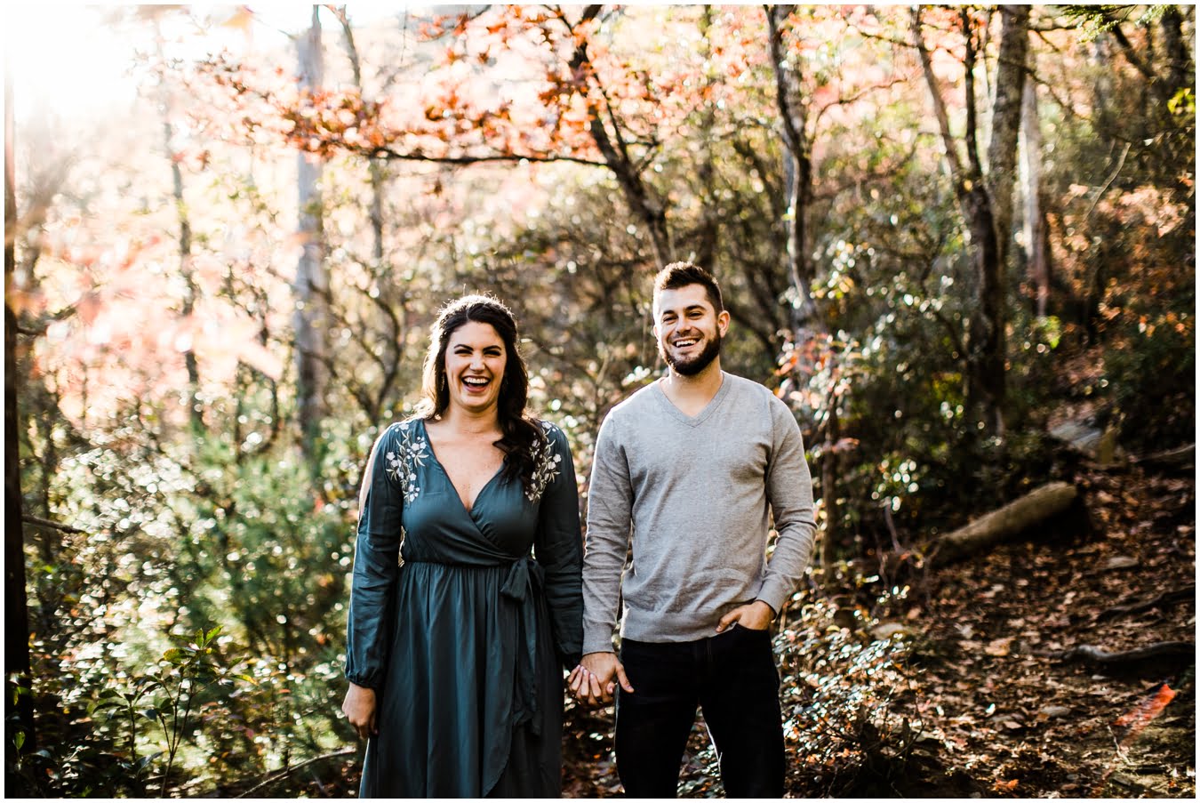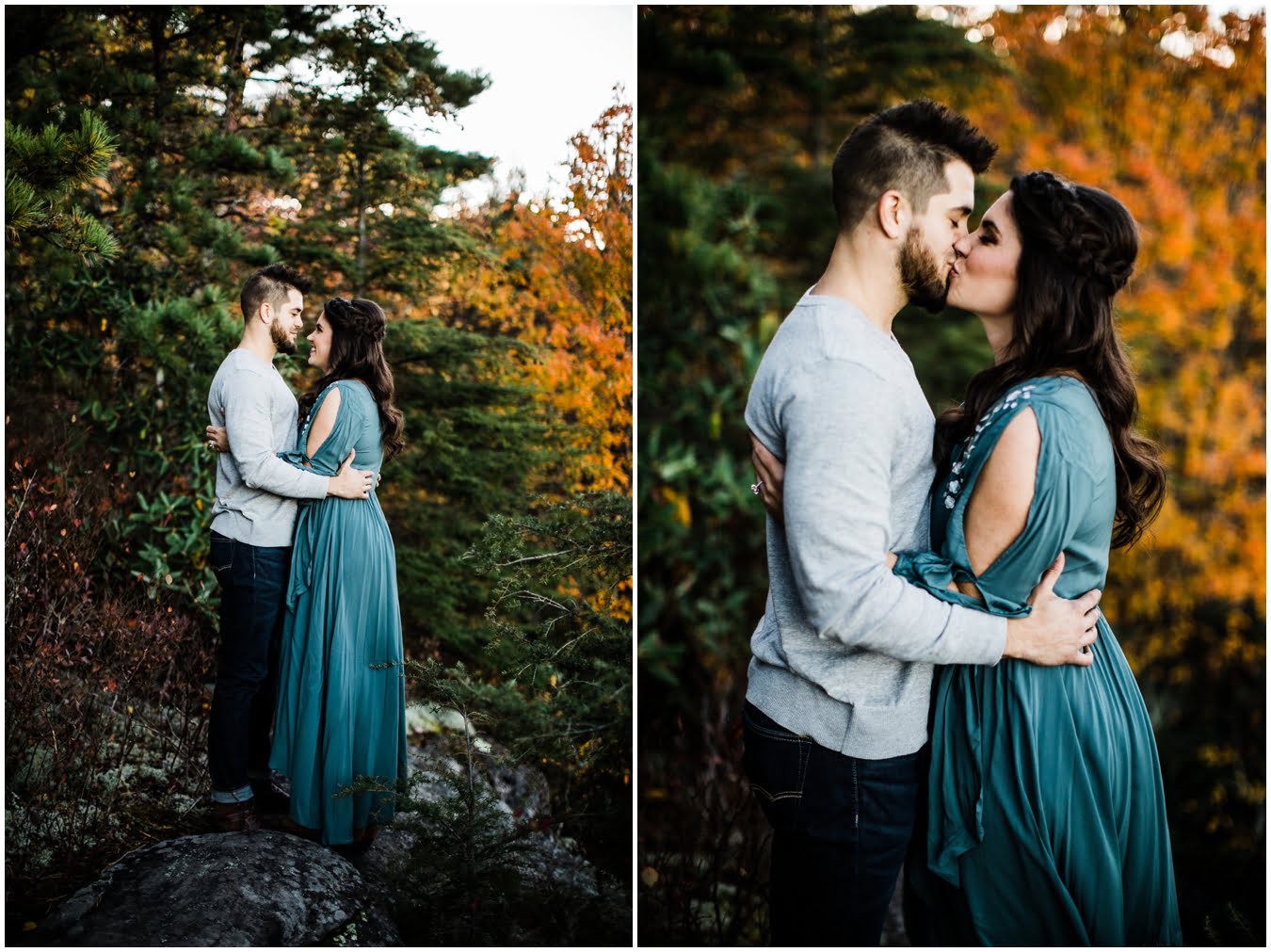 I had the best time with Stew+Krause on their epic mountain engagement shoot. The fall colors peaked late this year, so even though we were hiking at the end of October, we still had amazing foliage to go with the stunning views. We met up at the trailhead and hiked the mile and a half or so to the top, talking about how they met (she gave him a fake name at first!), their Asheville elopement plans for next June (spoiler alert, it involves glamping), and bad dates (none of which they had been on with each other). When we got to the top of the mountain, the sun was just reaching the edge of a cloud bank, drenching the cliffs with golden light. After a rest and a celebratory trail beer, we set to exploring the cliffs and crags as the sun sank lower. The wind picked up and whipped around us, tossing the skirt of Stew’s dress around and creating the perfect scene. These two were such troopers, pulling out a blanket to snuggle in as it got colder and colder. We eventually made our way back down the trail in the dark, in awe of the landscape we had just witnessed.