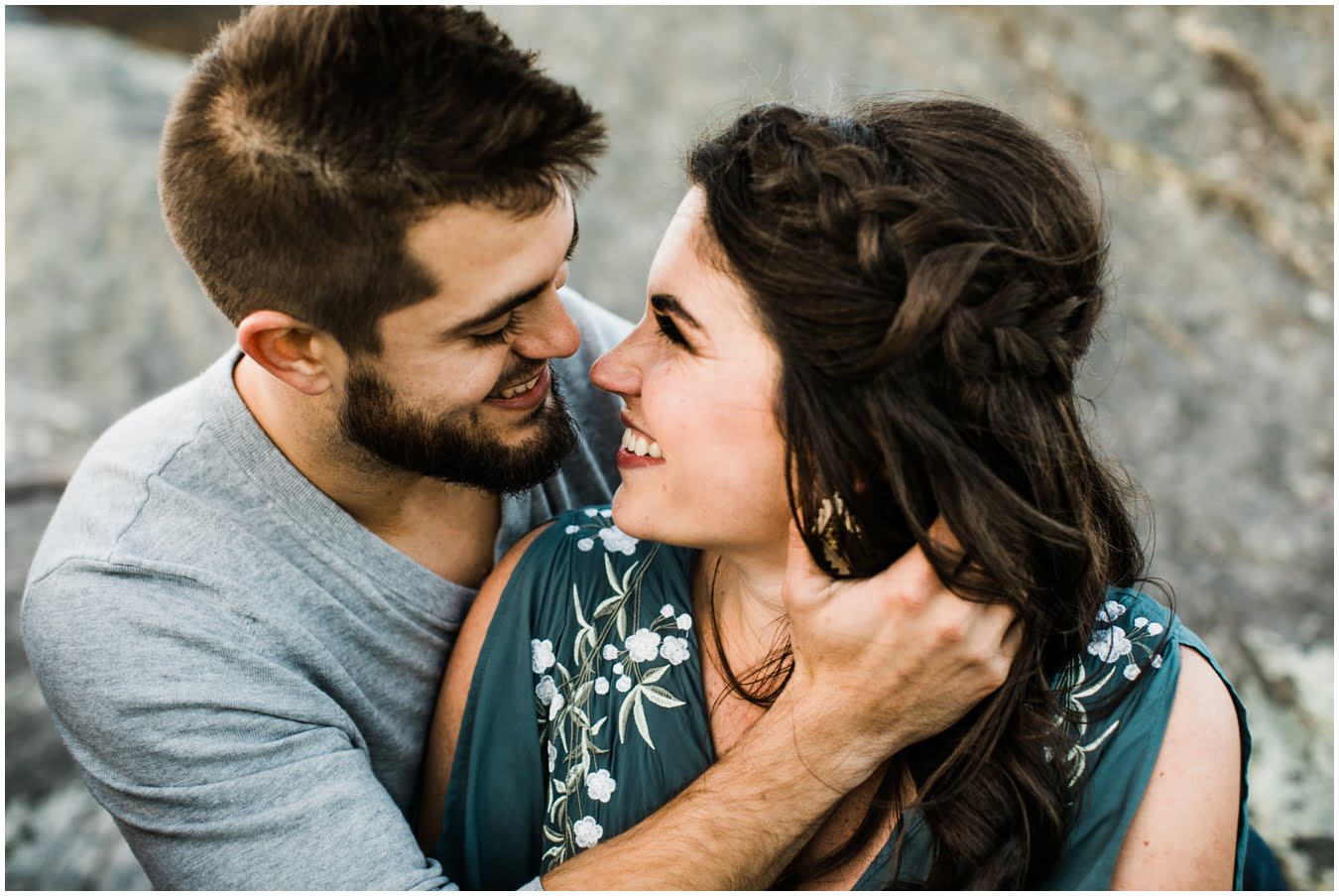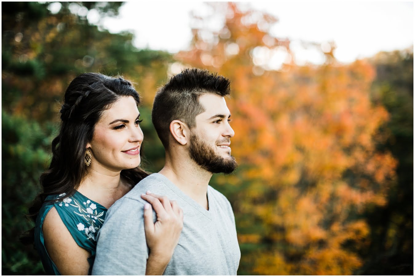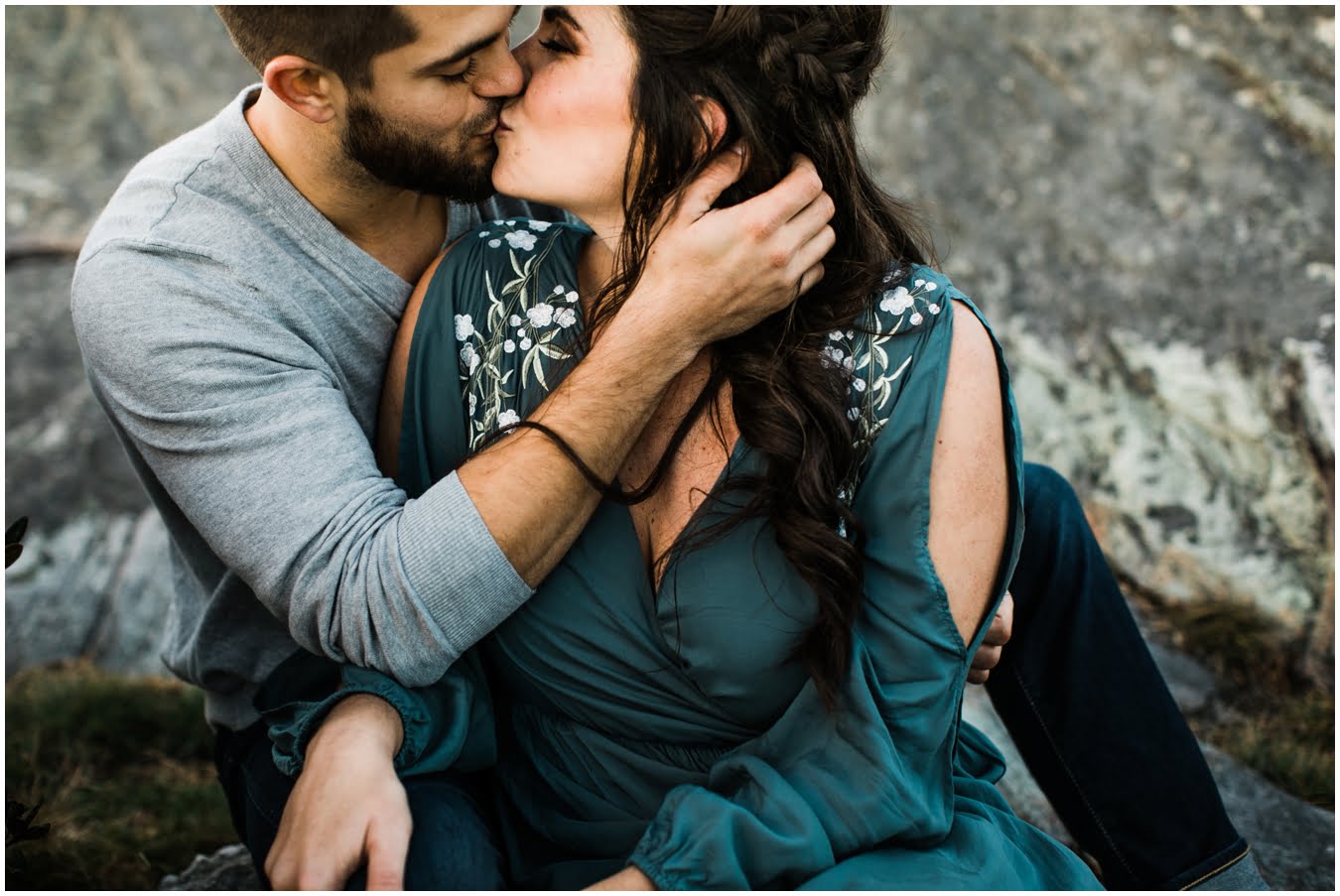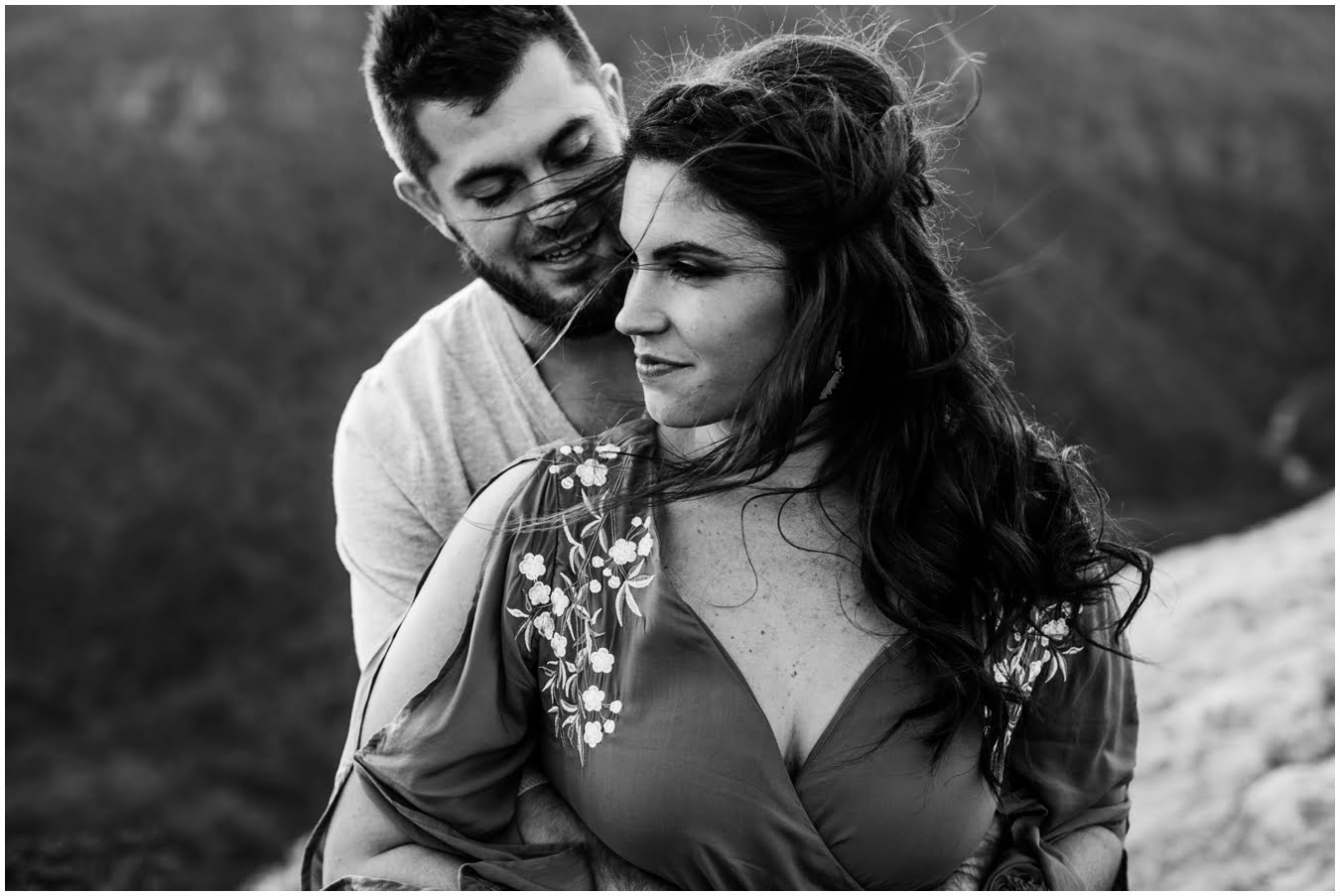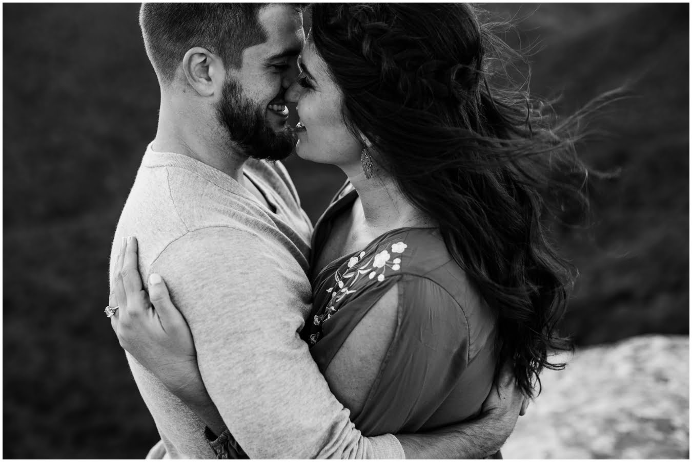 I had the best time with Stew+Krause on their epic mountain engagement shoot. The fall colors peaked late this year, so even though we were hiking at the end of October, we still had amazing foliage to go with the stunning views. We met up at the trailhead and hiked the mile and a half or so to the top, talking about how they met (she gave him a fake name at first!), their Asheville elopement plans for next June (spoiler alert, it involves glamping), and bad dates (none of which they had been on with each other). When we got to the top of the mountain, the sun was just reaching the edge of a cloud bank, drenching the cliffs with golden light. After a rest and a celebratory trail beer, we set to exploring the cliffs and crags as the sun sank lower. The wind picked up and whipped around us, tossing the skirt of Stew’s dress around and creating the perfect scene. These two were such troopers, pulling out a blanket to snuggle in as it got colder and colder. We eventually made our way back down the trail in the dark, in awe of the landscape we had just witnessed.