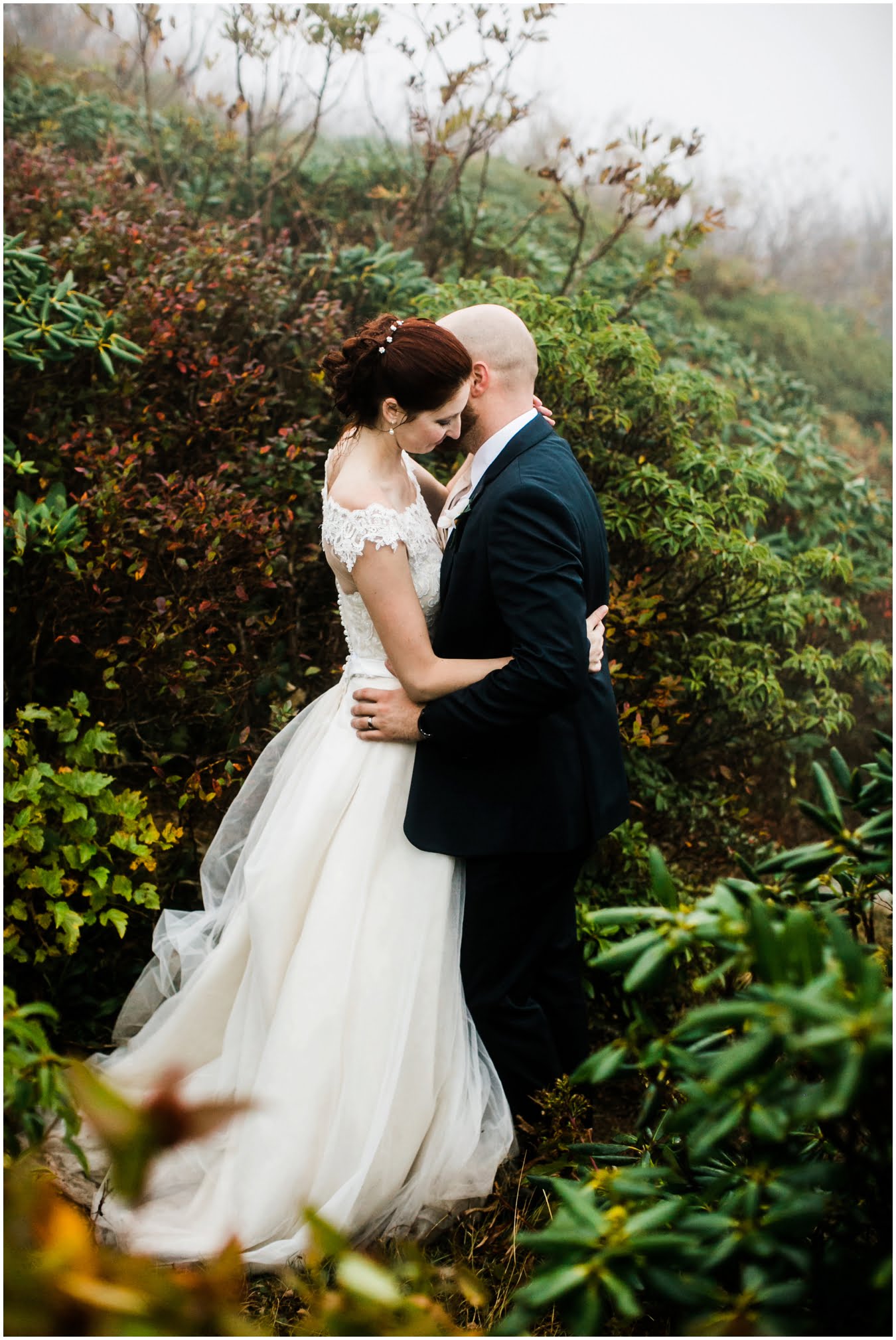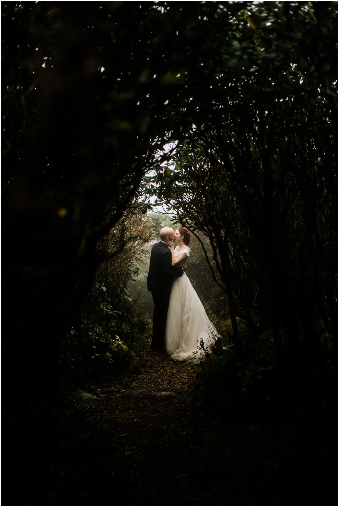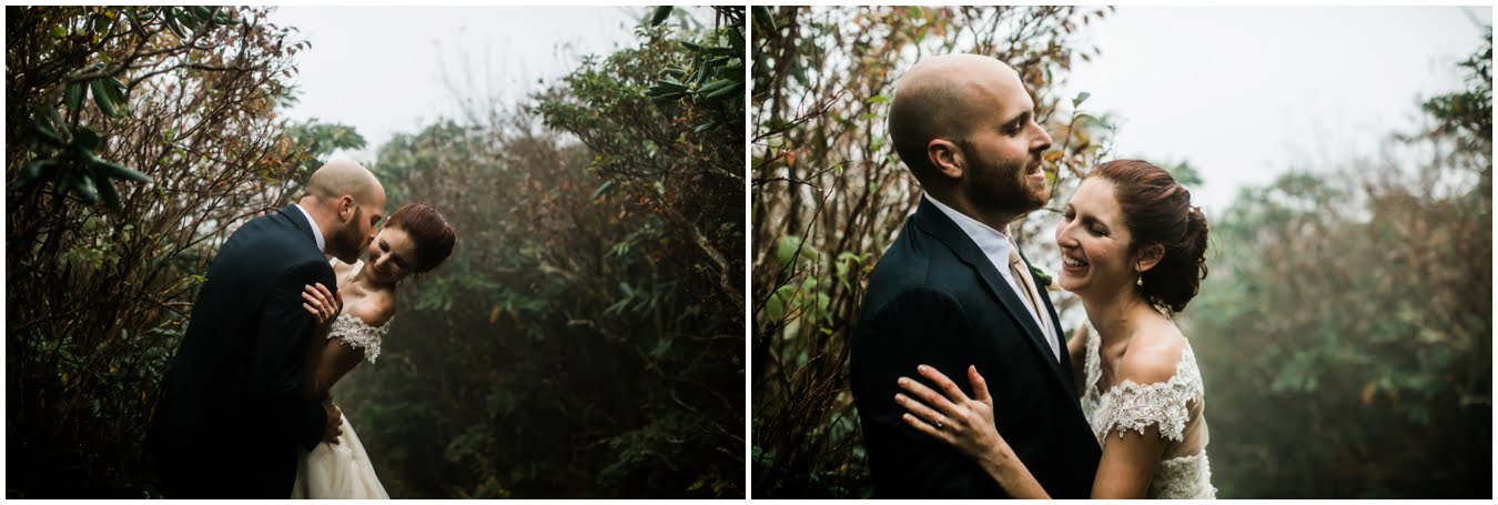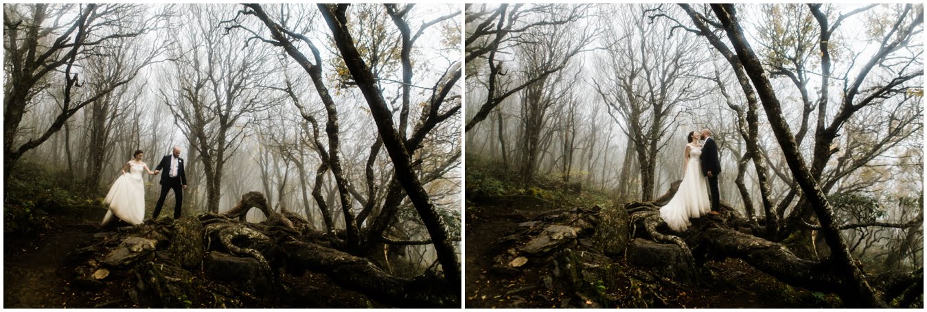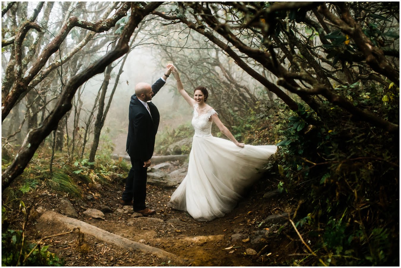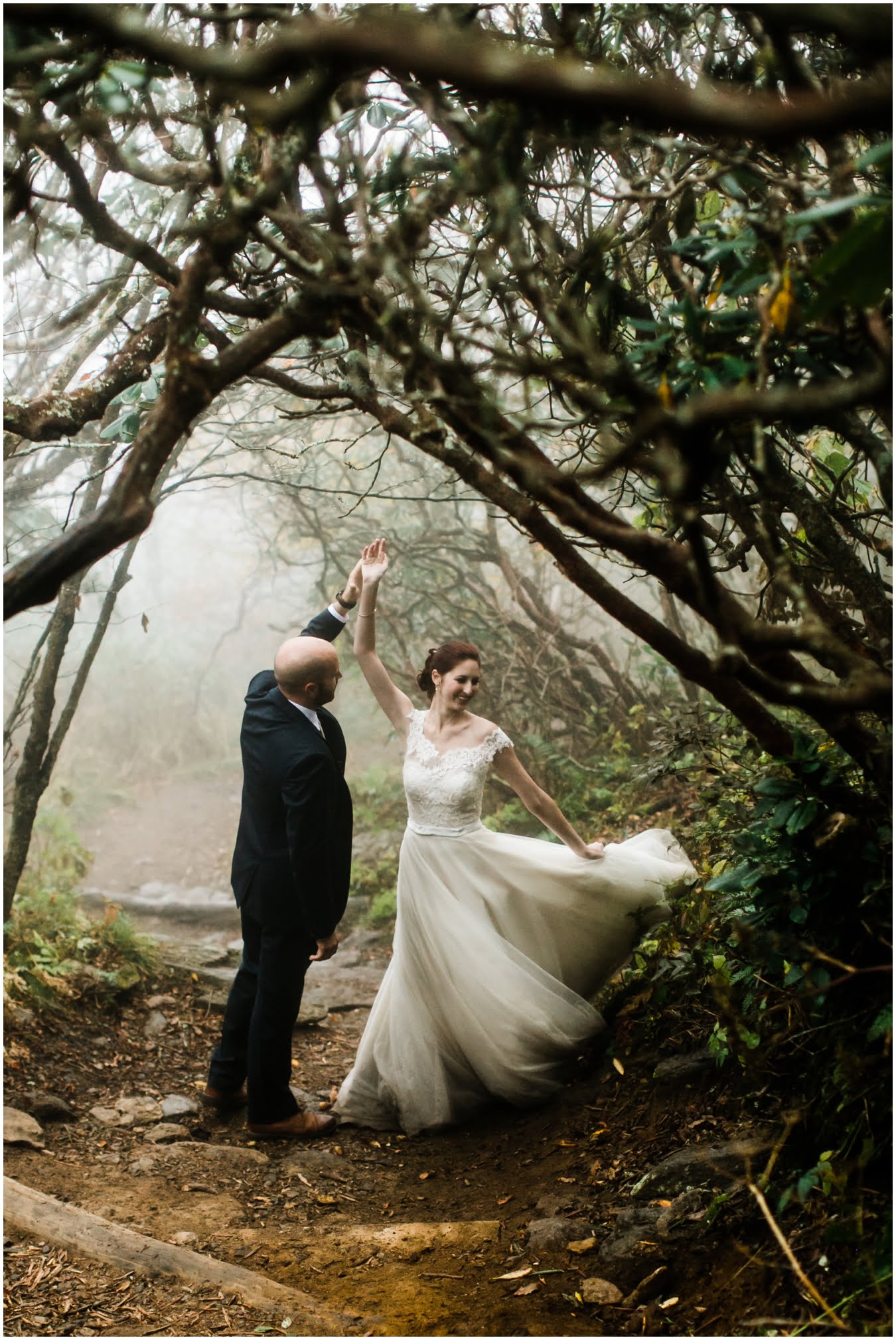 {As we were coming back down the mountain, I had Shane twirl Heather in a tunnel of rhododendrons. Her skirt flared out perfectly and the mist swirled around them and I gasped “This is SO Jane Austen”. Heather squealed happily but Shane paused, confused, and said “Isn’t that the chimpanzee lady?” We all had a good laugh declaring “OMG this is SO Jane Goodall” for the rest of the shoot whenever something great happened. I love love love working with clients I can laugh with!}
