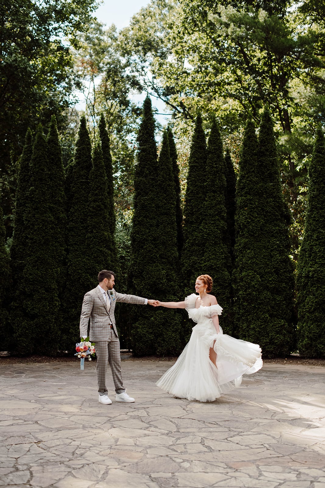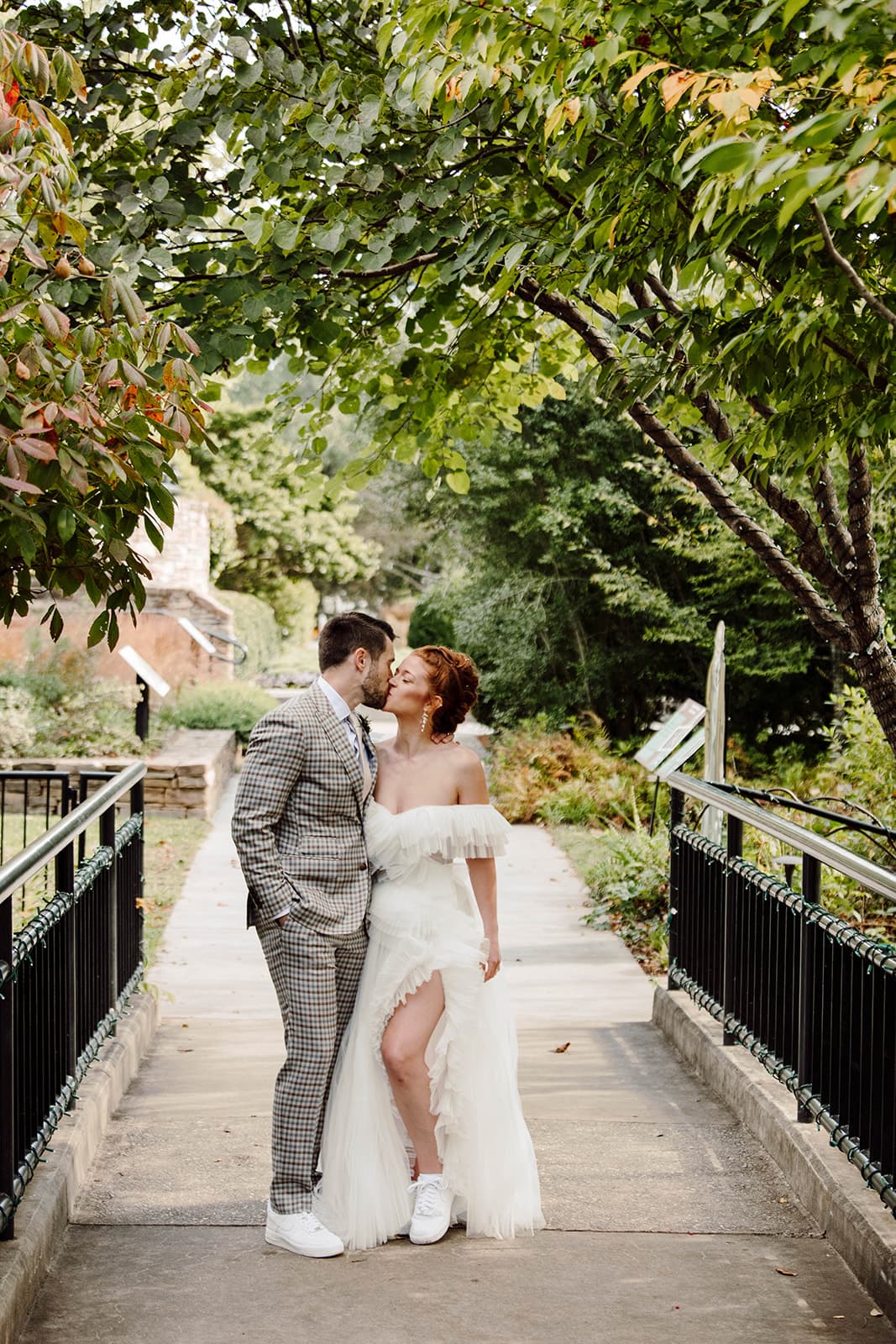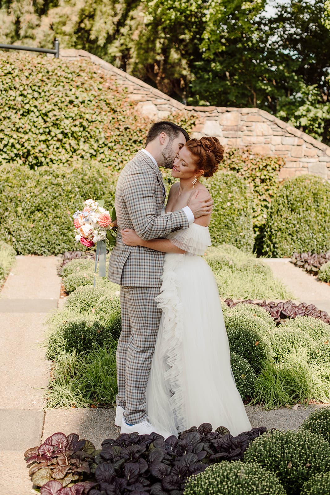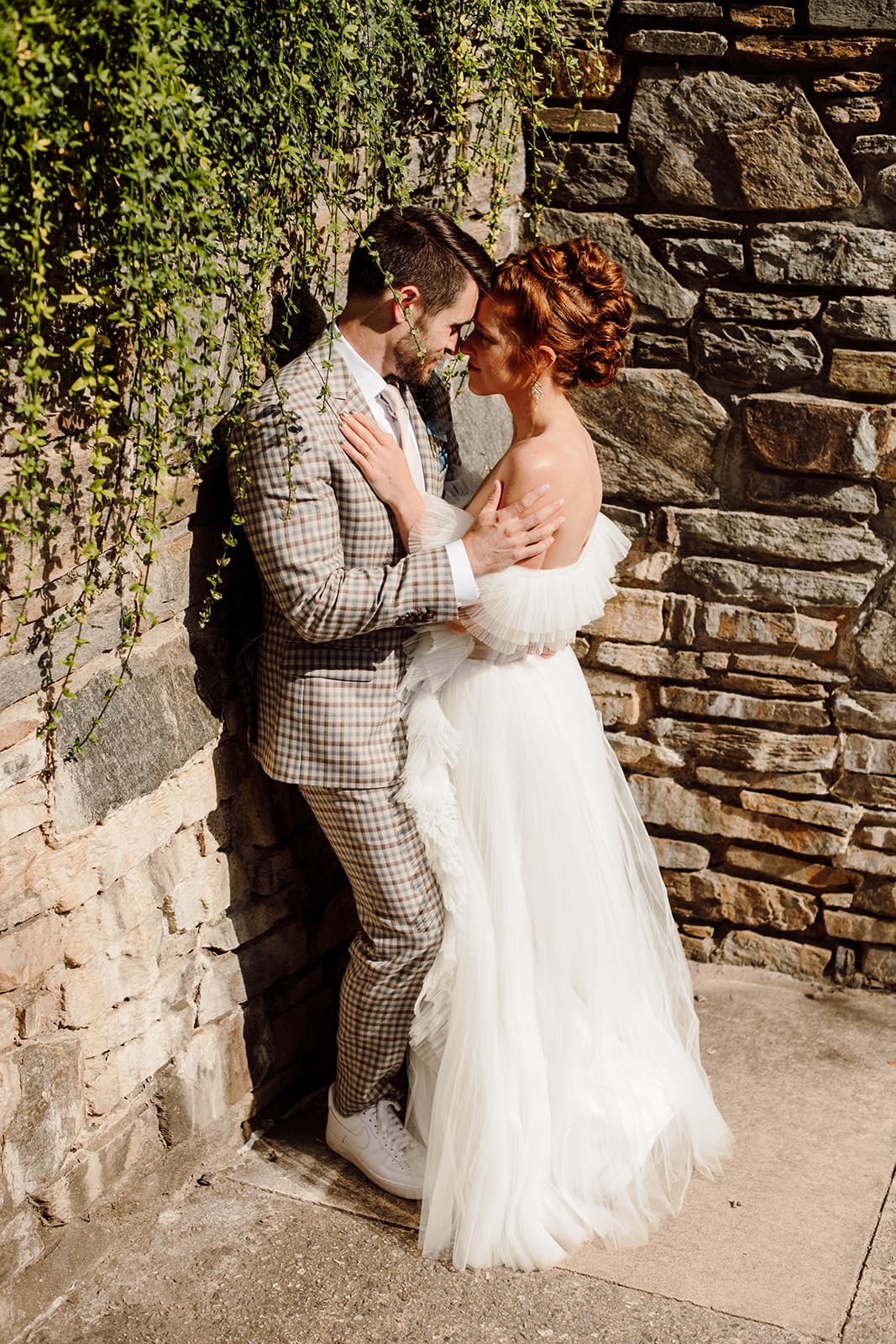 The day began with the morning sun streaming through the trees at the North Carolina Arboretum. The air was filled with anticipation as the two were about to see each other in a private and intimate setting for the first time on their wedding day. Julie, having prepped at Powder Me Pretty’s chic downtown Asheville studio, looked incredible with her non-traditional knotted faux-haux updo and layered wedding dress. Ryan, who had spent his morning at a cozy Airbnb getting ready with his closest friends, was the epitome of charm.