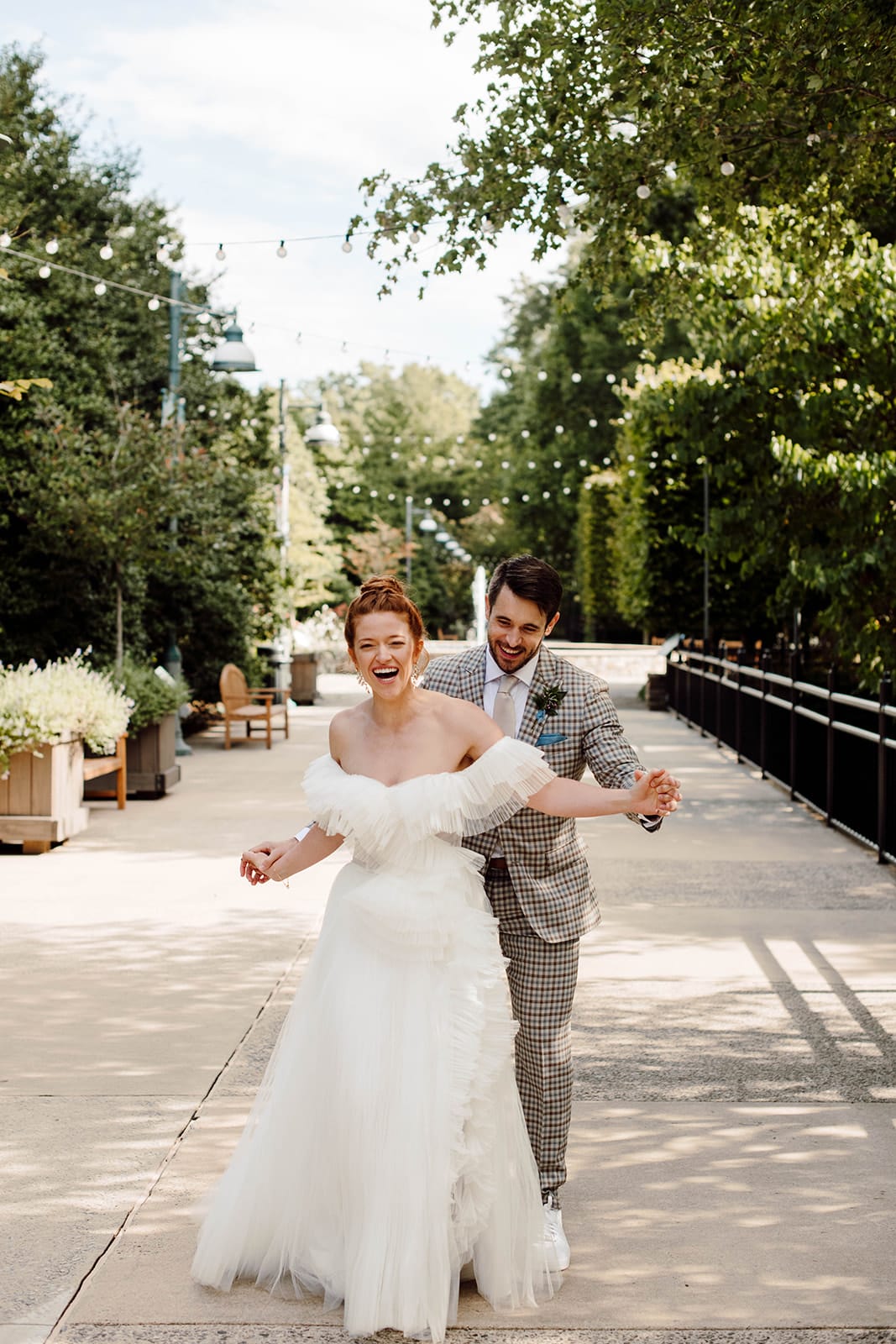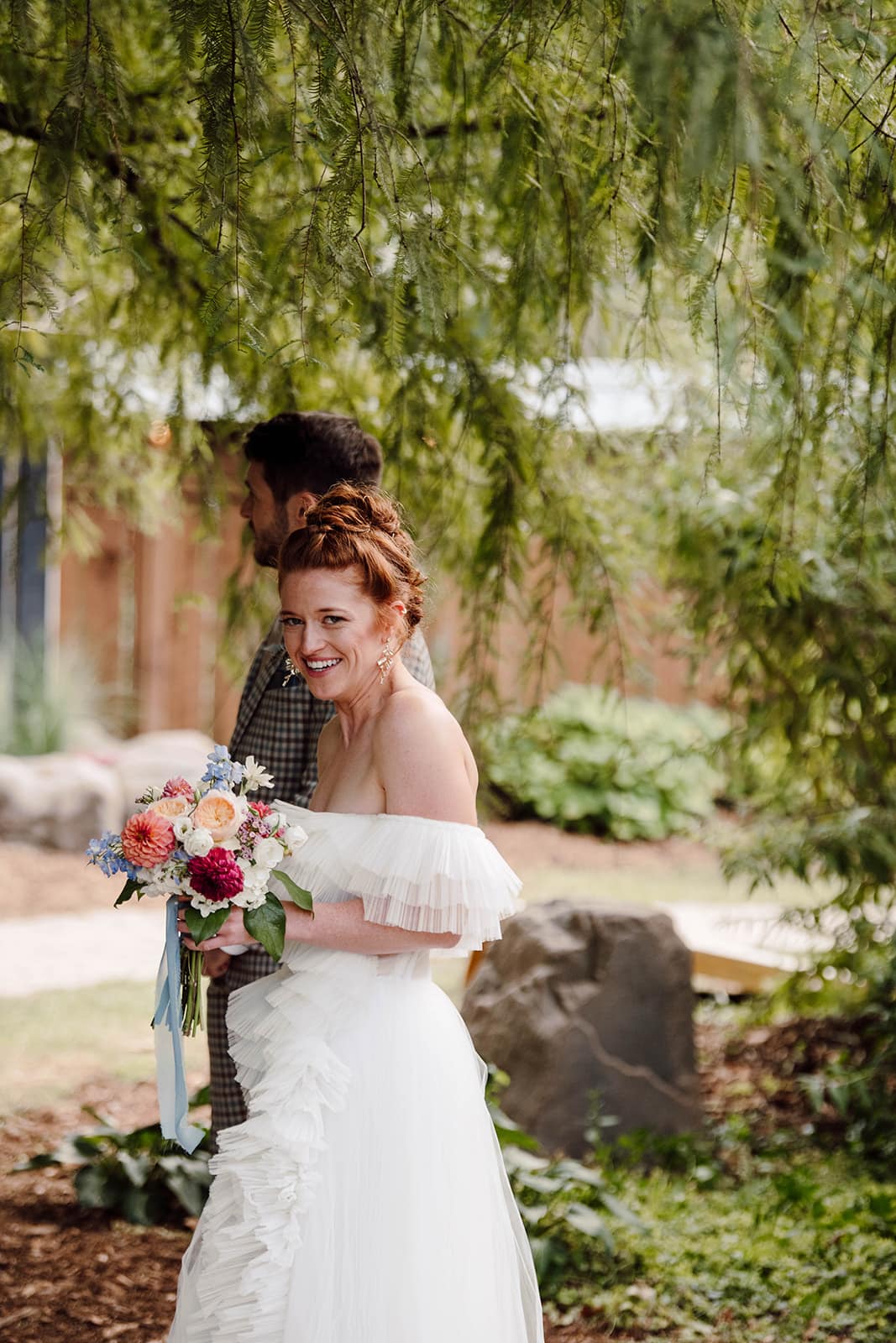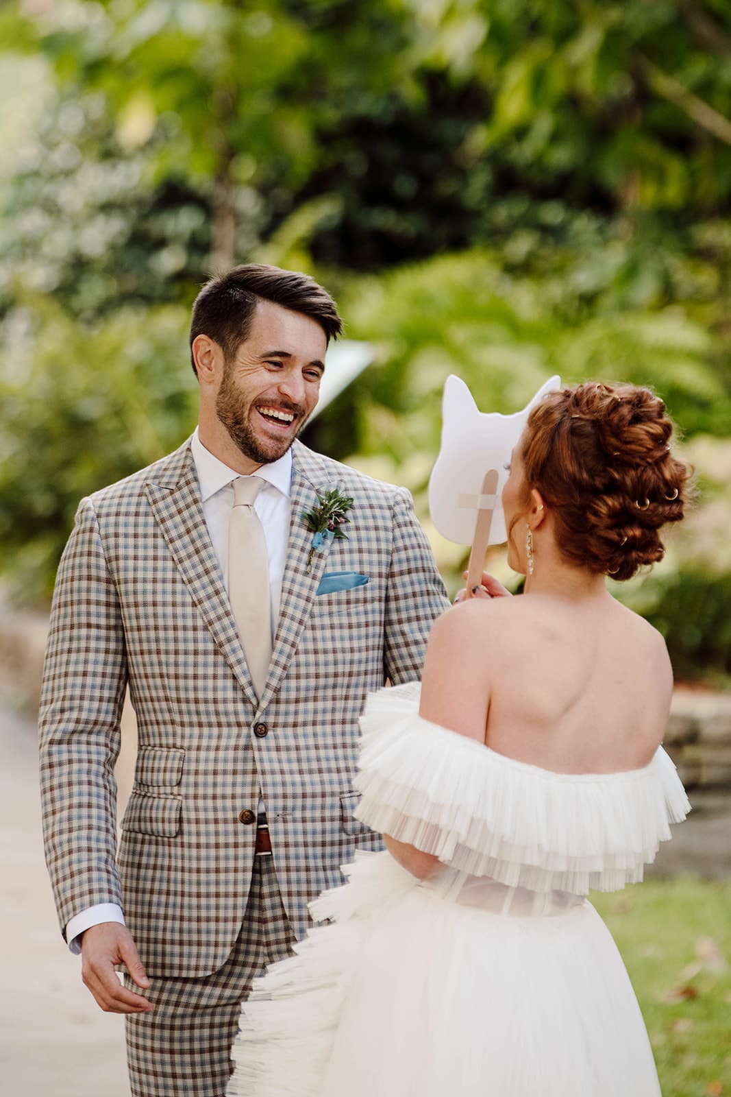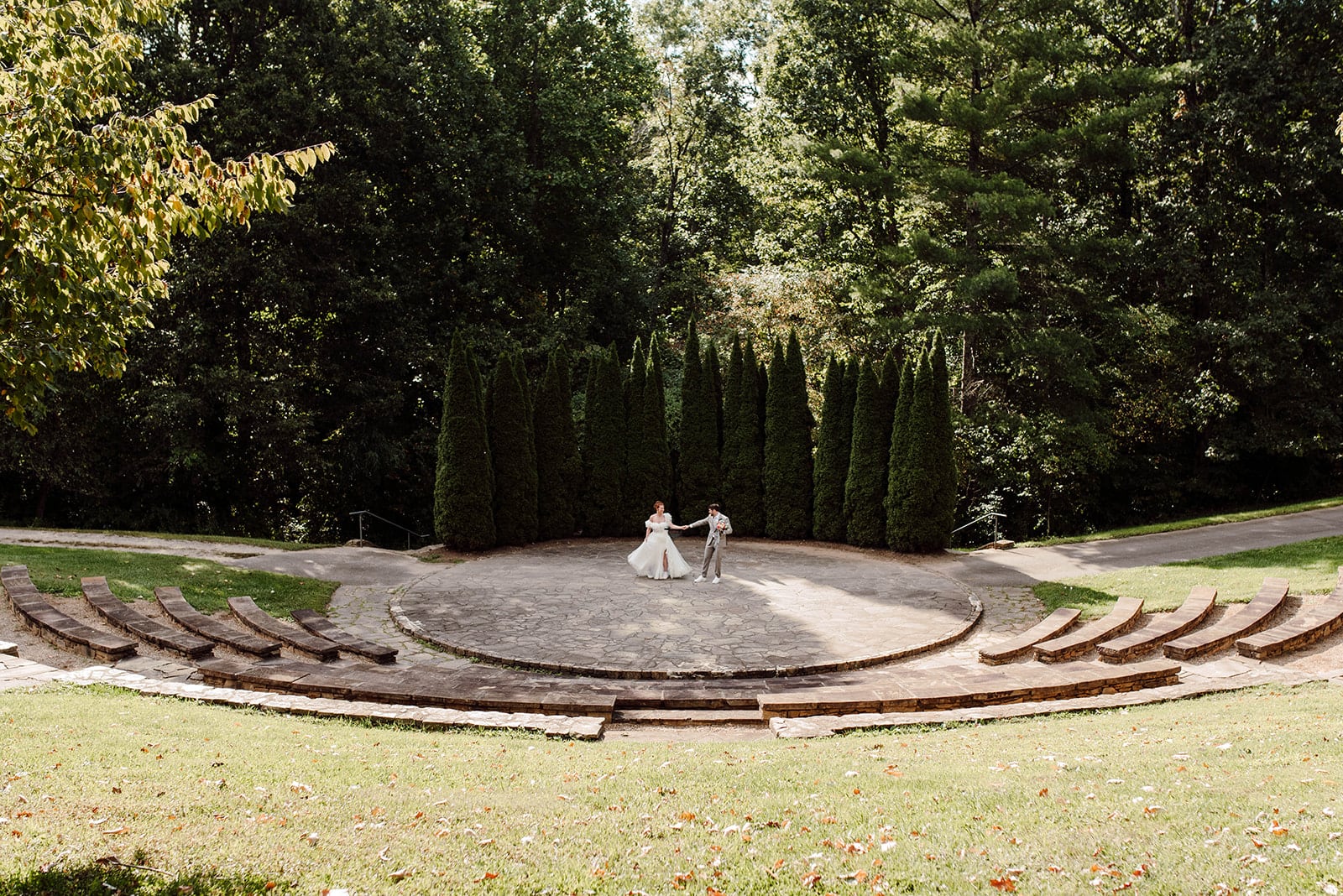 The day began with the morning sun streaming through the trees at the North Carolina Arboretum. The air was filled with anticipation as the two were about to see each other in a private and intimate setting for the first time on their wedding day. Julie, having prepped at Powder Me Pretty’s chic downtown Asheville studio, looked incredible with her non-traditional knotted faux-haux updo and layered wedding dress. Ryan, who had spent his morning at a cozy Airbnb getting ready with his closest friends, was the epitome of charm.