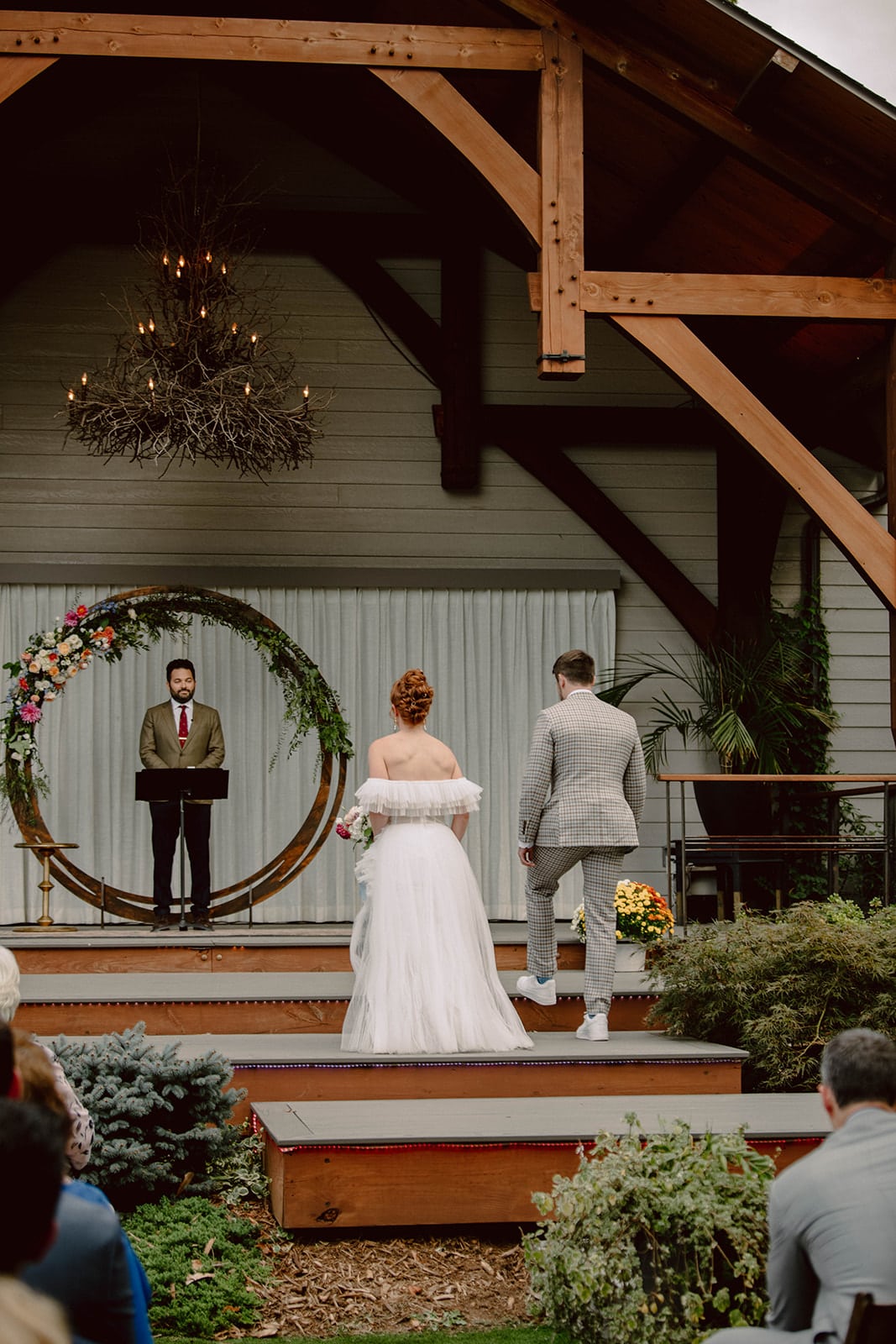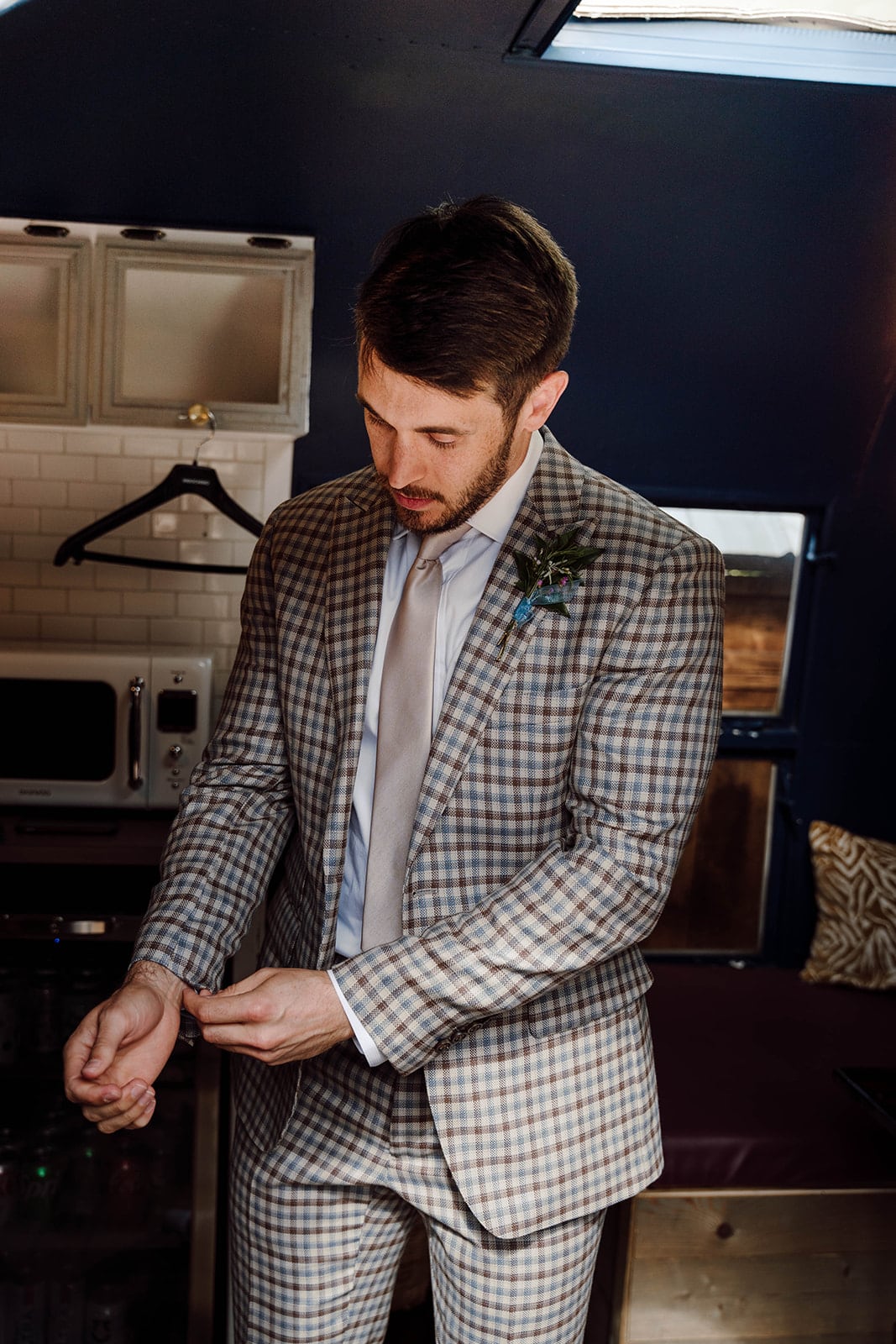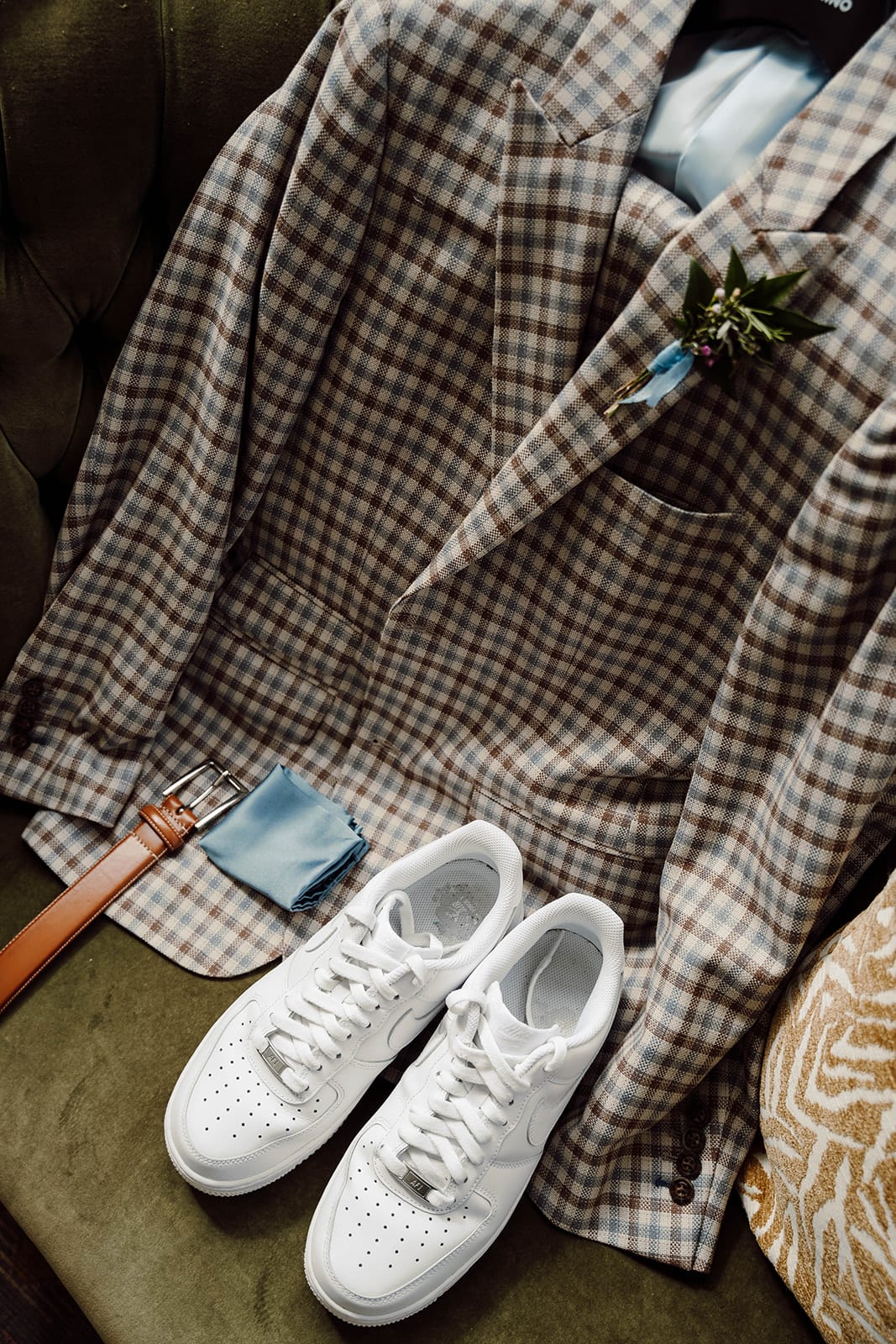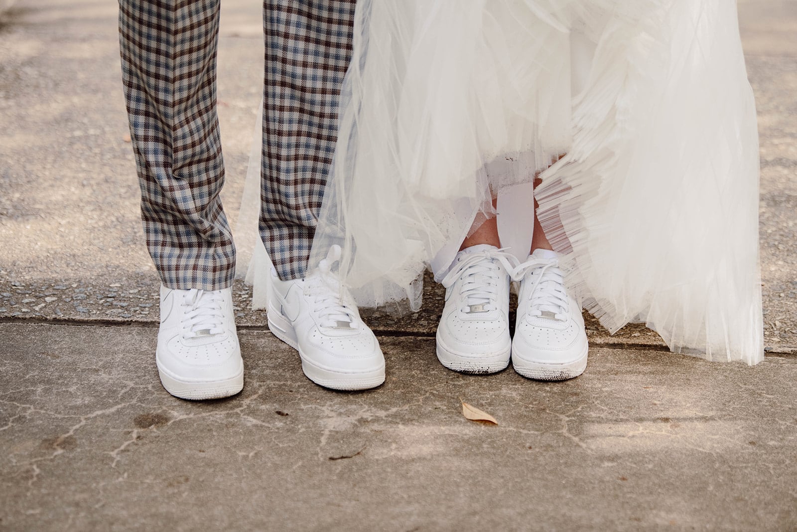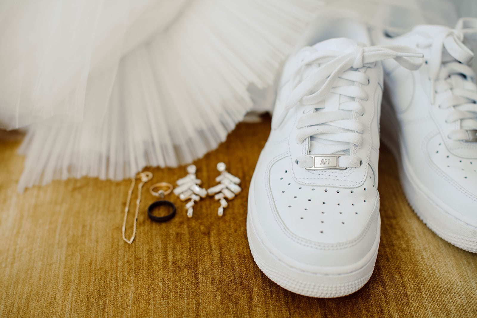 Fast forward to the afternoon at Haiku I Do. Julie slipped back into her mesmerizing wedding dress (designed just for her by Tarik Ediz) in the bridal suite, her excitement palpable. Meanwhile, Ryan donned his custom cream/blue/brown suit in the airstream, a special touch embroidered on the suit’s inside: their wedding date. And oh, the shoes! Julie and Ryan opted to eschew traditional wedding day footwear in favor of a fashion statement: matching White Air Force 1s.