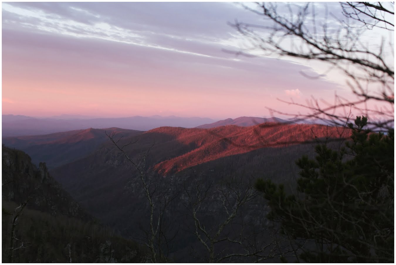 There are moments in my current place in life where I just do not appreciate the job that I have. Afternoons where I’ve been home alone for hours, scrolling through Facebook and generally procrastinating where I almost wish for a 9-5, with coworkers and a break room and maybe even a cubicle. But then I have mornings like last Sunday…and I realize anew just how blessed I am to do what I do. At 7am I found myself hiking up a closed access road in the Blue Ridge mountains in the pre-dawn darkness, bound for a shadowy summit towering over my head in the gloom. I had been on the road since 5am, chasing the sunrise east down 1-40 from Asheville. I had to get there early, you see, for something very special was to happen on that mountain top just after the sun cleared the horizon.