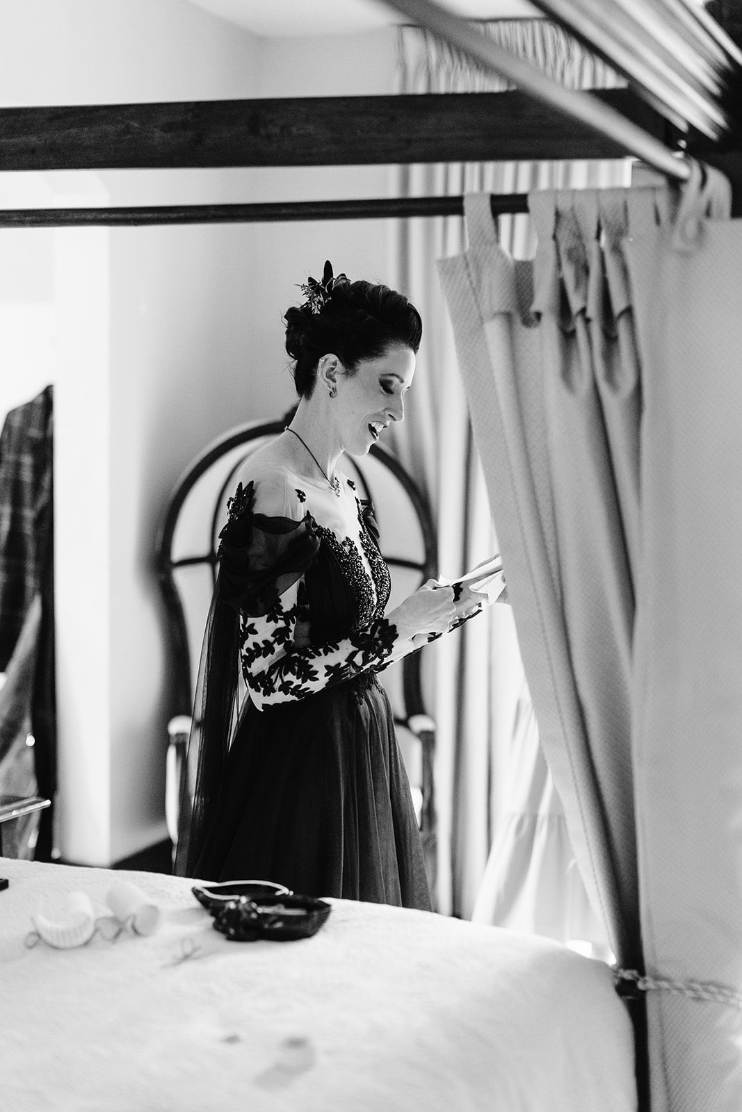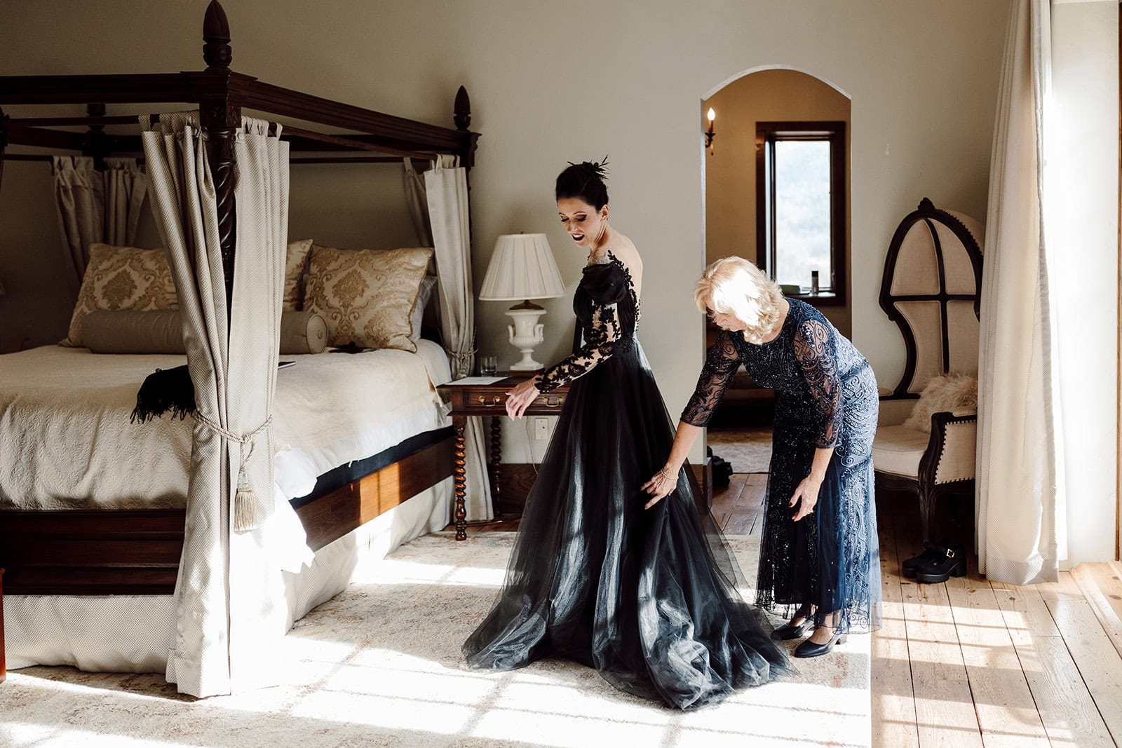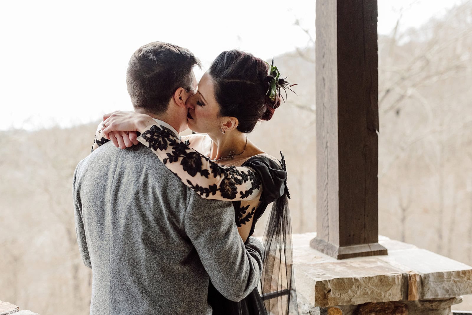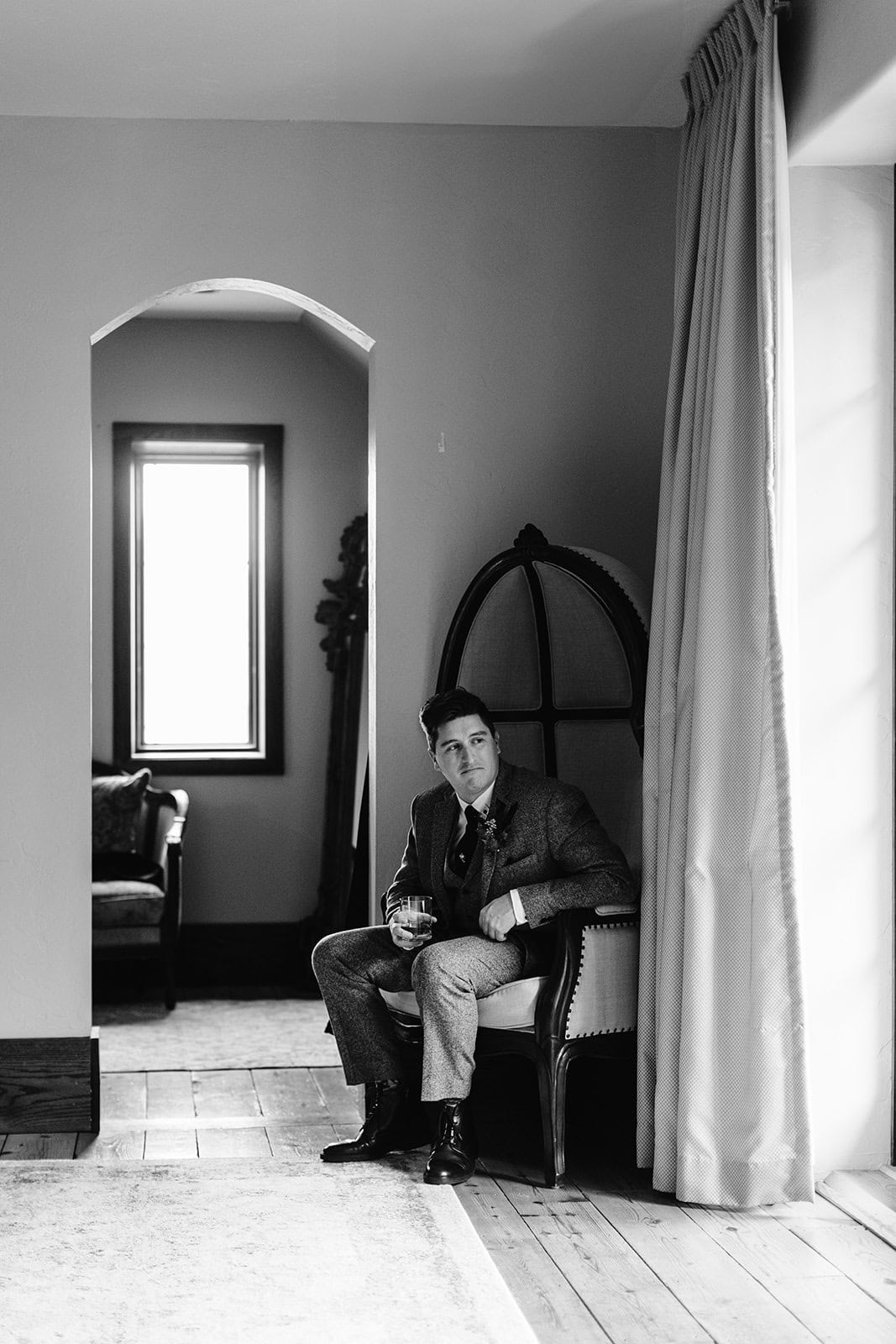 As we arrived at Castle Ladyhawke, the halls buzzed quietly with anticipation. Gavin and his gents were downstairs suiting up, while upstairs Lisa prepared in the light-filled Ladyhawke Suite. The castle itself offered no shortage of backdrops: a spiral staircase, tower alcoves, antique furnishings, and misty mountain views that only added to the winter romance.