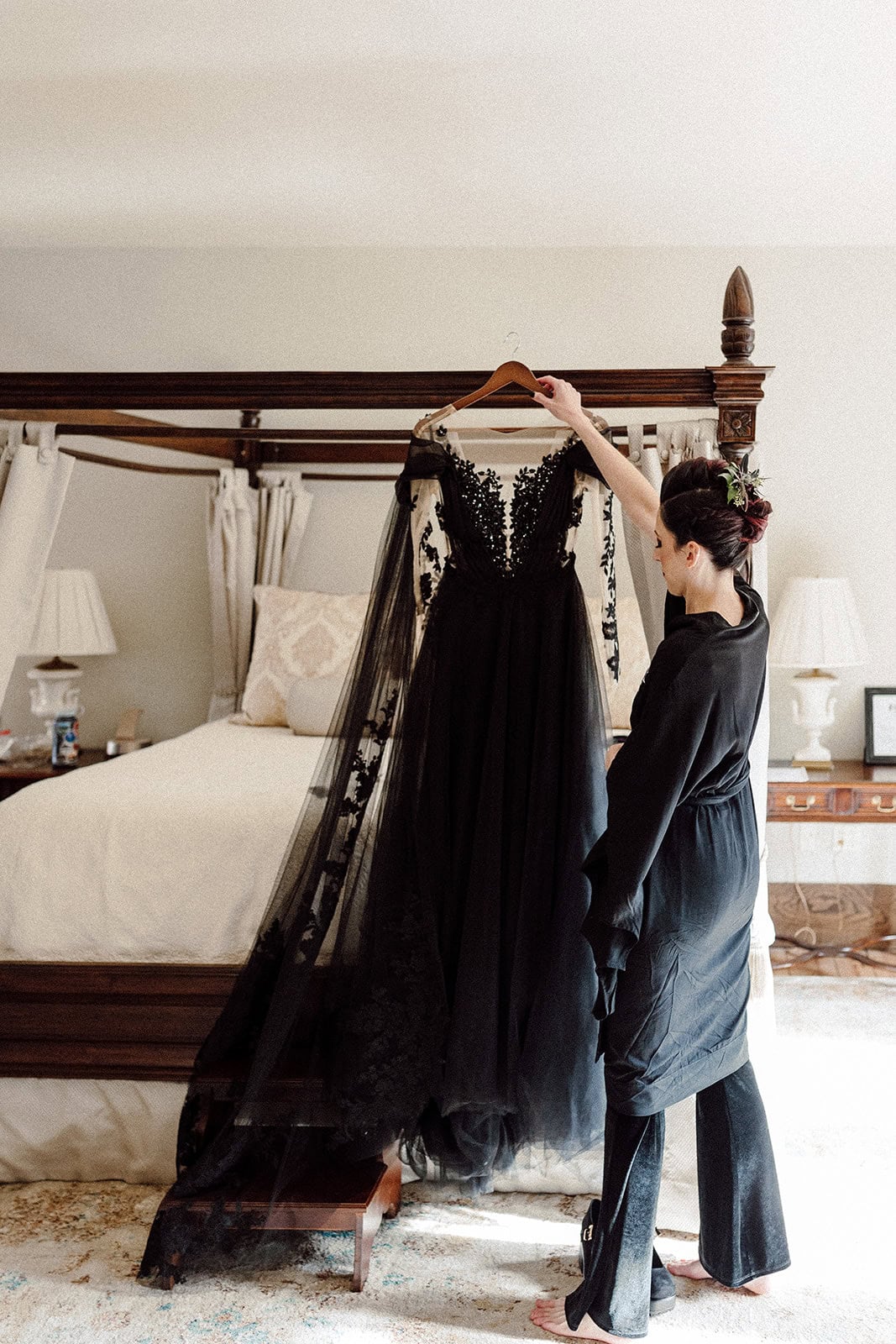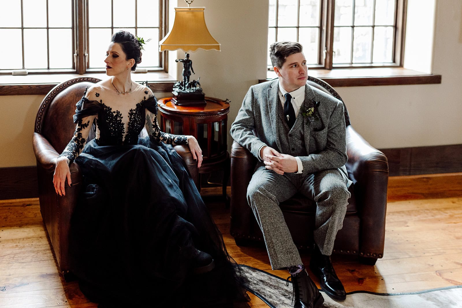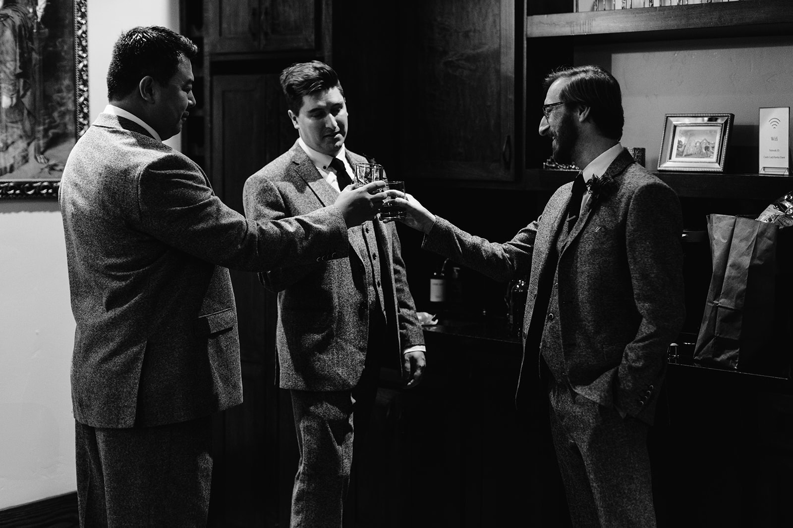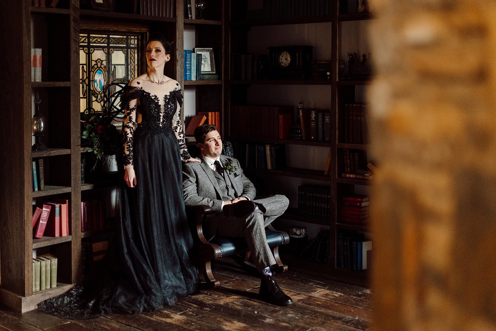 As we arrived at Castle Ladyhawke, the halls buzzed quietly with anticipation. Gavin and his gents were downstairs suiting up, while upstairs Lisa prepared in the light-filled Ladyhawke Suite. The castle itself offered no shortage of backdrops: a spiral staircase, tower alcoves, antique furnishings, and misty mountain views that only added to the winter romance.