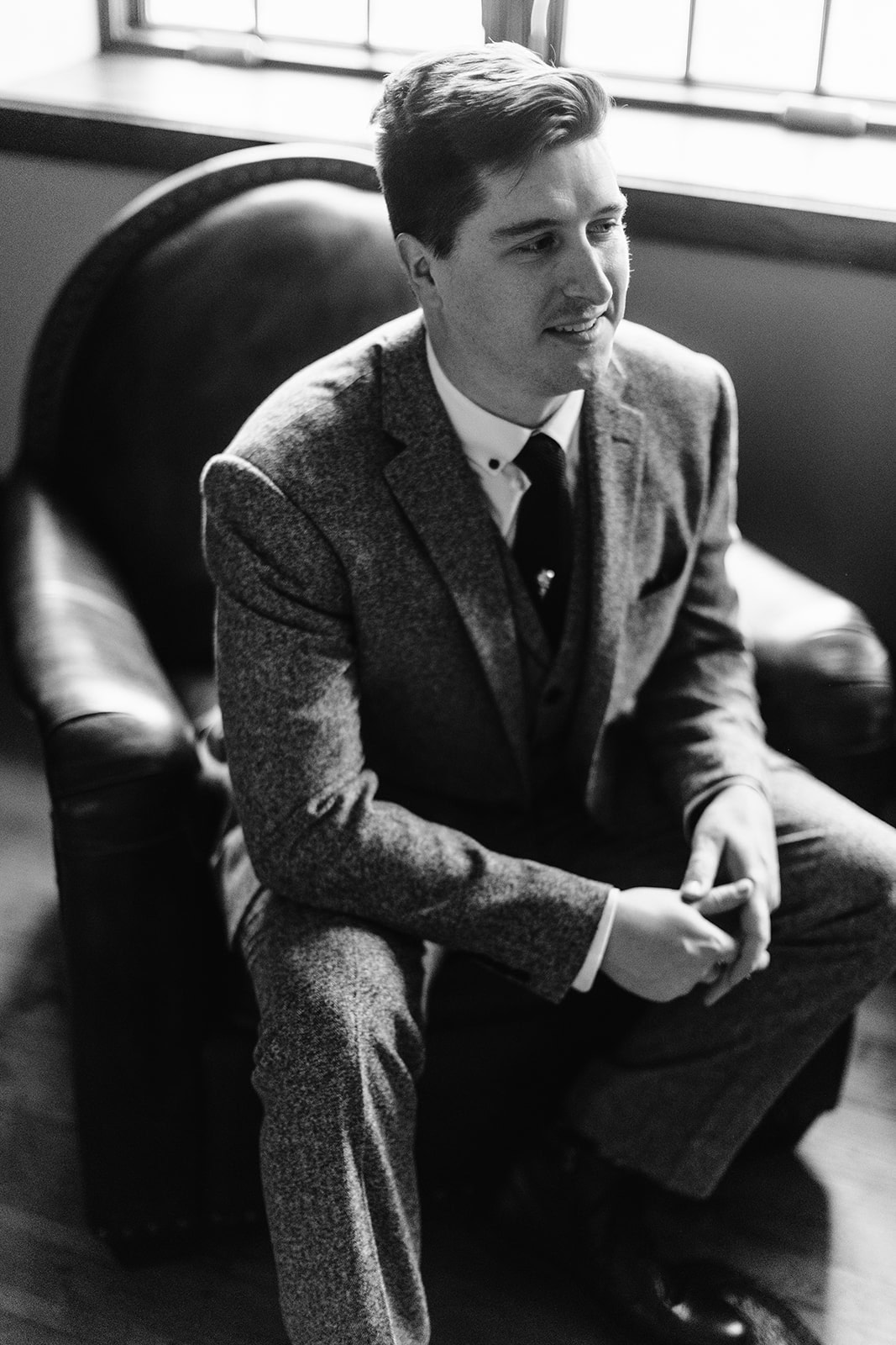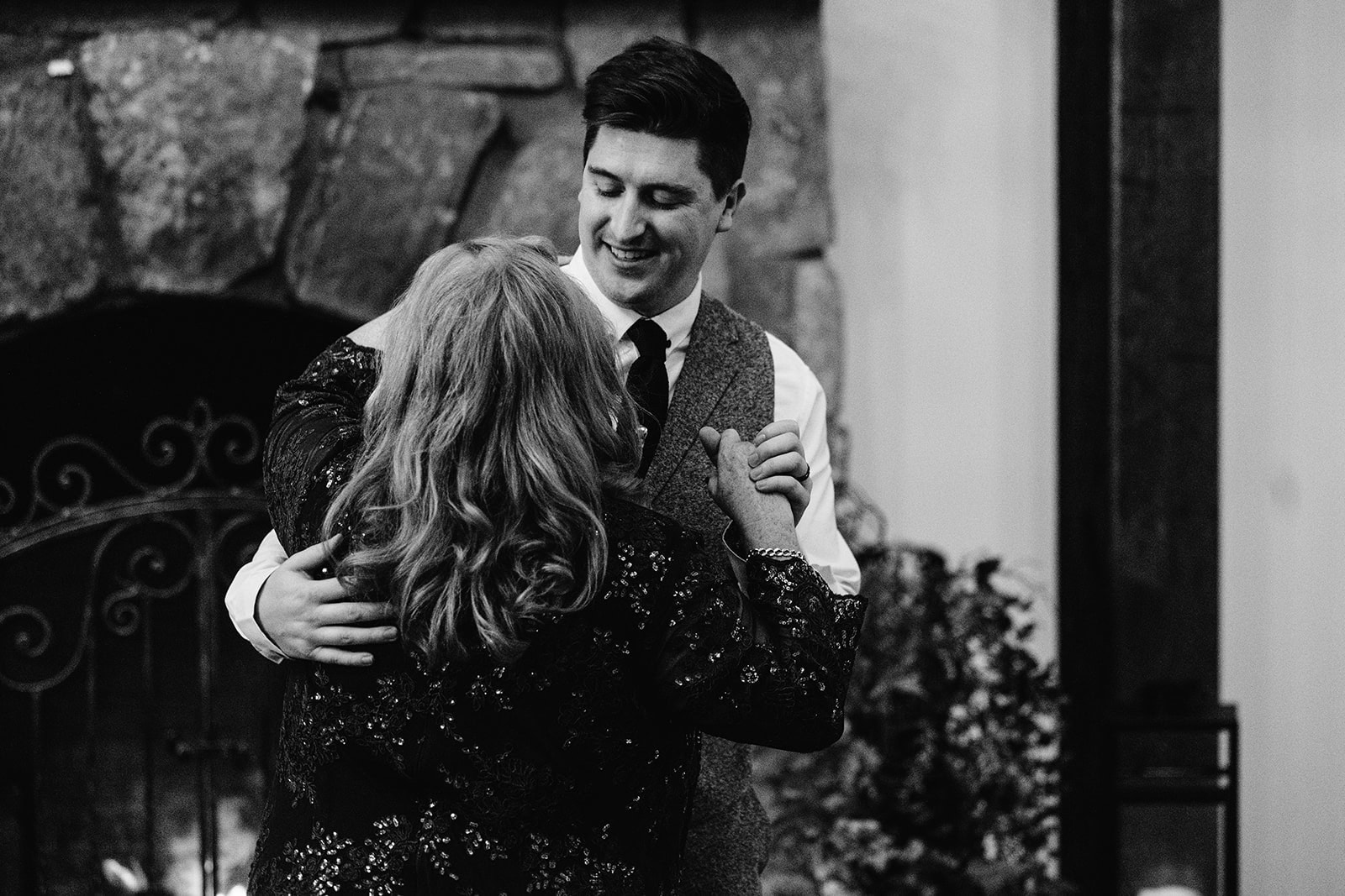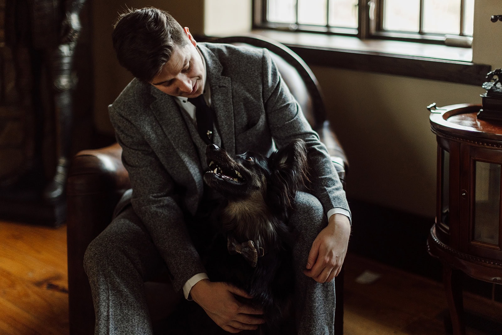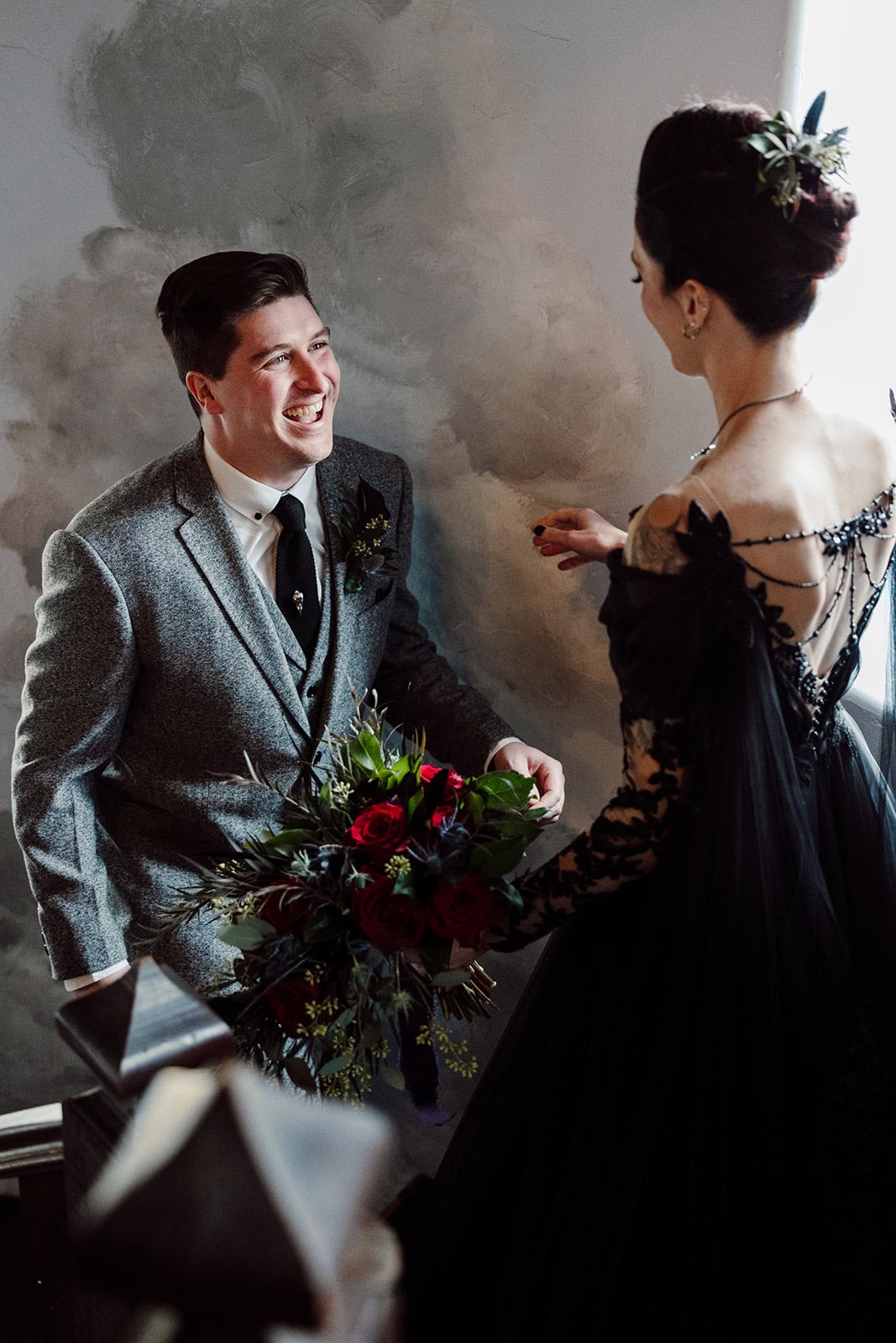 As we arrived at Castle Ladyhawke, the halls buzzed quietly with anticipation. Gavin and his gents were downstairs suiting up, while upstairs Lisa prepared in the light-filled Ladyhawke Suite. The castle itself offered no shortage of backdrops: a spiral staircase, tower alcoves, antique furnishings, and misty mountain views that only added to the winter romance.