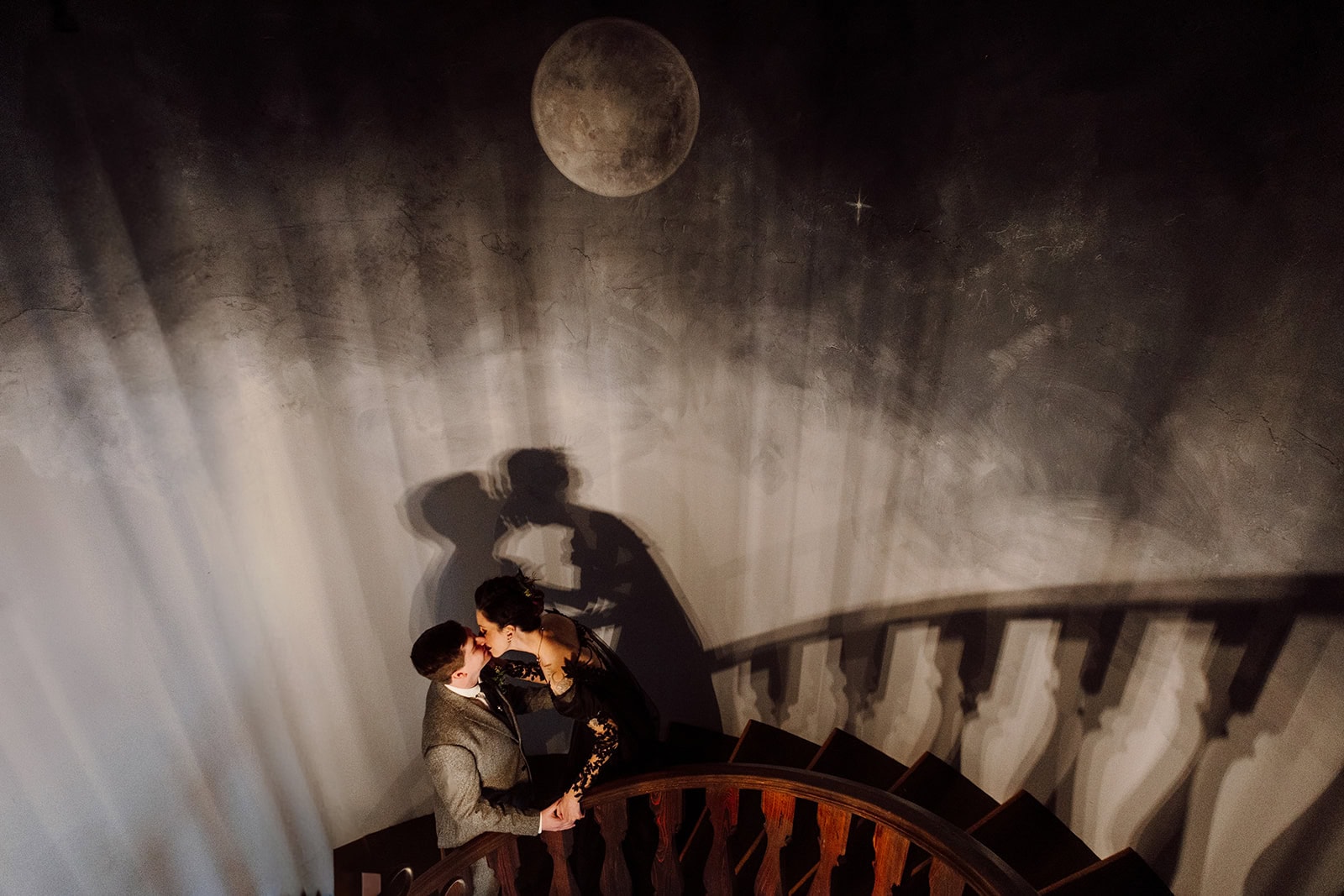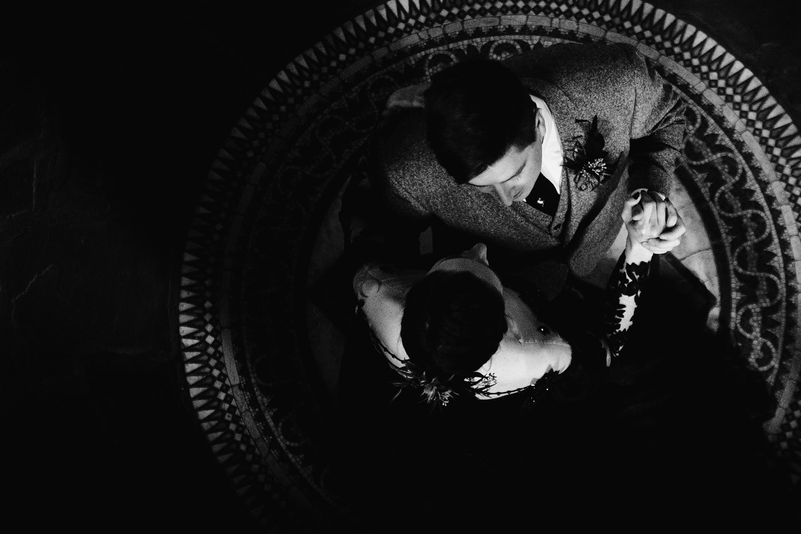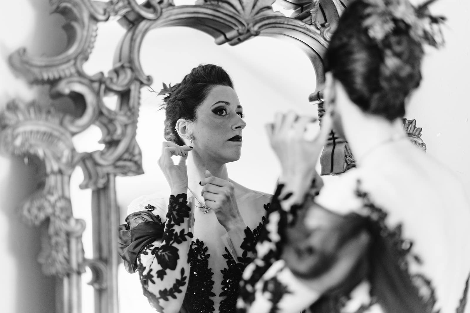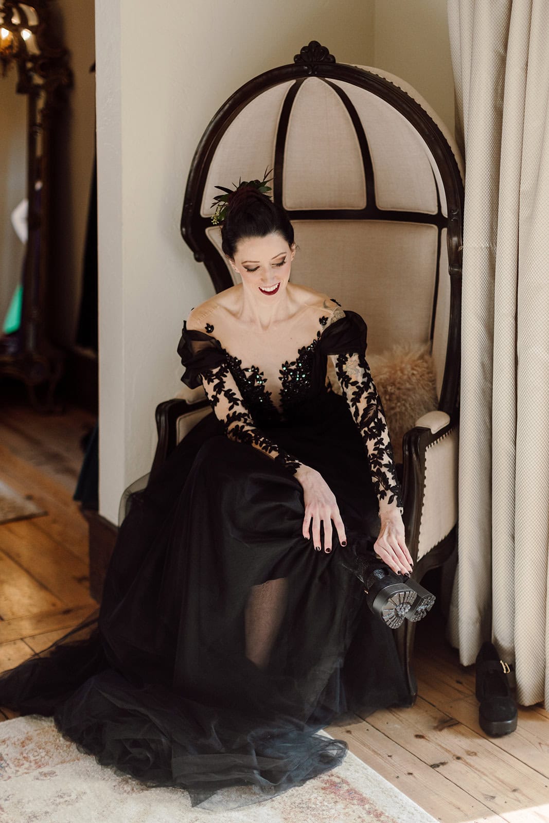 As we arrived at Castle Ladyhawke, the halls buzzed quietly with anticipation. Gavin and his gents were downstairs suiting up, while upstairs Lisa prepared in the light-filled Ladyhawke Suite. The castle itself offered no shortage of backdrops: a spiral staircase, tower alcoves, antique furnishings, and misty mountain views that only added to the winter romance.