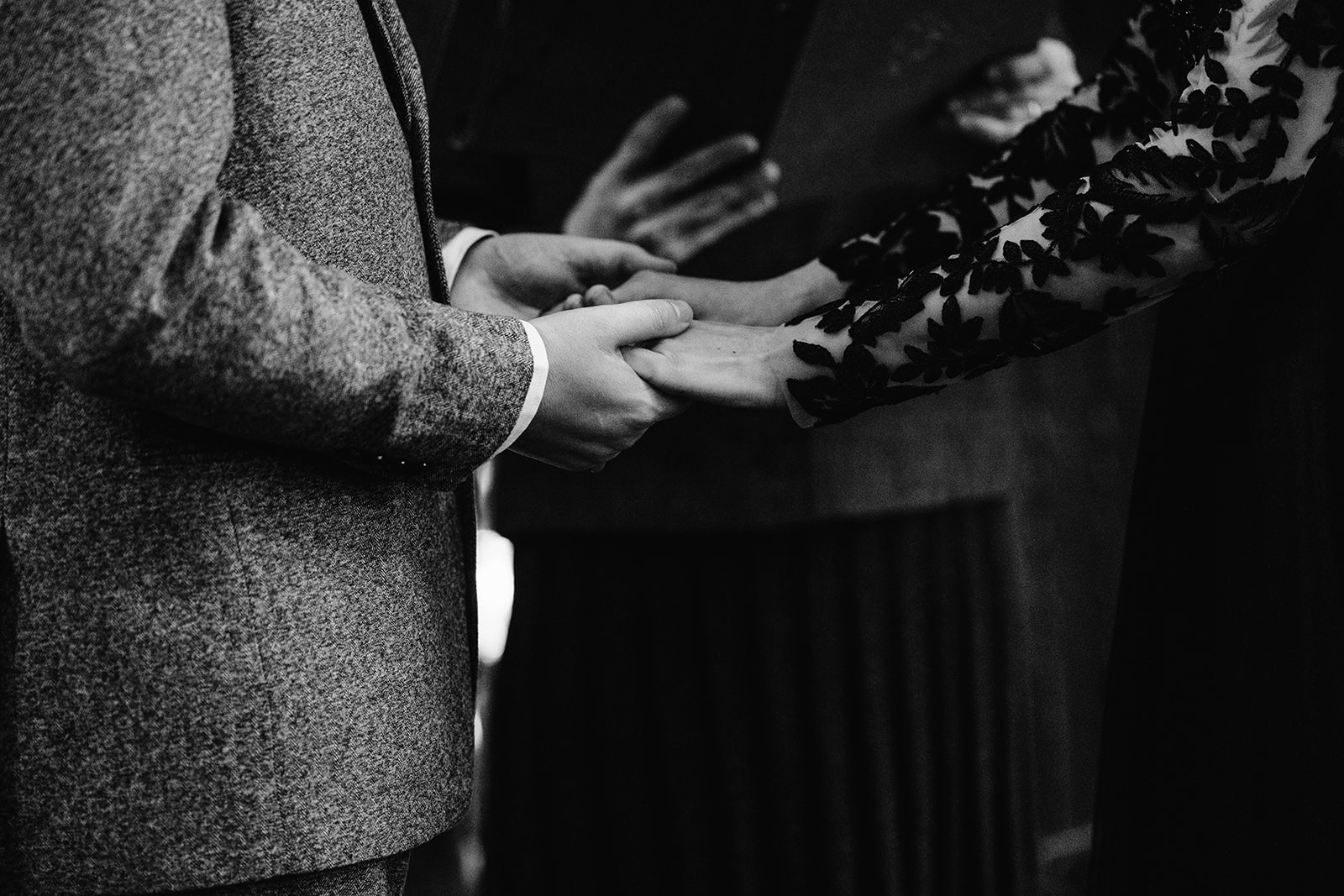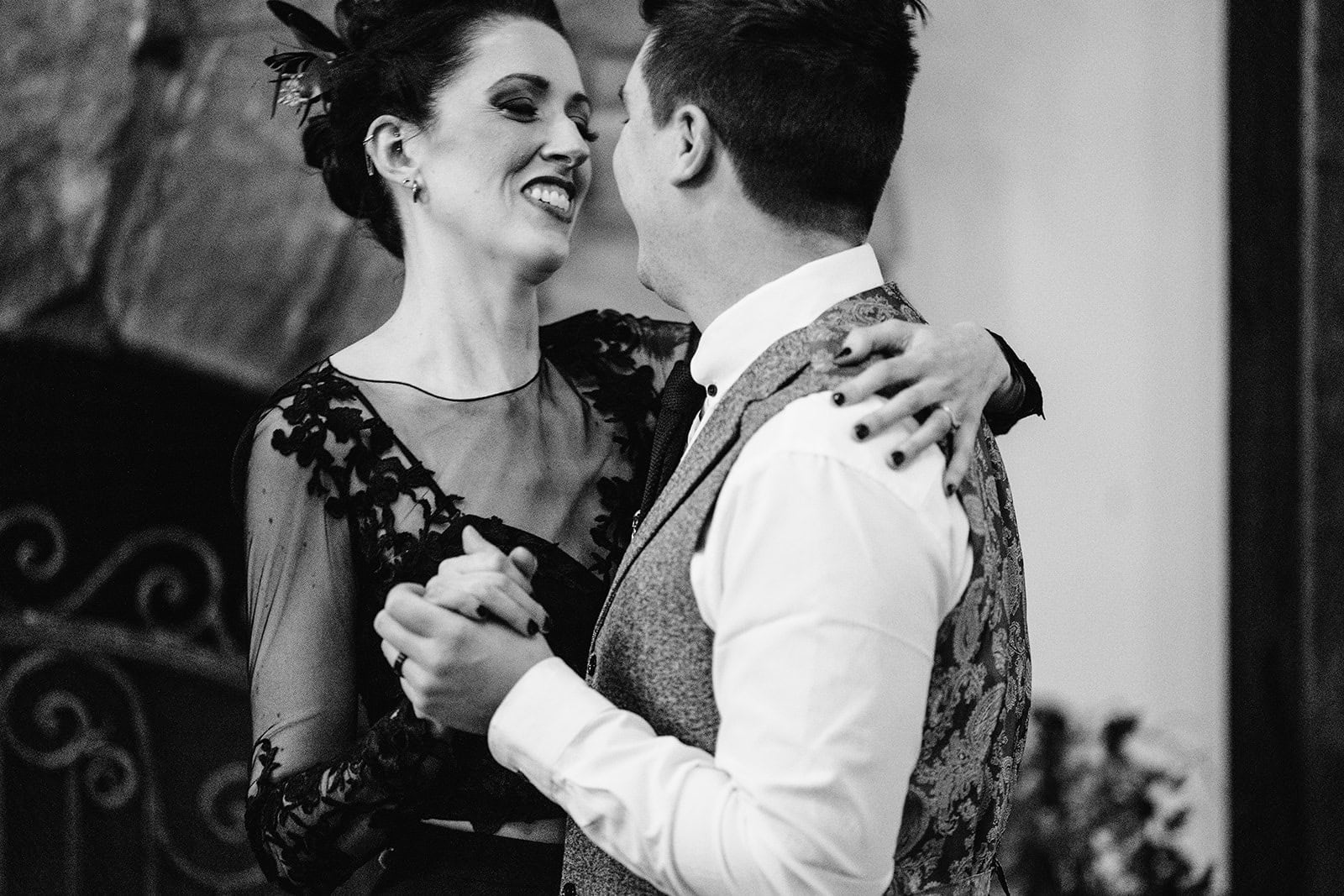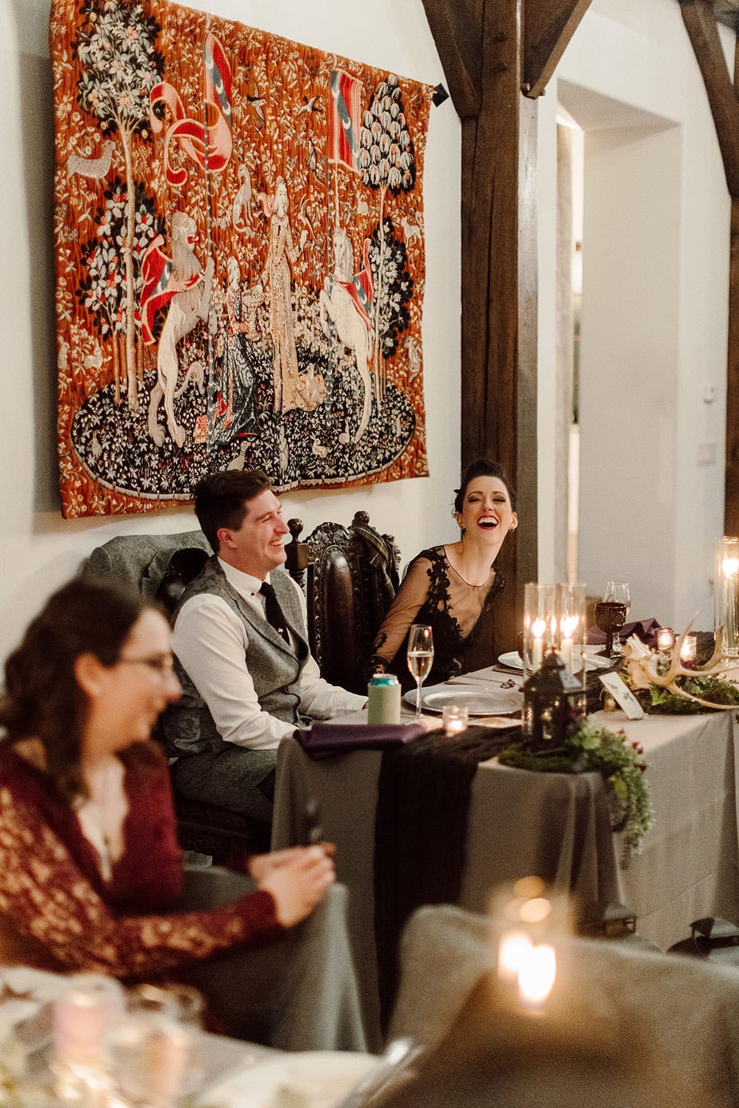 While an outdoor terrace ceremony had been the original plan, winter temperatures guided the event indoors to the castle’s Great Hall — a cozy, firelit space that perfectly suited Lisa + Gavin’s gothic-inspired aesthetic.