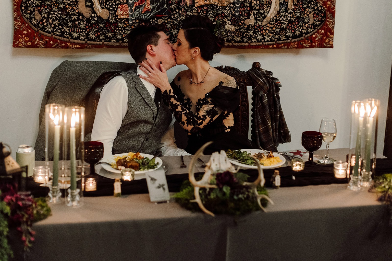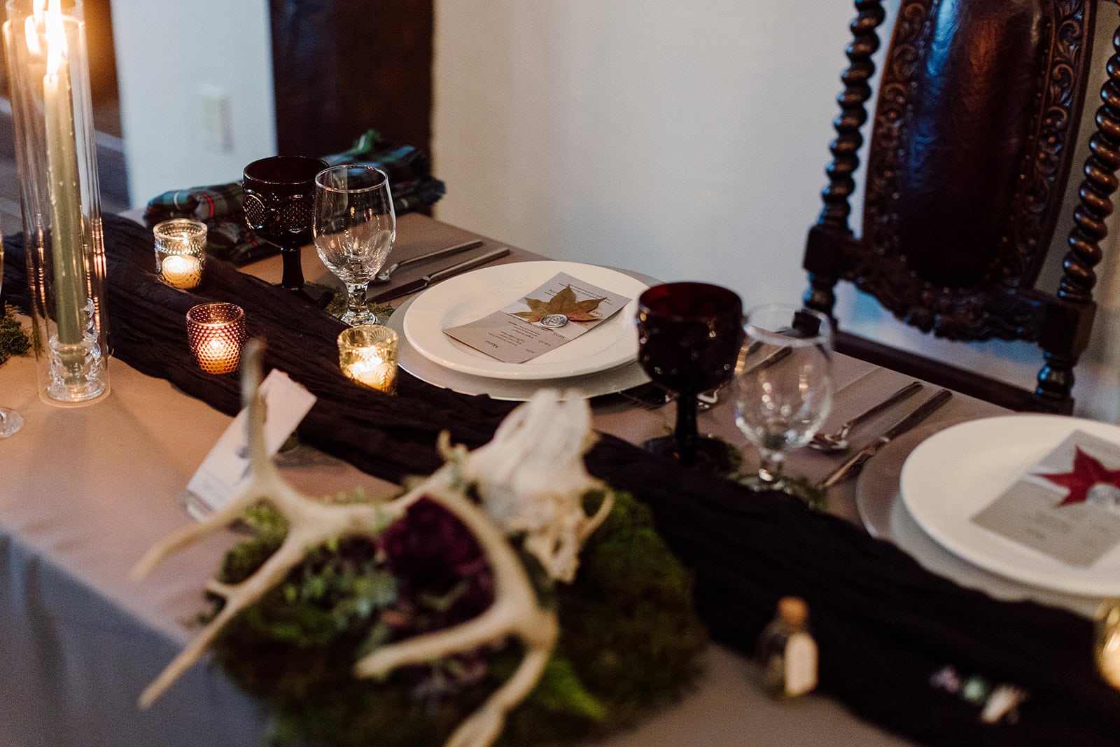 Castle Ladyhawke’s Great Hall was transformed into an enchanted space, thanks to Lisa’s thoughtful design work. Each element told a story: from vintage tarot card table numbers and hand-collected moss terrariums to a restored 1940s typewriter for guest messages.