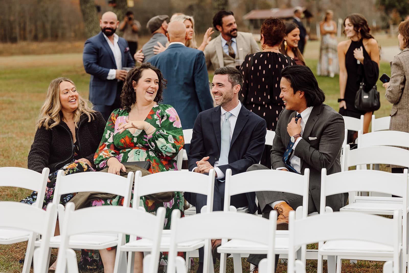 Back at Deerwoode Reserve, the ceremony took place at the venue’s on-site lake, a serene space that lent calm and gravity to the couple’s vows. Guests gathered beside the still water as Maraia walked down the aisle, with both of her parents at her side. The ceremony was filled with laughter, poignant reflection and heartfelt vows.