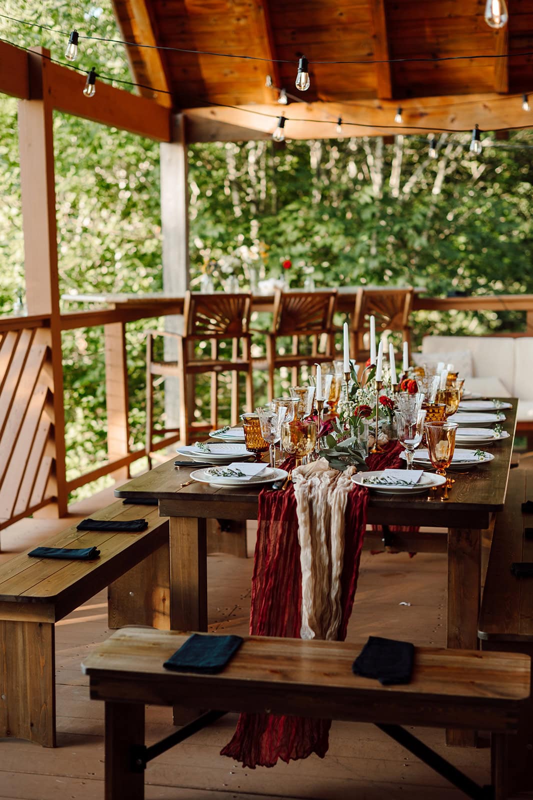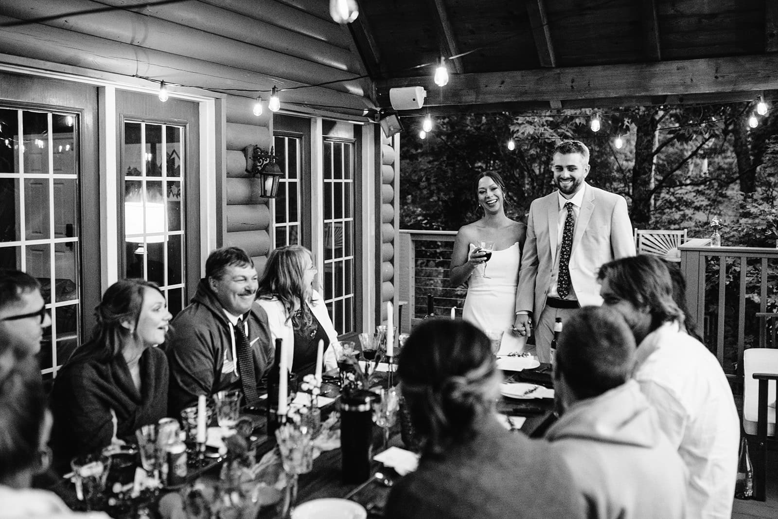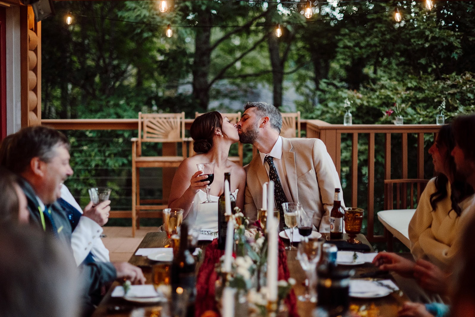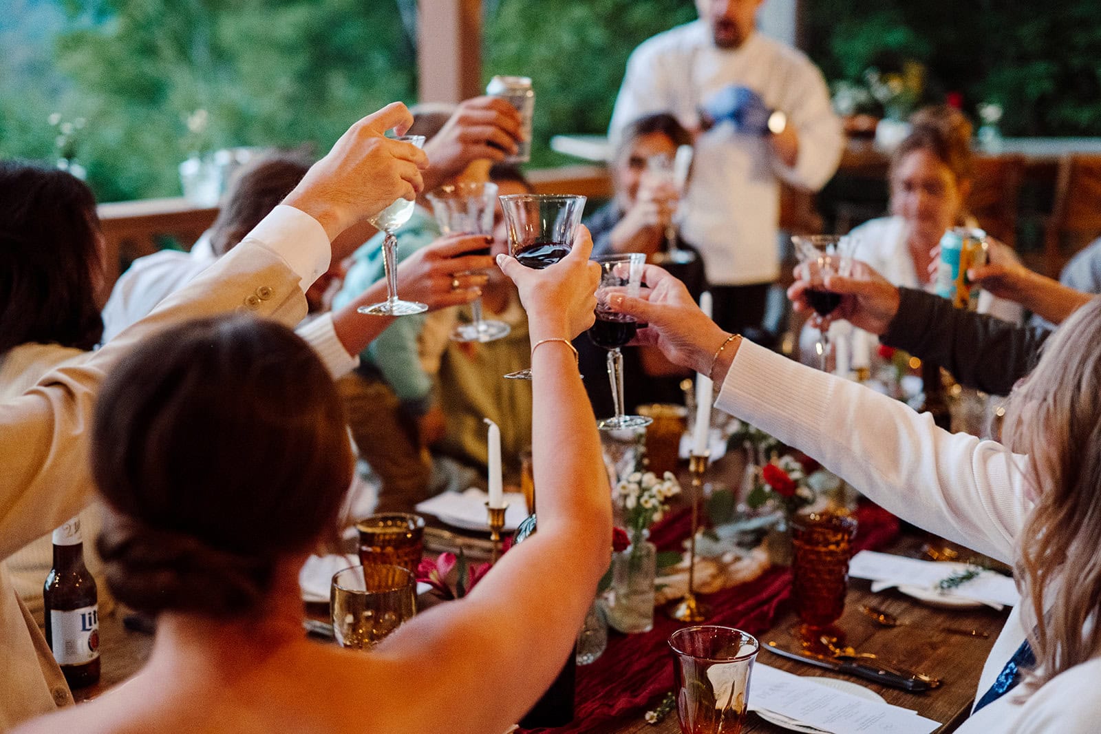 After the portraits, the group returned to the rental property for a cozy reception. The Mountain Garden Chef, Graham Overal, prepared a delicious dinner, and toasts were shared between courses, adding to the warmth of the evening. As the sun set, Morgan and Brent stepped outside for golden hour portraits, capturing the joy and serenity of their special day.
