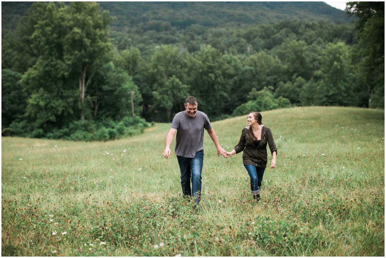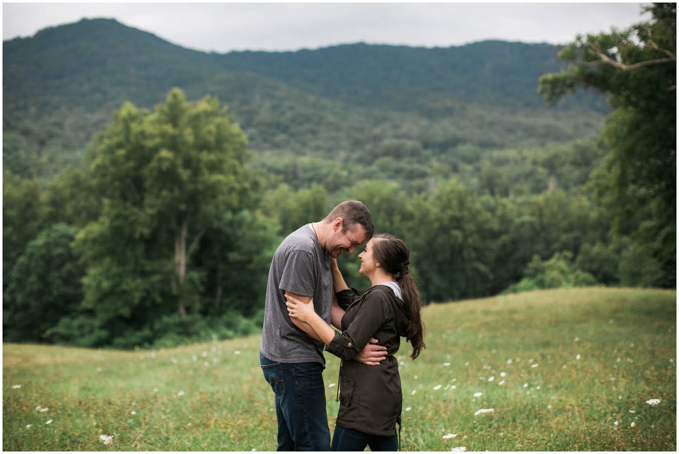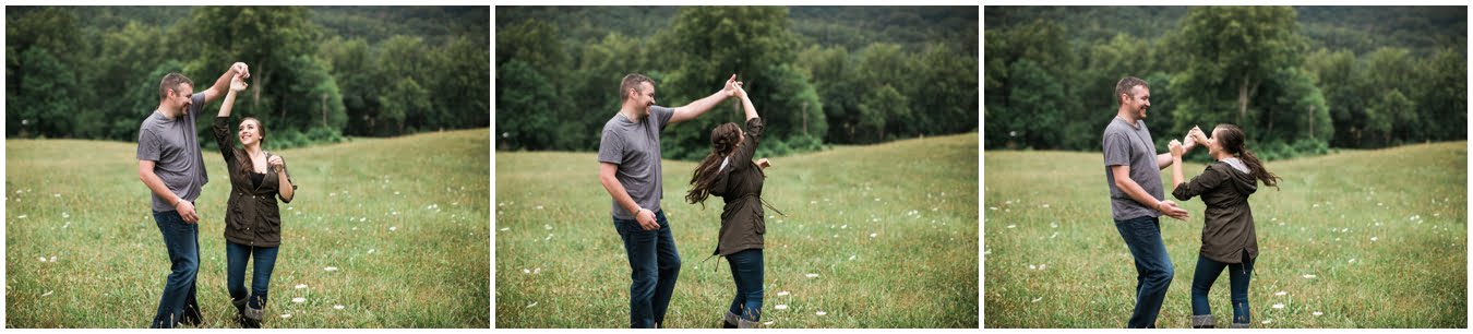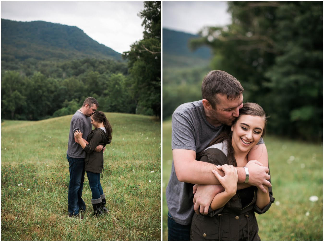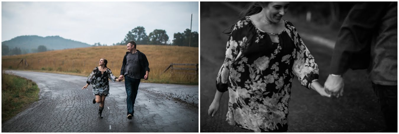 We had plans to hike up to a gorgeous bald, but as the shoot time grew closer and the clouds got thicker I made a game-time decision and we went instead to the family farm of a dear friend. You guys, I’m so glad we did. We couldn’t have timed the shoot better if we had tried! We got some time in a gorgeous field of wildflowers with the mountains behind, and JUST as we hopped in the car to drive to the barn, the skies opened up, giving us the perfect mood for some quiet portraits in the hayloft with the rain pattering on the roof. Just as we finished up there, the rain let up and mists began to rise from the fields, giving us some gorgeous, ethereal light to finish up the shoot with. The last few photos are my favorite…running from the rain as the skies opened up again just as we were done. This rainy engagement shoot is possibly one of my favorites this season!