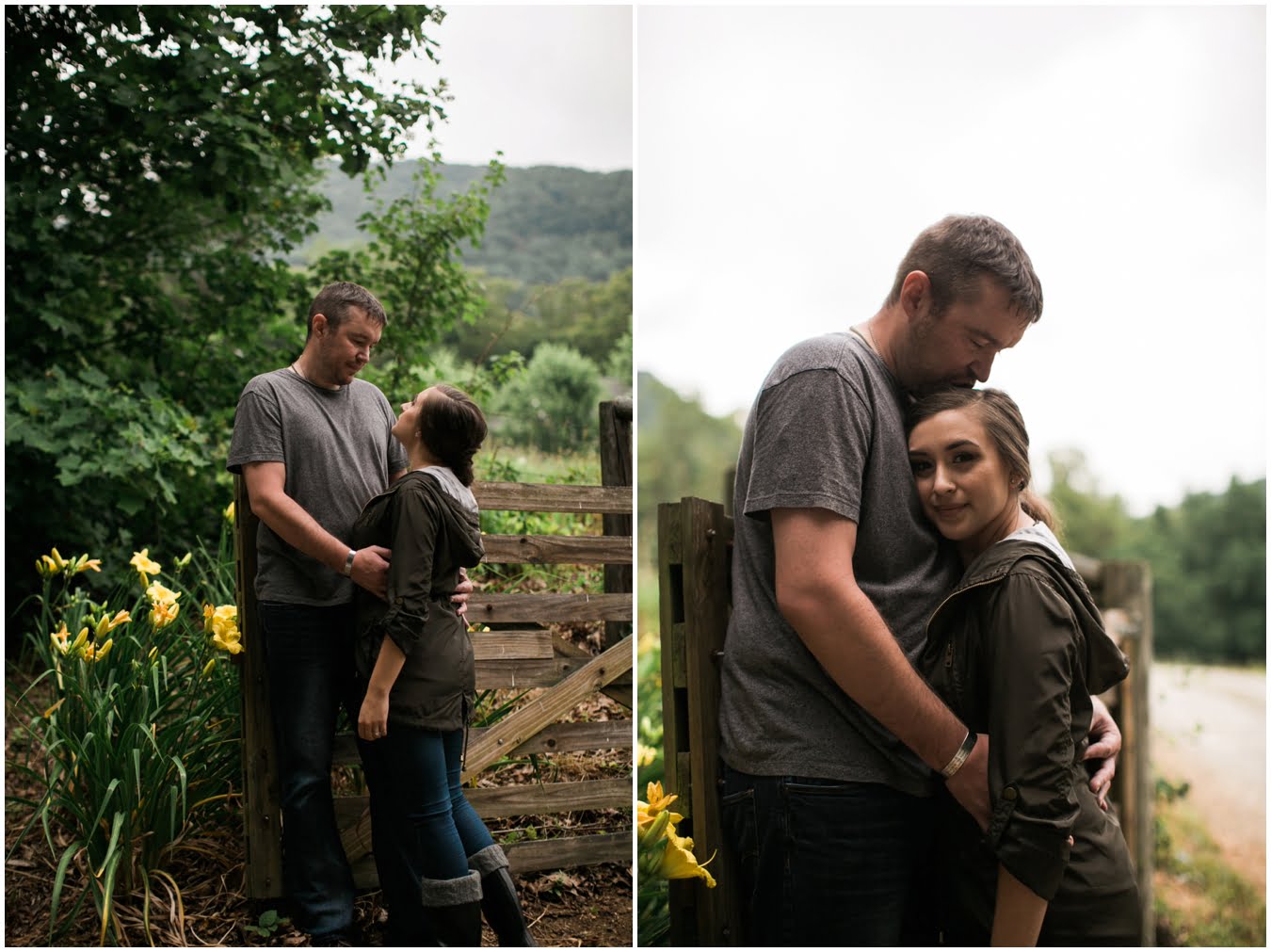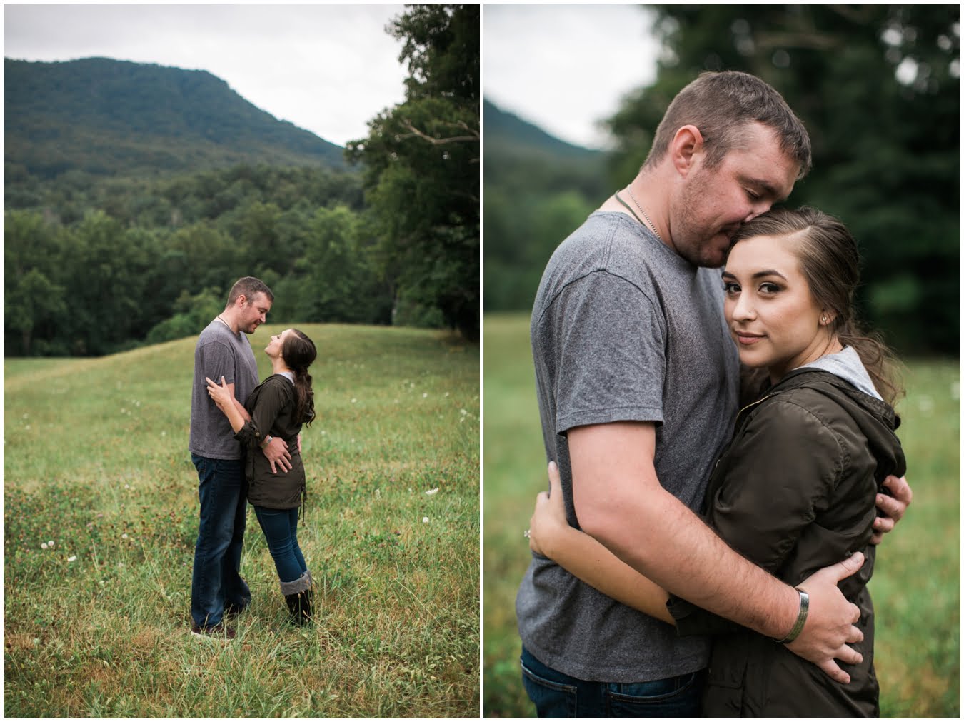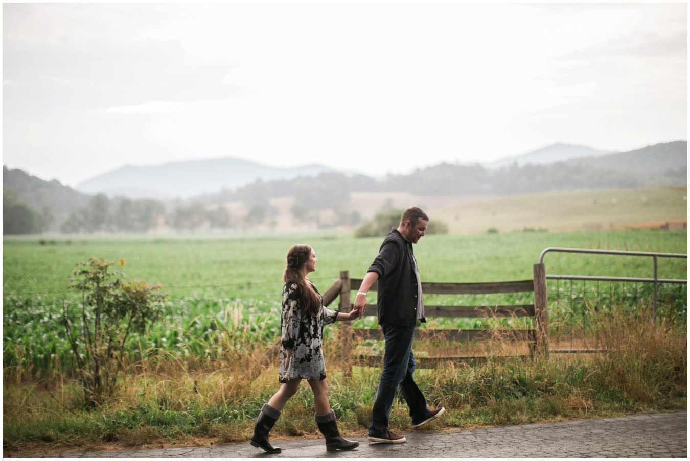 We had plans to hike up to a gorgeous bald, but as the shoot time grew closer and the clouds got thicker I made a game-time decision and we went instead to the family farm of a dear friend. You guys, I’m so glad we did. We couldn’t have timed the shoot better if we had tried! We got some time in a gorgeous field of wildflowers with the mountains behind, and JUST as we hopped in the car to drive to the barn, the skies opened up, giving us the perfect mood for some quiet portraits in the hayloft with the rain pattering on the roof. Just as we finished up there, the rain let up and mists began to rise from the fields, giving us some gorgeous, ethereal light to finish up the shoot with. The last few photos are my favorite…running from the rain as the skies opened up again just as we were done. This rainy engagement shoot is possibly one of my favorites this season!