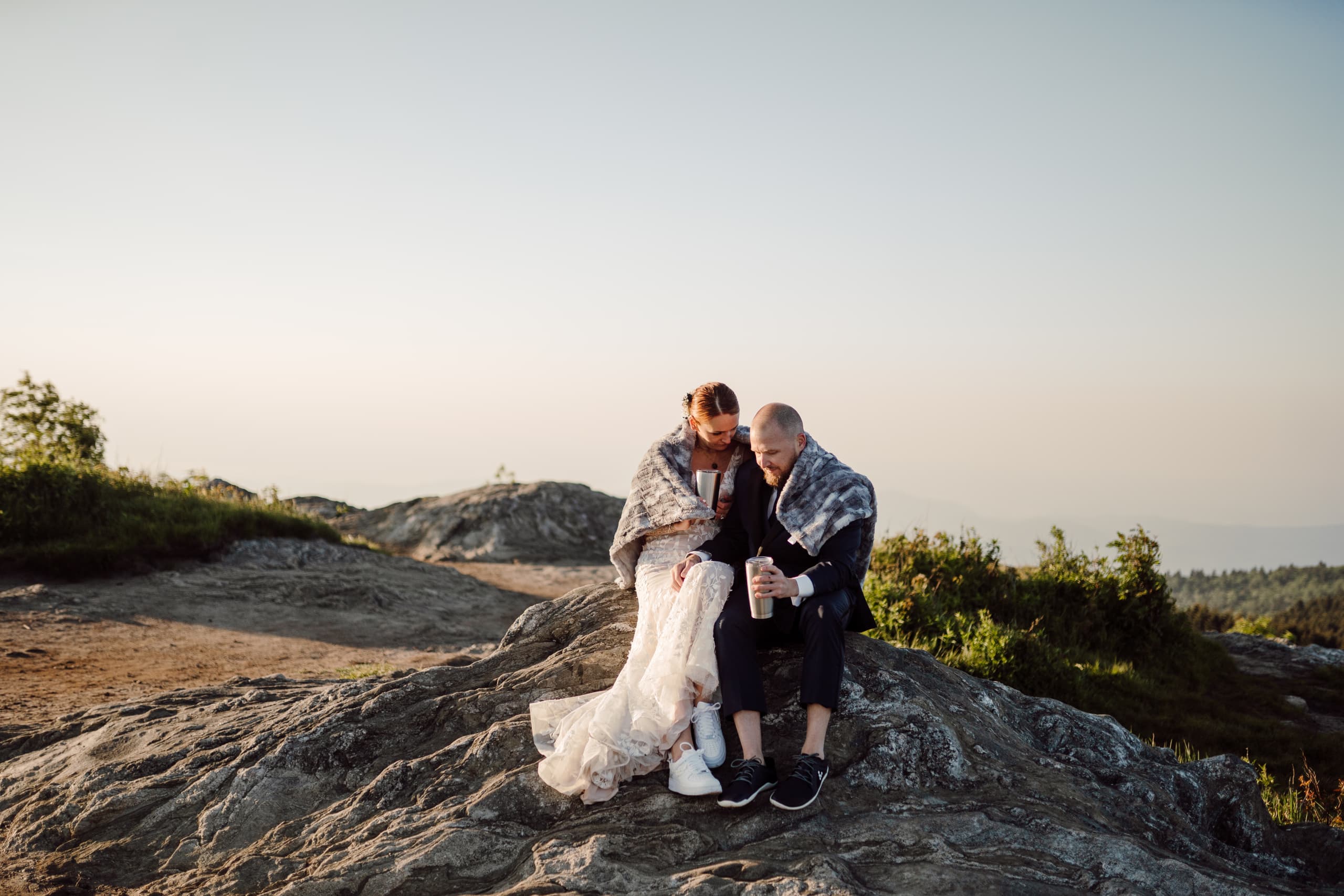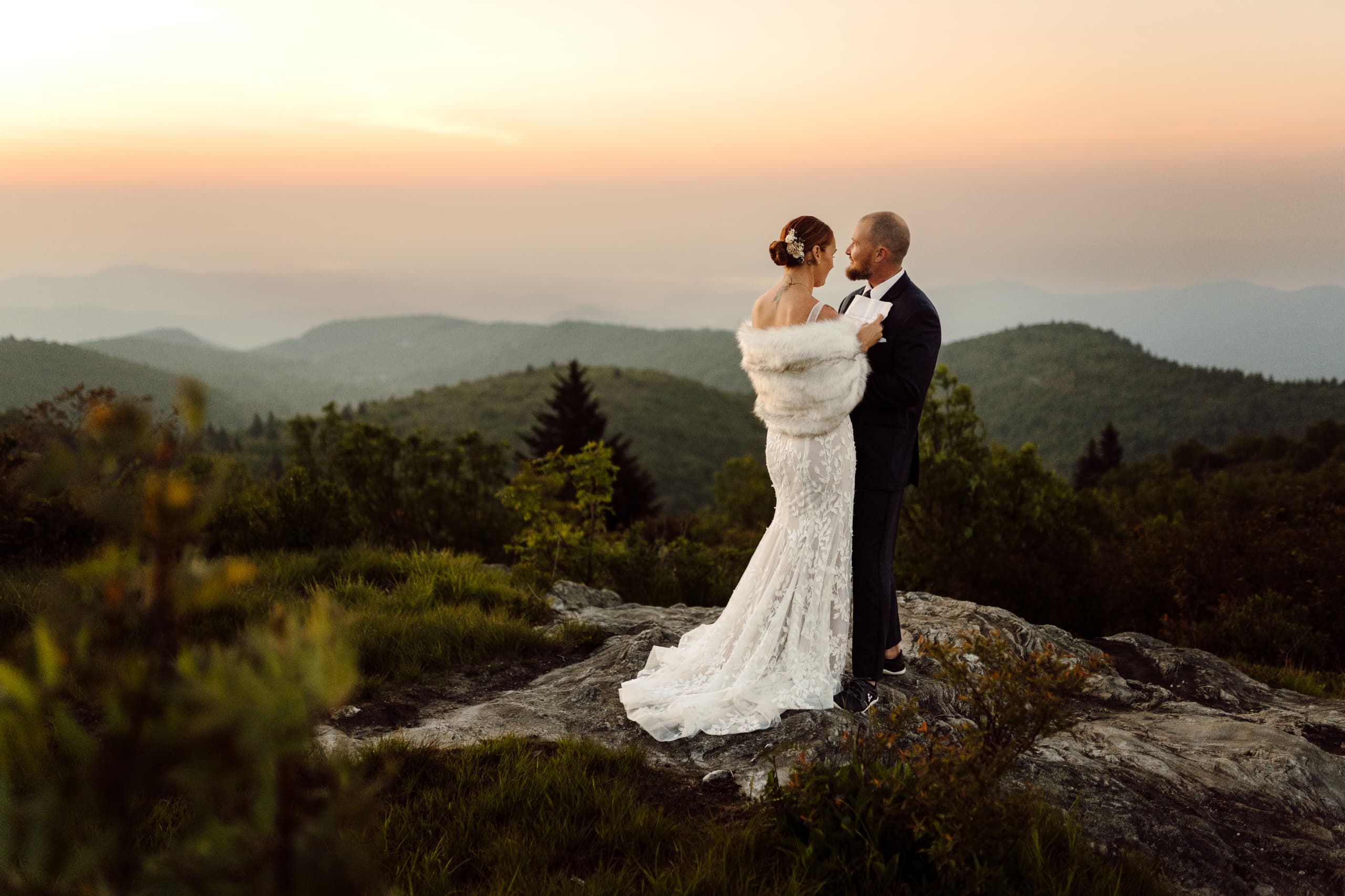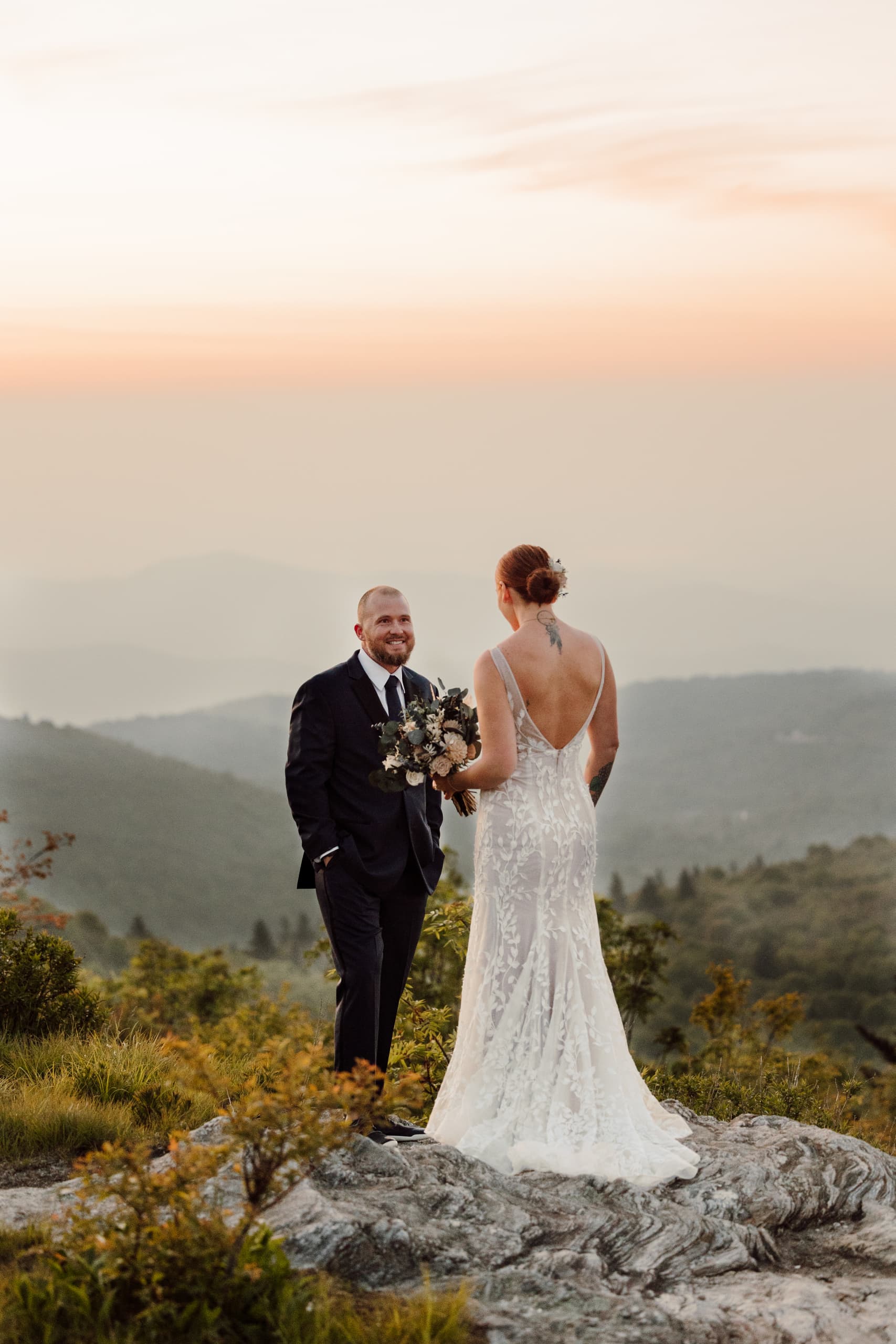 The day started off with Shea, Chris, and the whispering of the pines surrounding them. We met up at the Black Balsam Knob parking lot, the early morning air crisp and promising. With headlamps guiding the way, we embarked on a journey towards the summit. As the sky began to paint itself with the first brushstrokes of dawn, the couple changed into their wedding attire, eager for the day ahead. Shea, a talented hair stylist, had done her own hair and makeup for the occasion! The sunrise moment was breathtaking, filled with genuine emotions as they shared their first look against the backdrop of the sprawling Western NC mountains. After the sun had risen, they enjoyed coffee on a campstove we prepared for them as they soaked in the moment and connected with each other before the day ahead.