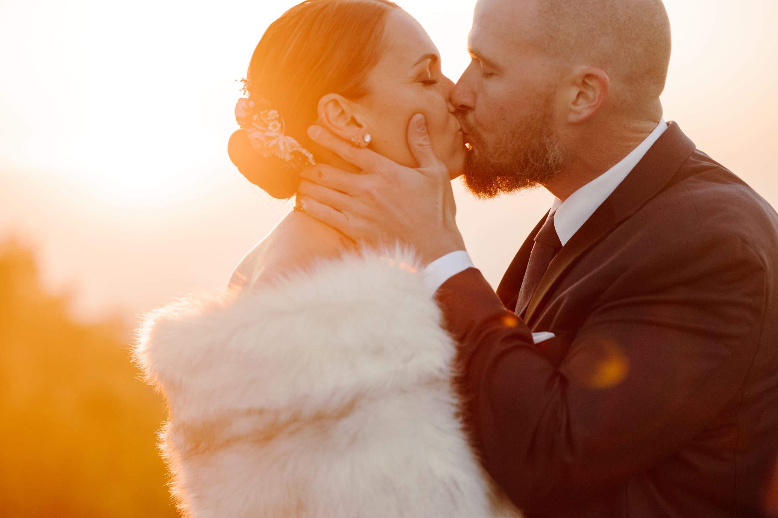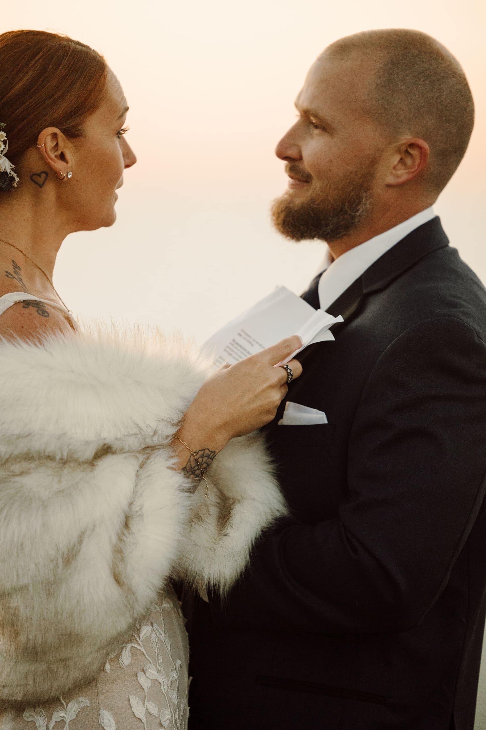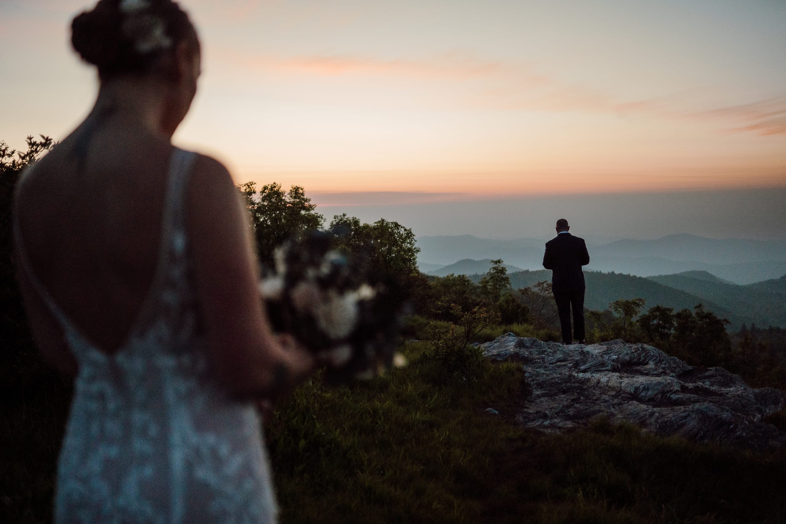 The day started off with Shea, Chris, and the whispering of the pines surrounding them. We met up at the Black Balsam Knob parking lot, the early morning air crisp and promising. With headlamps guiding the way, we embarked on a journey towards the summit. As the sky began to paint itself with the first brushstrokes of dawn, the couple changed into their wedding attire, eager for the day ahead. Shea, a talented hair stylist, had done her own hair and makeup for the occasion! The sunrise moment was breathtaking, filled with genuine emotions as they shared their first look against the backdrop of the sprawling Western NC mountains. After the sun had risen, they enjoyed coffee on a campstove we prepared for them as they soaked in the moment and connected with each other before the day ahead.