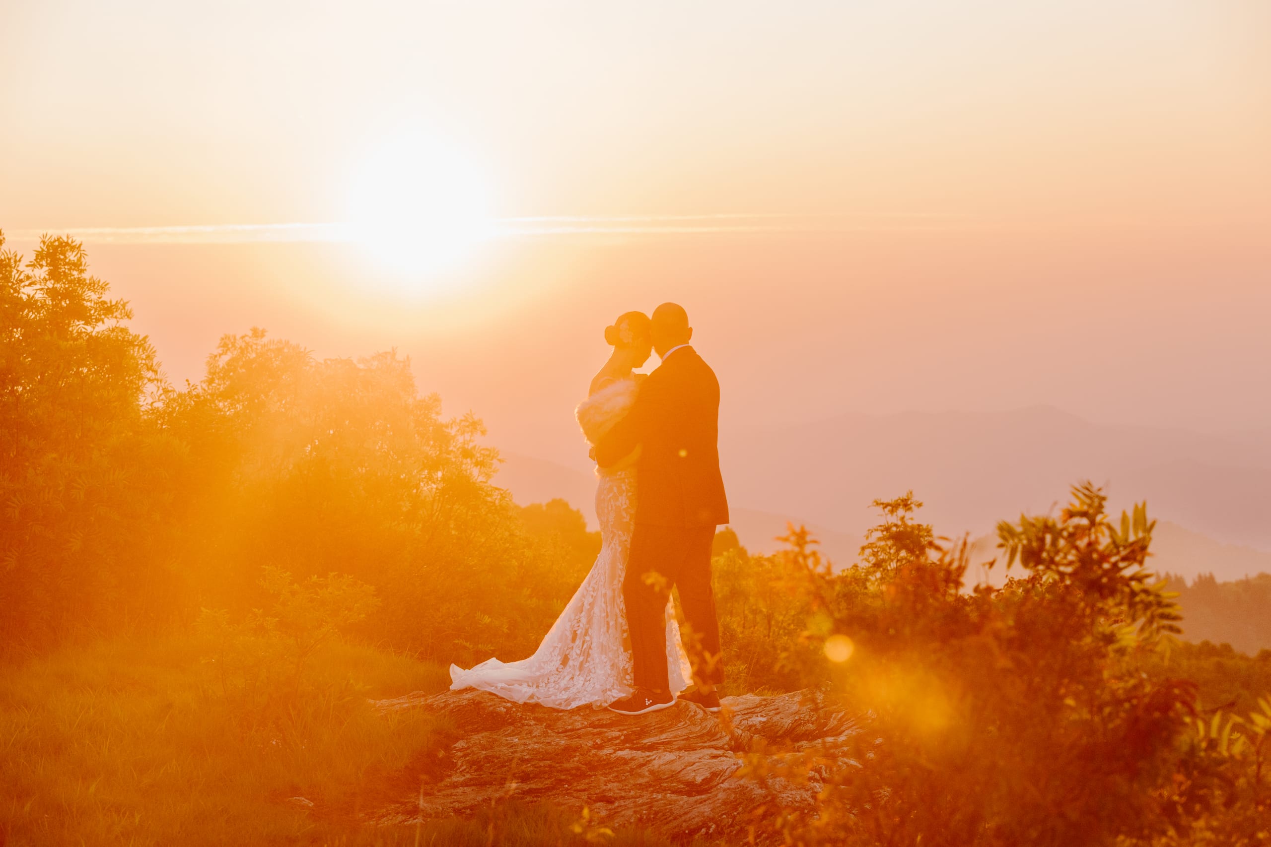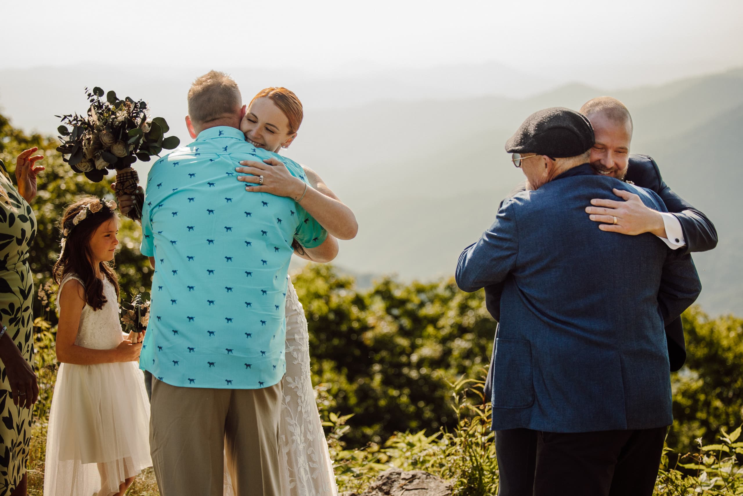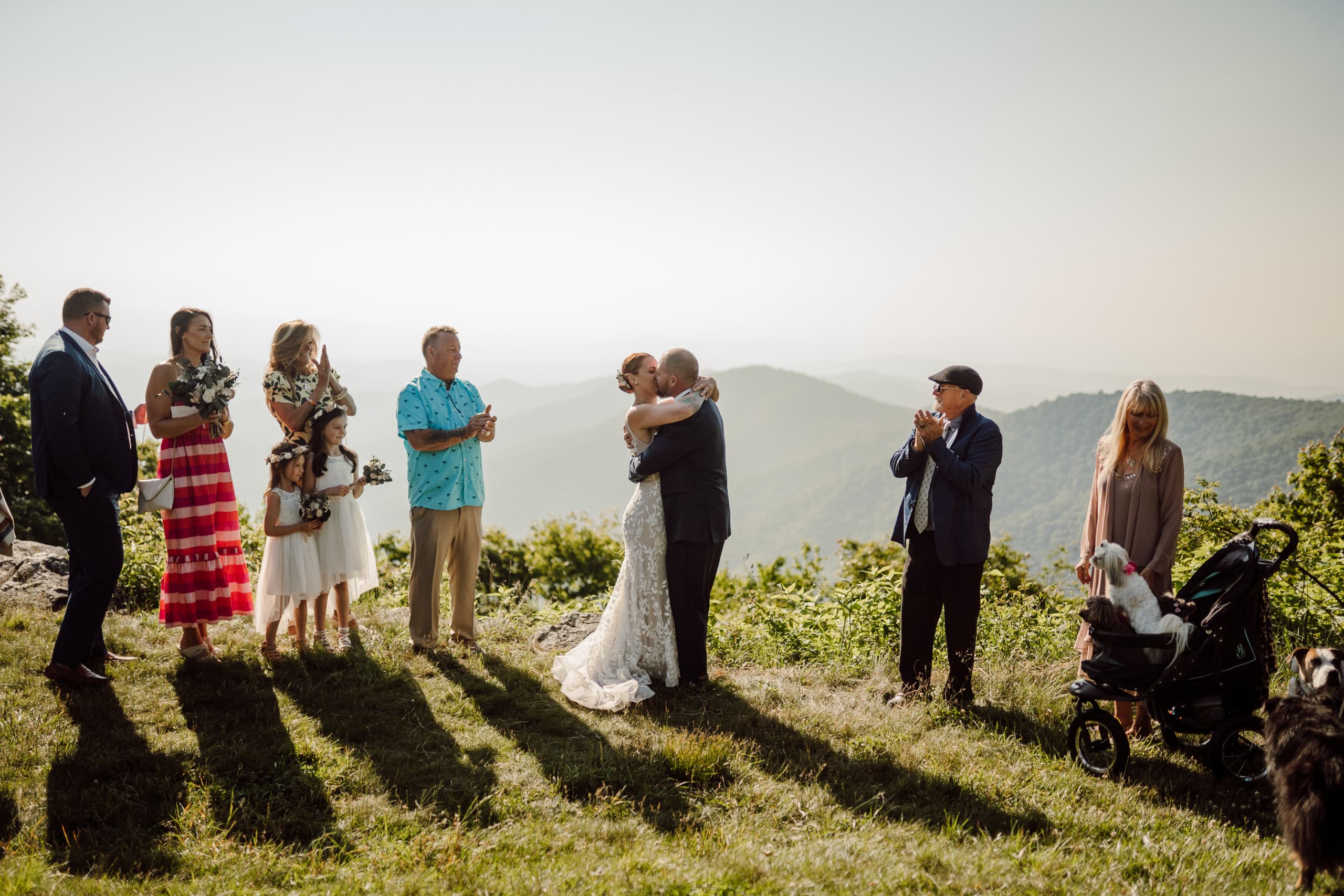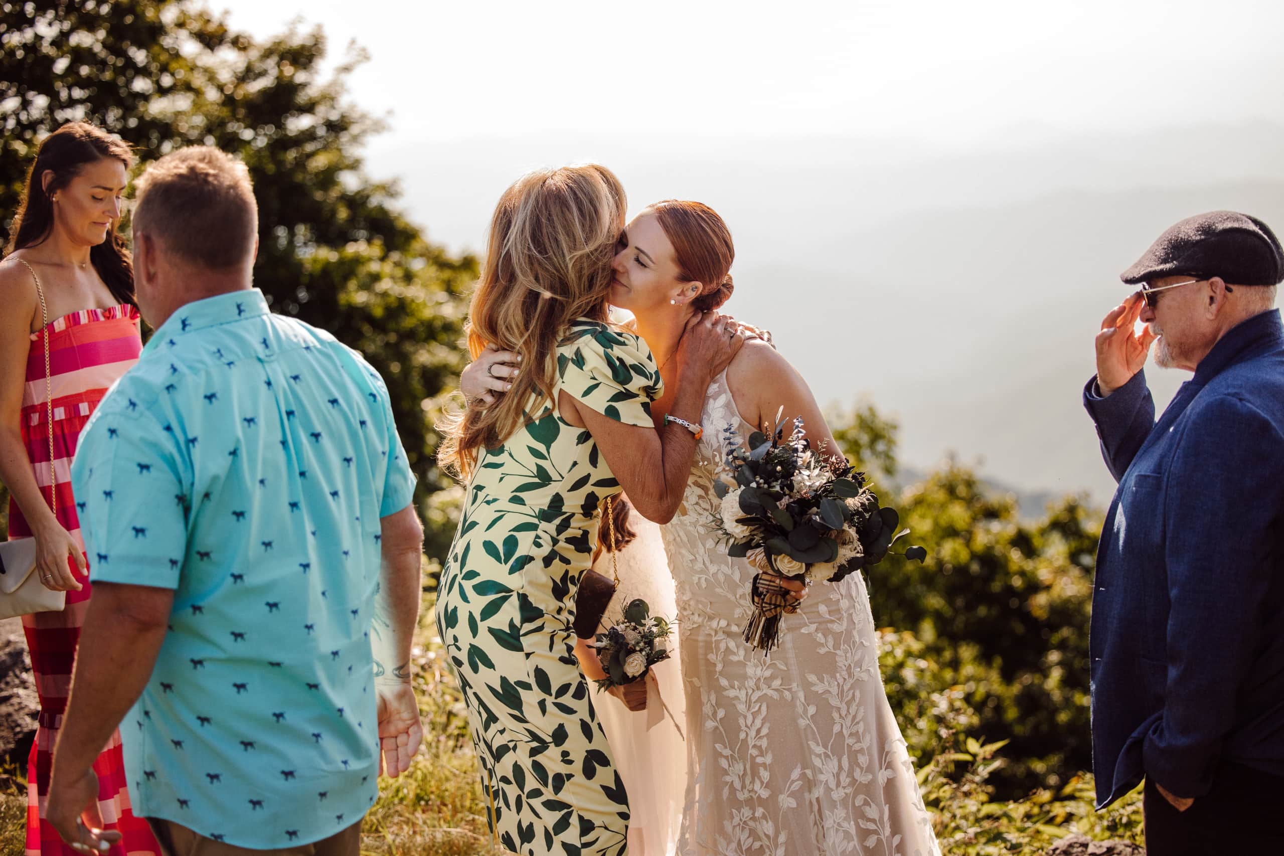 After their coffee, we hiked back down and headed to an overlook further down the Blue Ridge Parkway where their closest family and friends were waiting for them. Surrounded by their nearest and dearest and the sweeping views of the mountains, the two exchanged their heartfelt vows and were officially married! The joy was palpable – hugs, tears, laughter, and a champagne pop with a refreshing mimosa toast to celebrate the union.