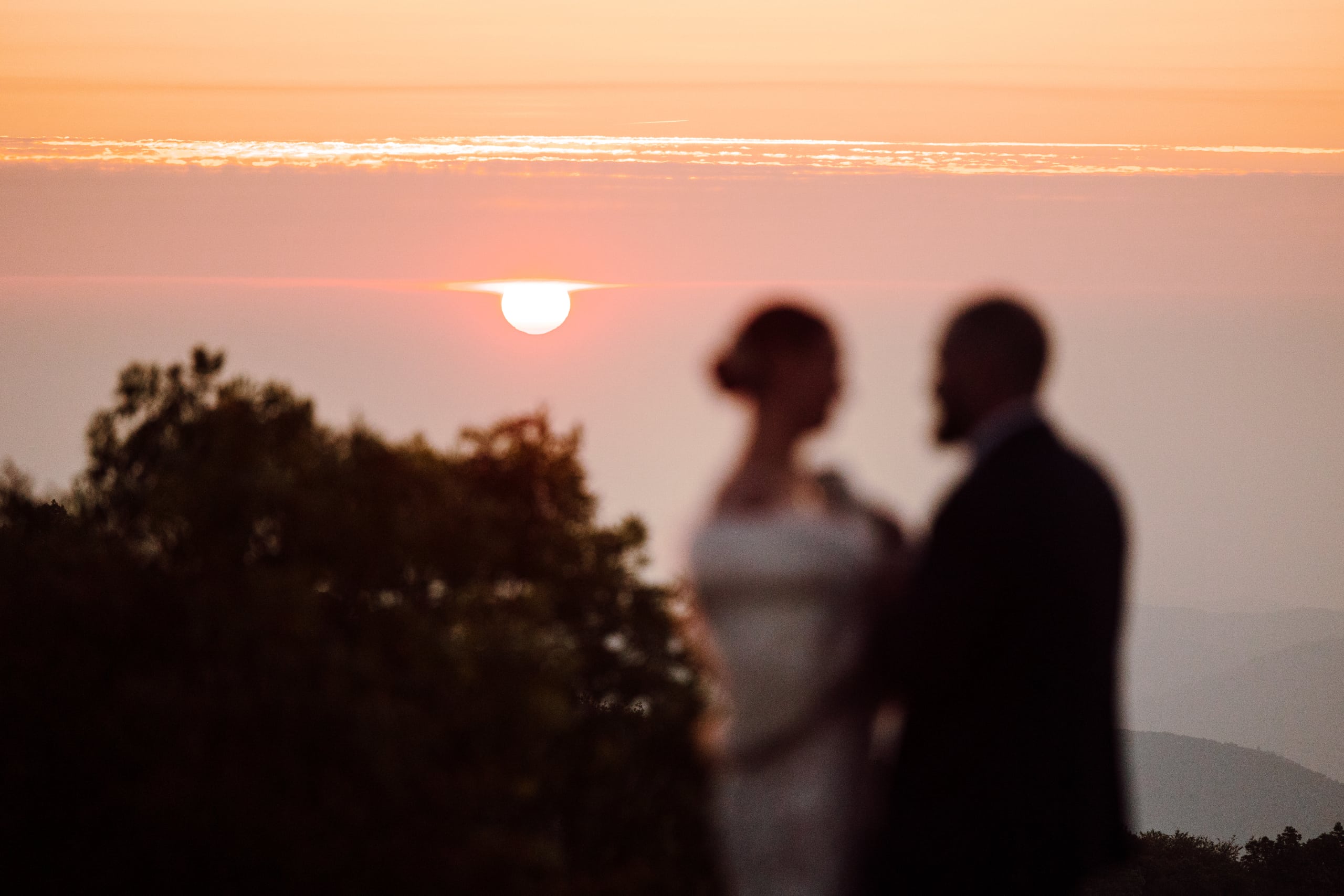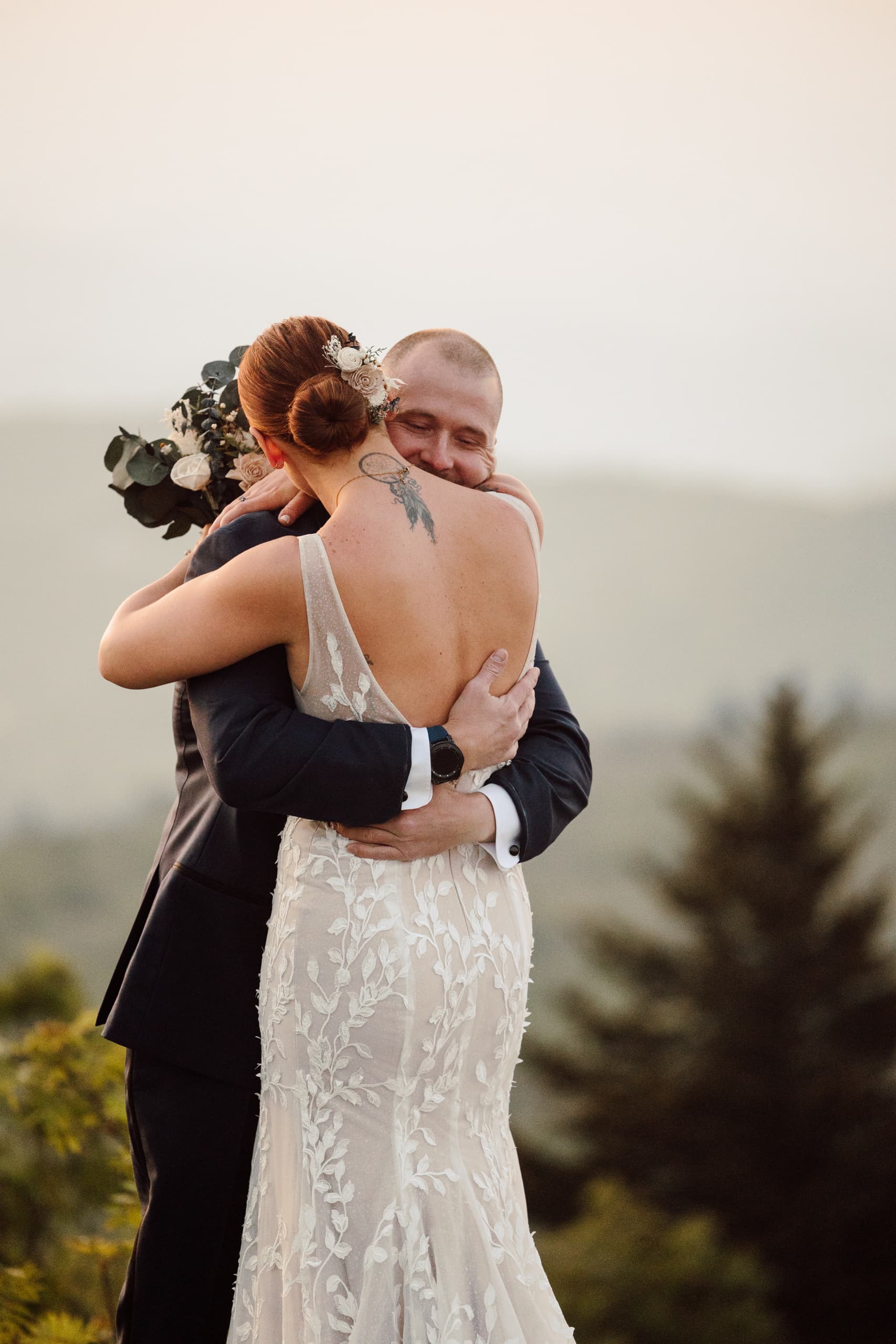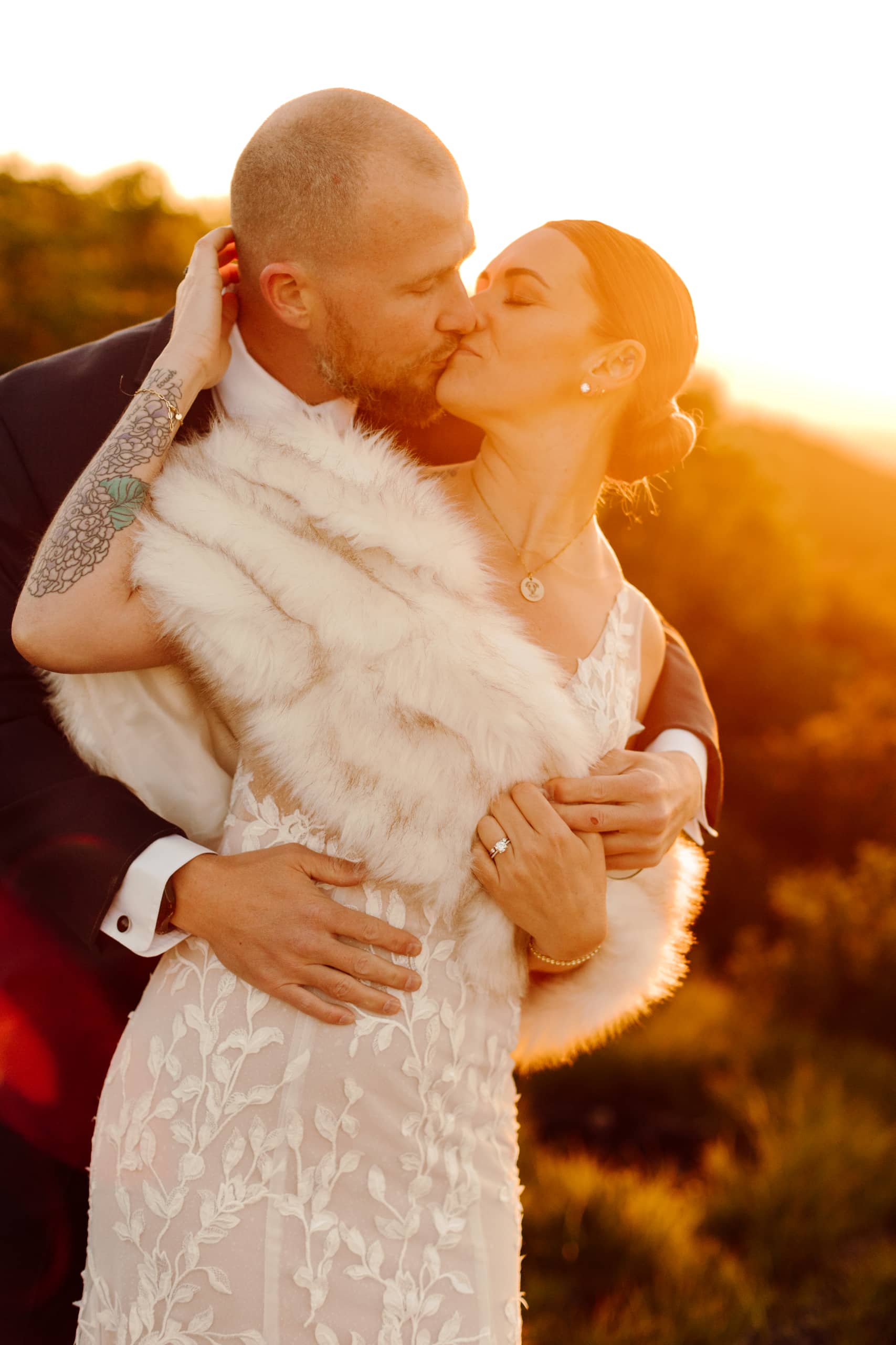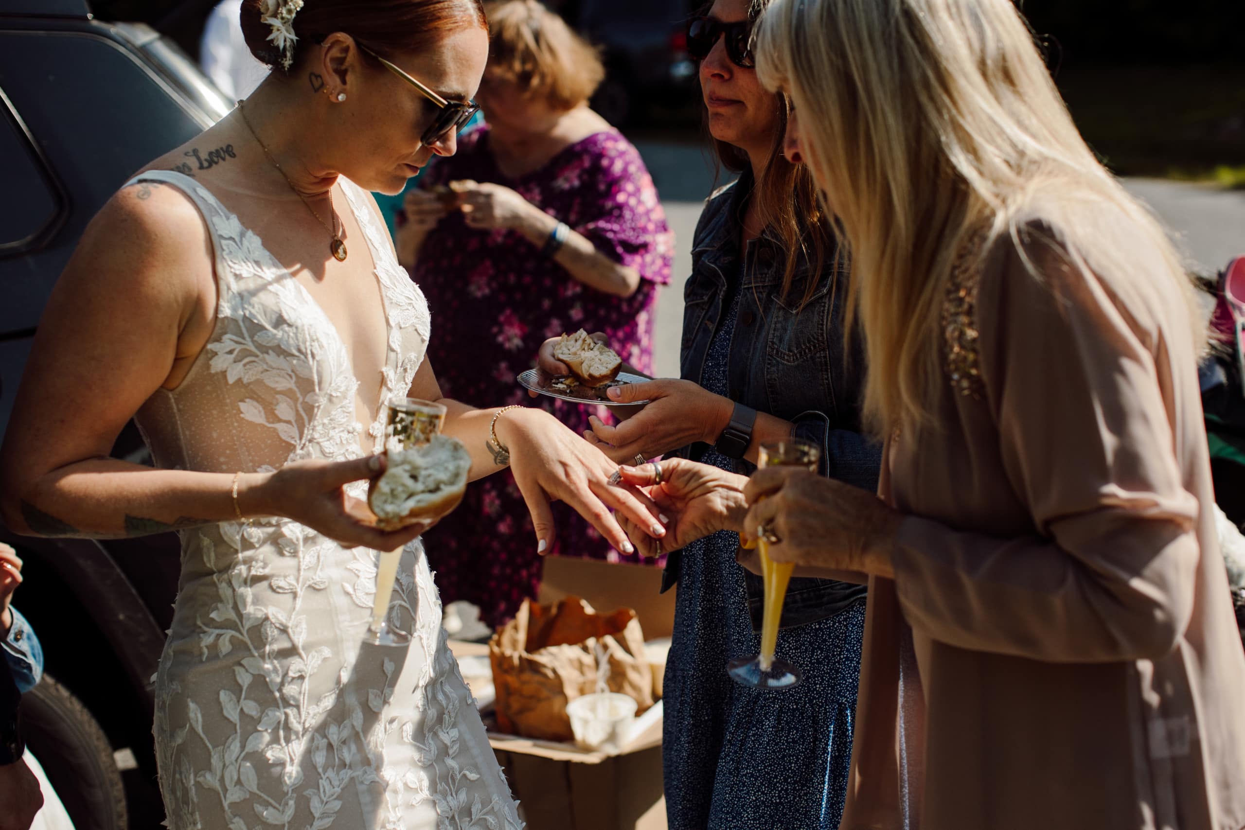 After their coffee, we hiked back down and headed to an overlook further down the Blue Ridge Parkway where their closest family and friends were waiting for them. Surrounded by their nearest and dearest and the sweeping views of the mountains, the two exchanged their heartfelt vows and were officially married! The joy was palpable – hugs, tears, laughter, and a champagne pop with a refreshing mimosa toast to celebrate the union.