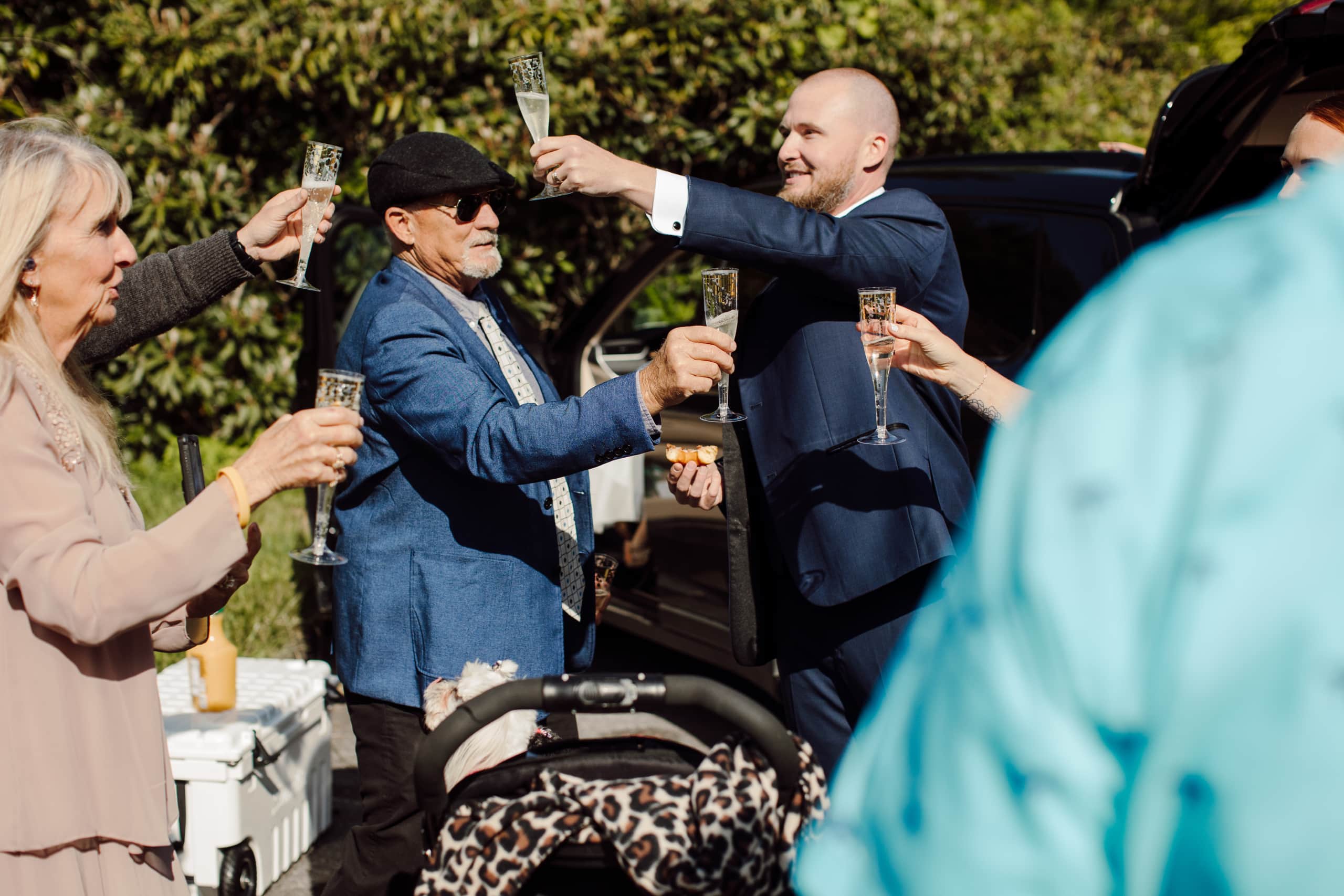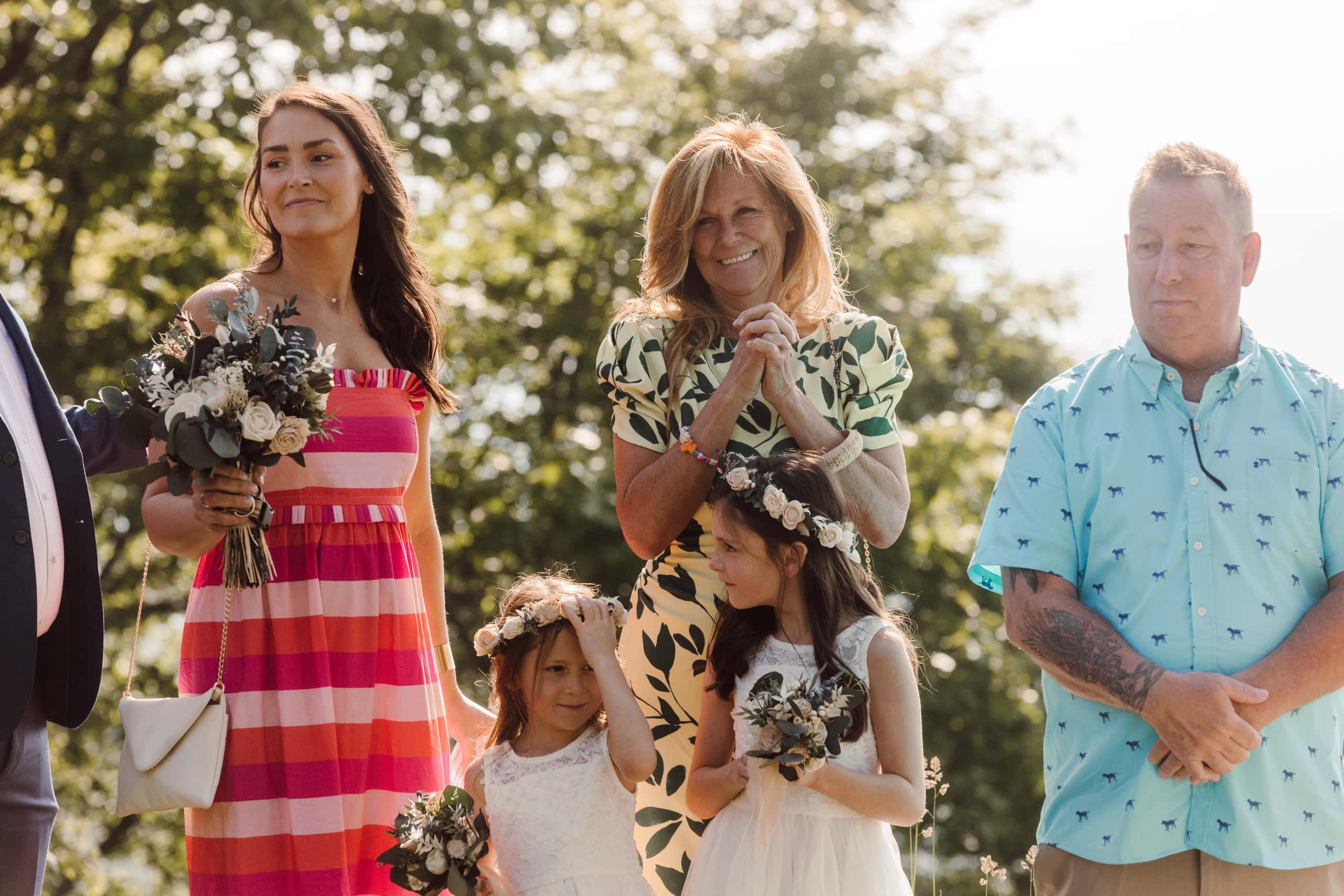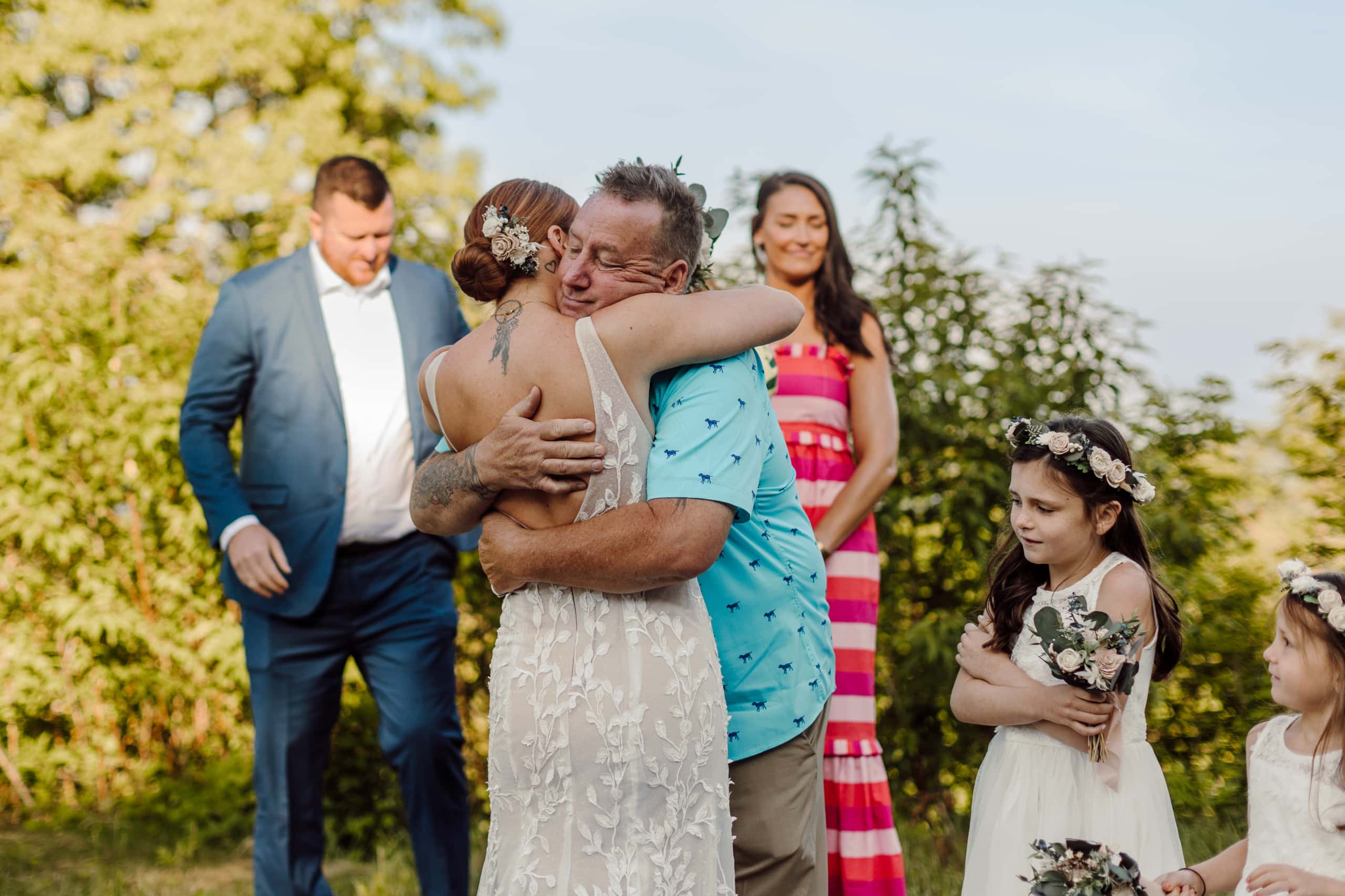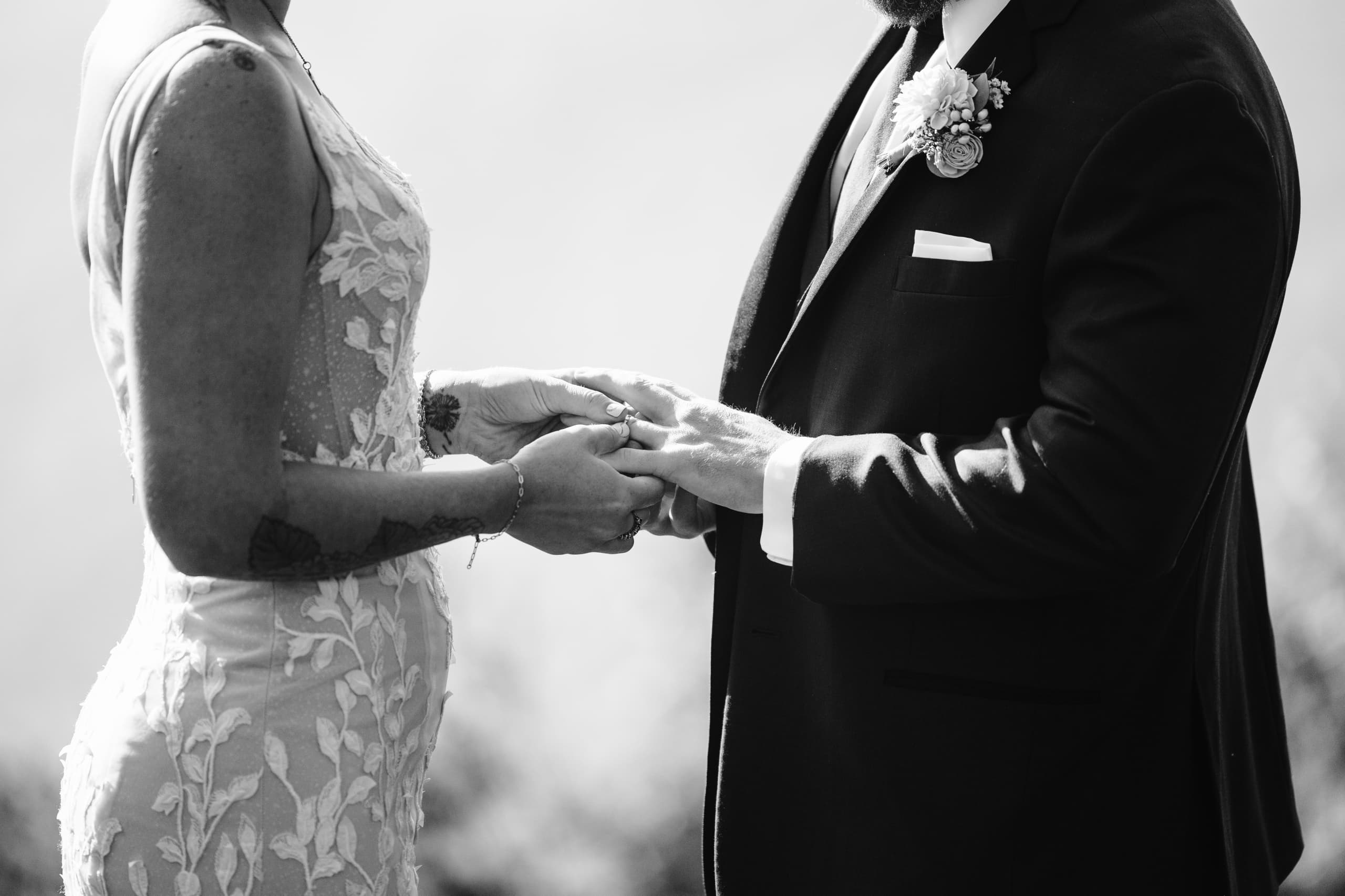 After their coffee, we hiked back down and headed to an overlook further down the Blue Ridge Parkway where their closest family and friends were waiting for them. Surrounded by their nearest and dearest and the sweeping views of the mountains, the two exchanged their heartfelt vows and were officially married! The joy was palpable – hugs, tears, laughter, and a champagne pop with a refreshing mimosa toast to celebrate the union.